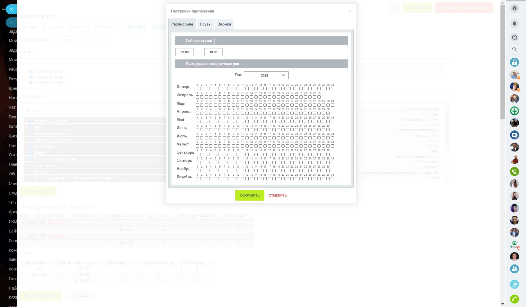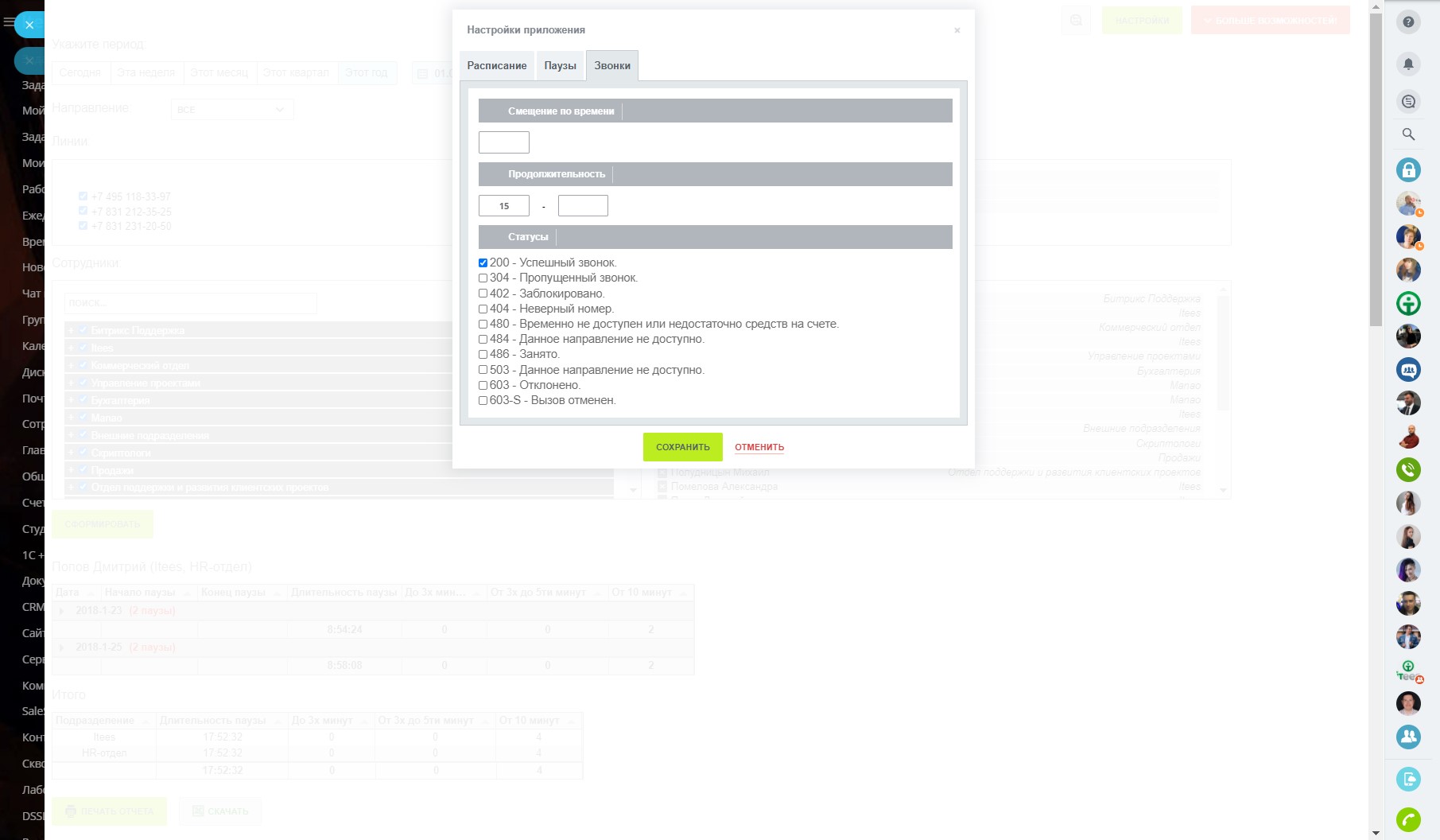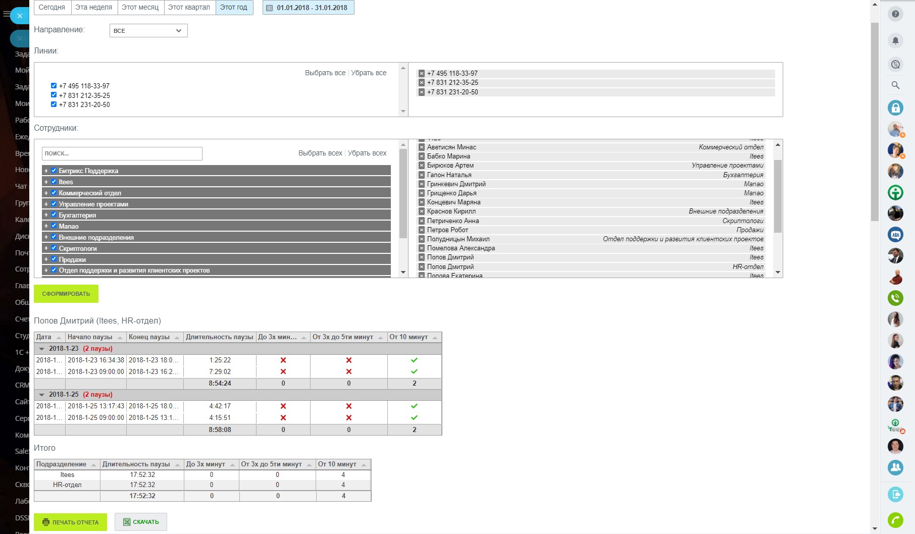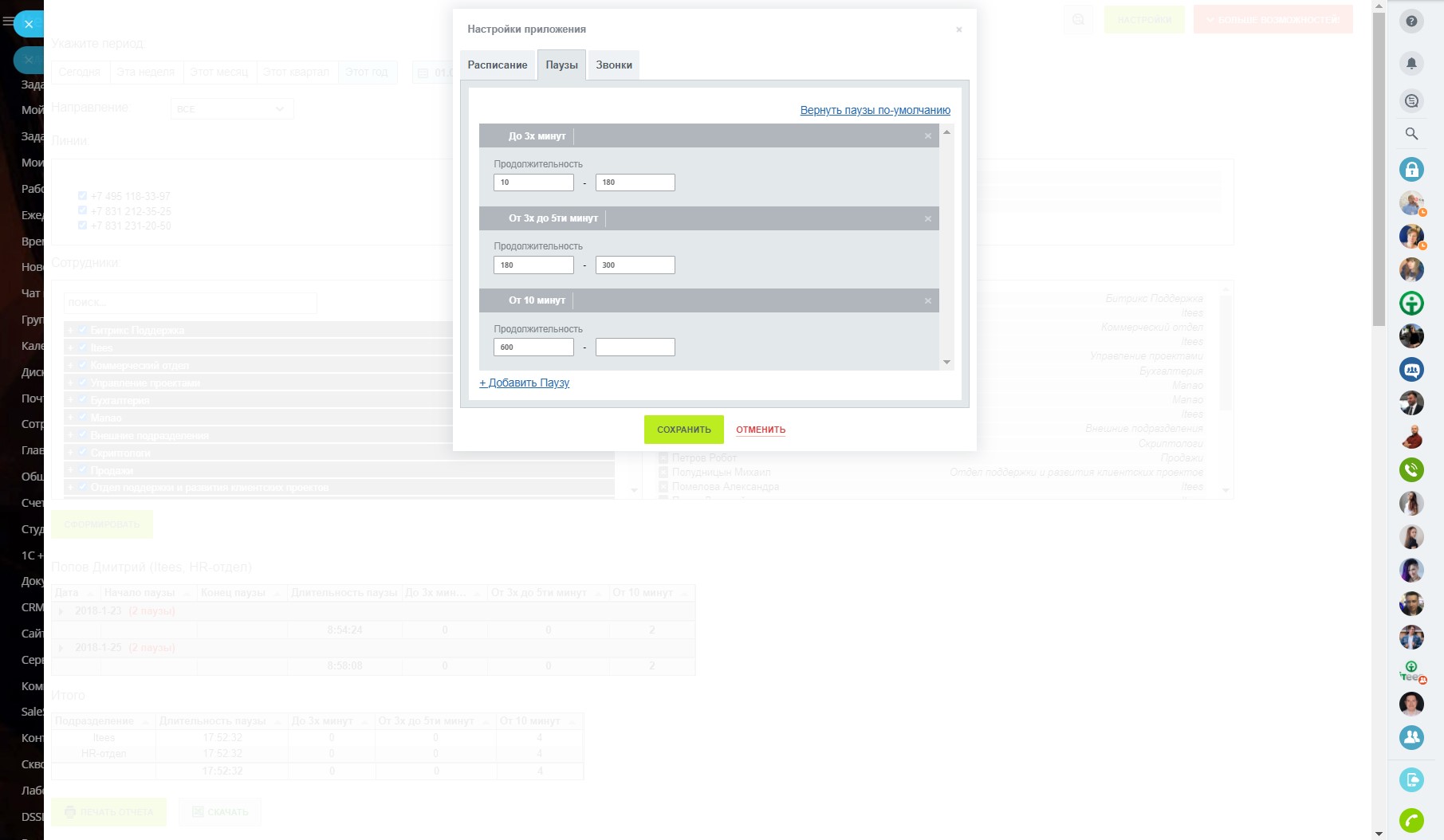 Приложение «Отчет по паузам» позволяет Вам формировать отчеты по количеству и длительности пауз между звонками каждого конкретного сотрудника и подразделения Вашей компании.
