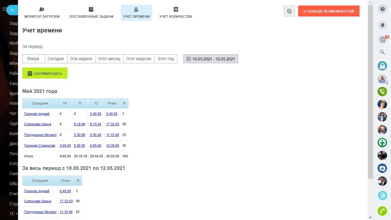 Позволяет анализировать затраты времени сотрудников по задачам.