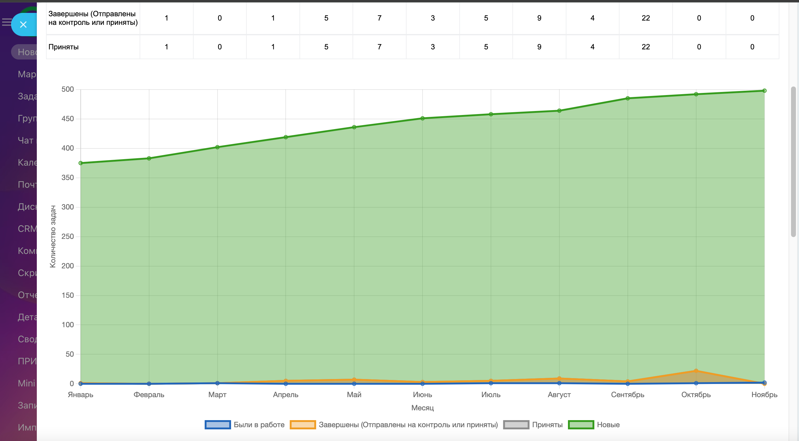 - Приняты - количество задач, которые были приняты в анализируемом месяце.