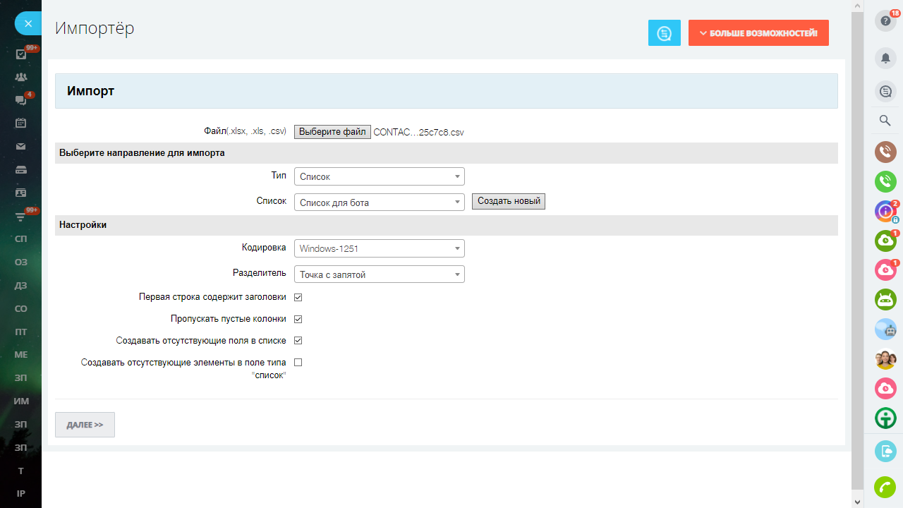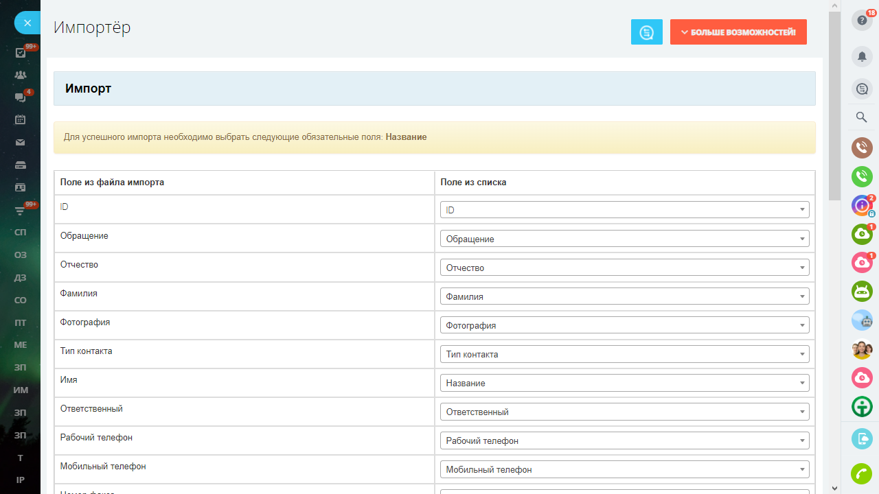 Сопоставить столбцы импортируемого файла и поля из CRM.