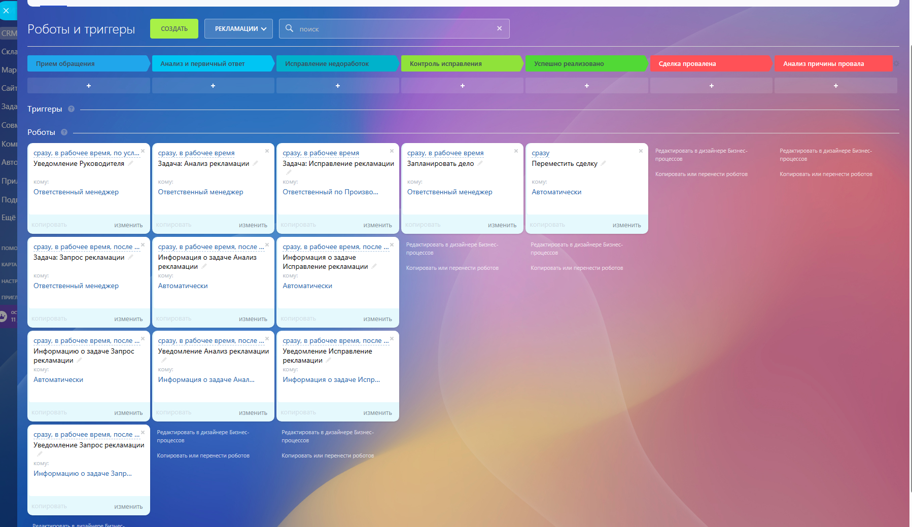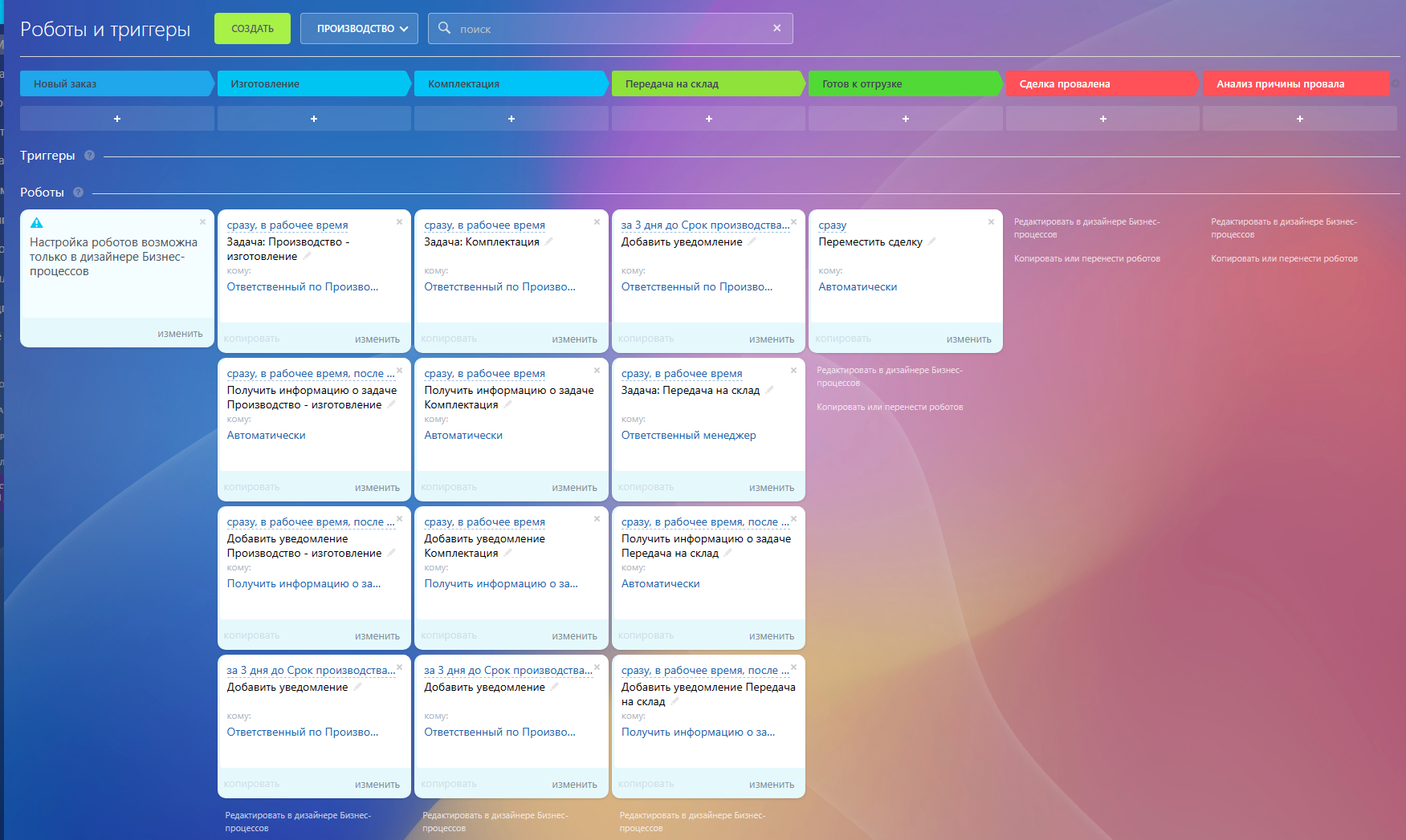 Например: Перенос сделки в Воронки Производство и Рекламации из воронки Обработка заказа