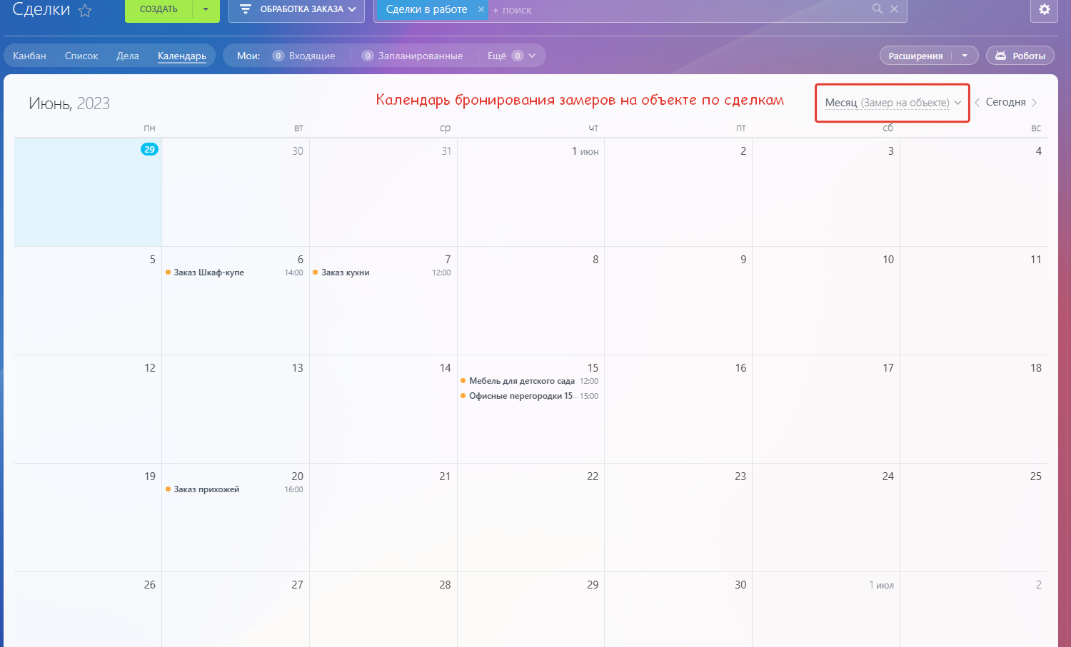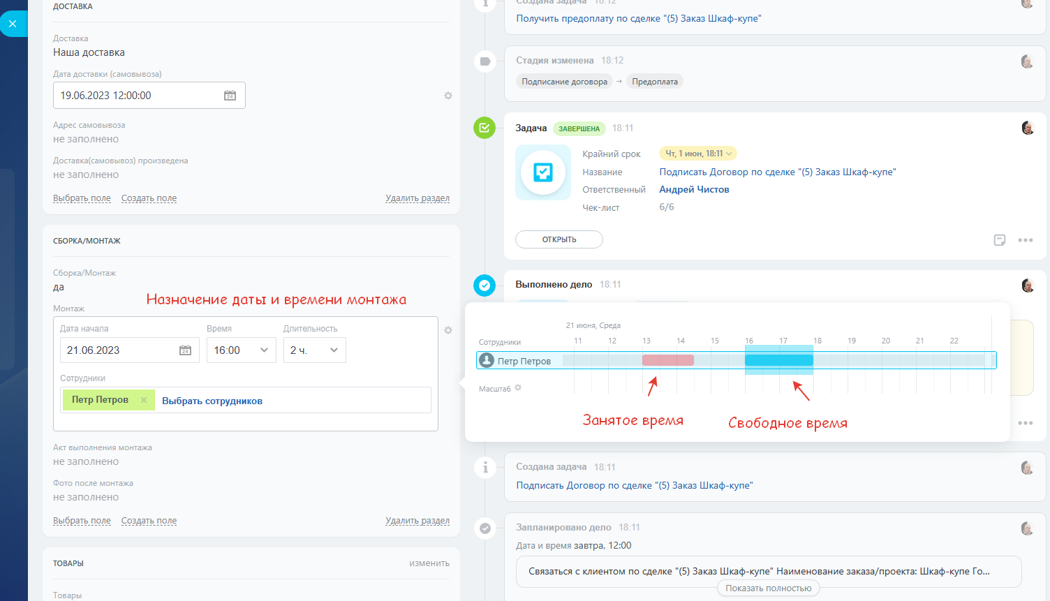 - Использование системы бронирования услуг (замеры, монтаж) позволит исключить вероятность ошибки назначения выезда одного и того же сотрудника (замерщика или сборщика-монтажника) на одно и тоже время разным клиентам по разным адресам.