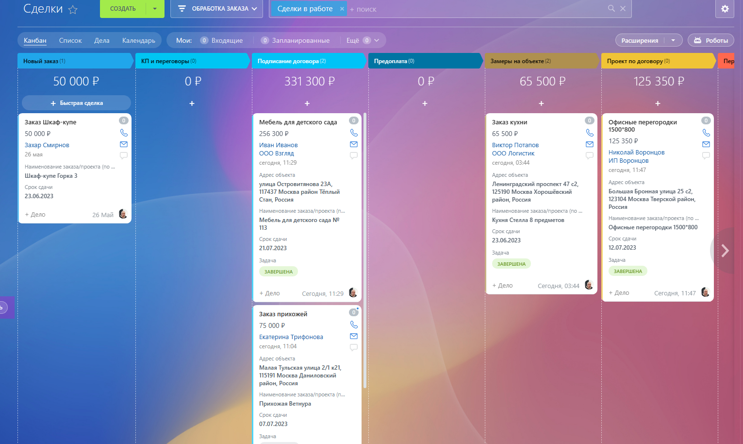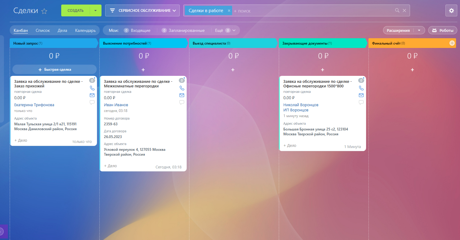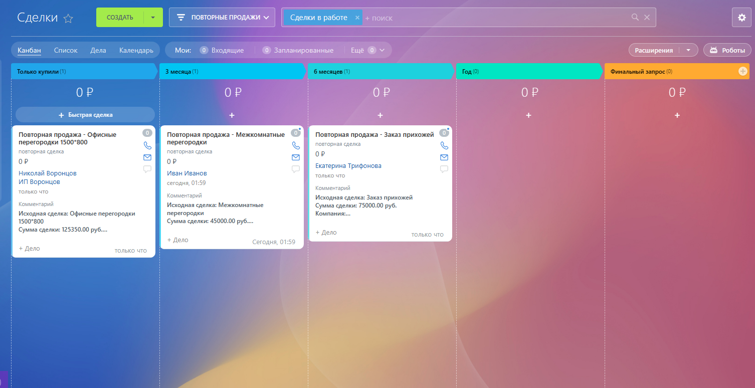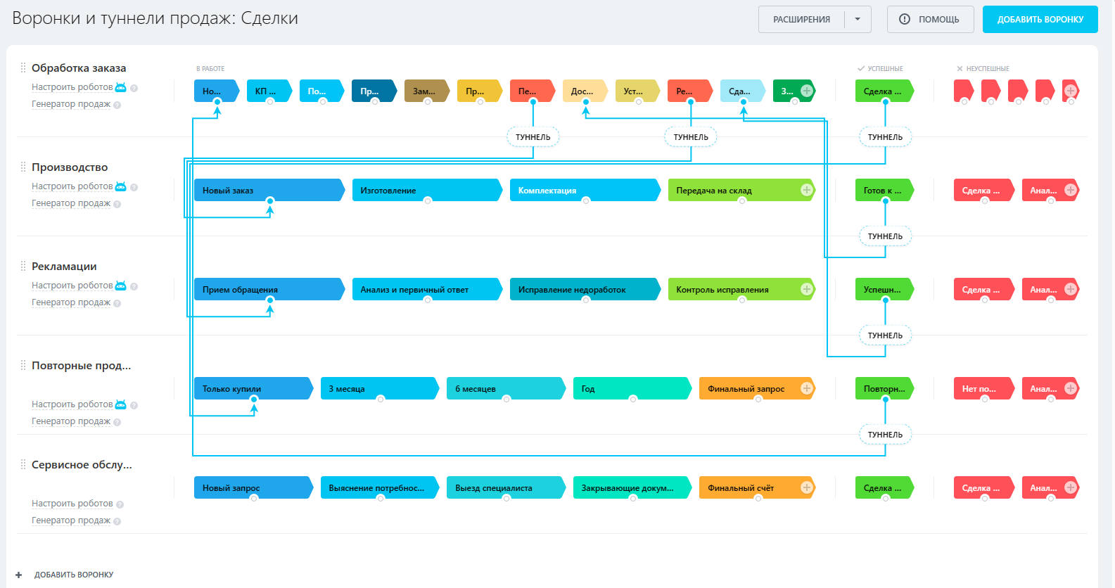 В CRM настроены туннели продаж для автоматического перехода сделок между воронками.