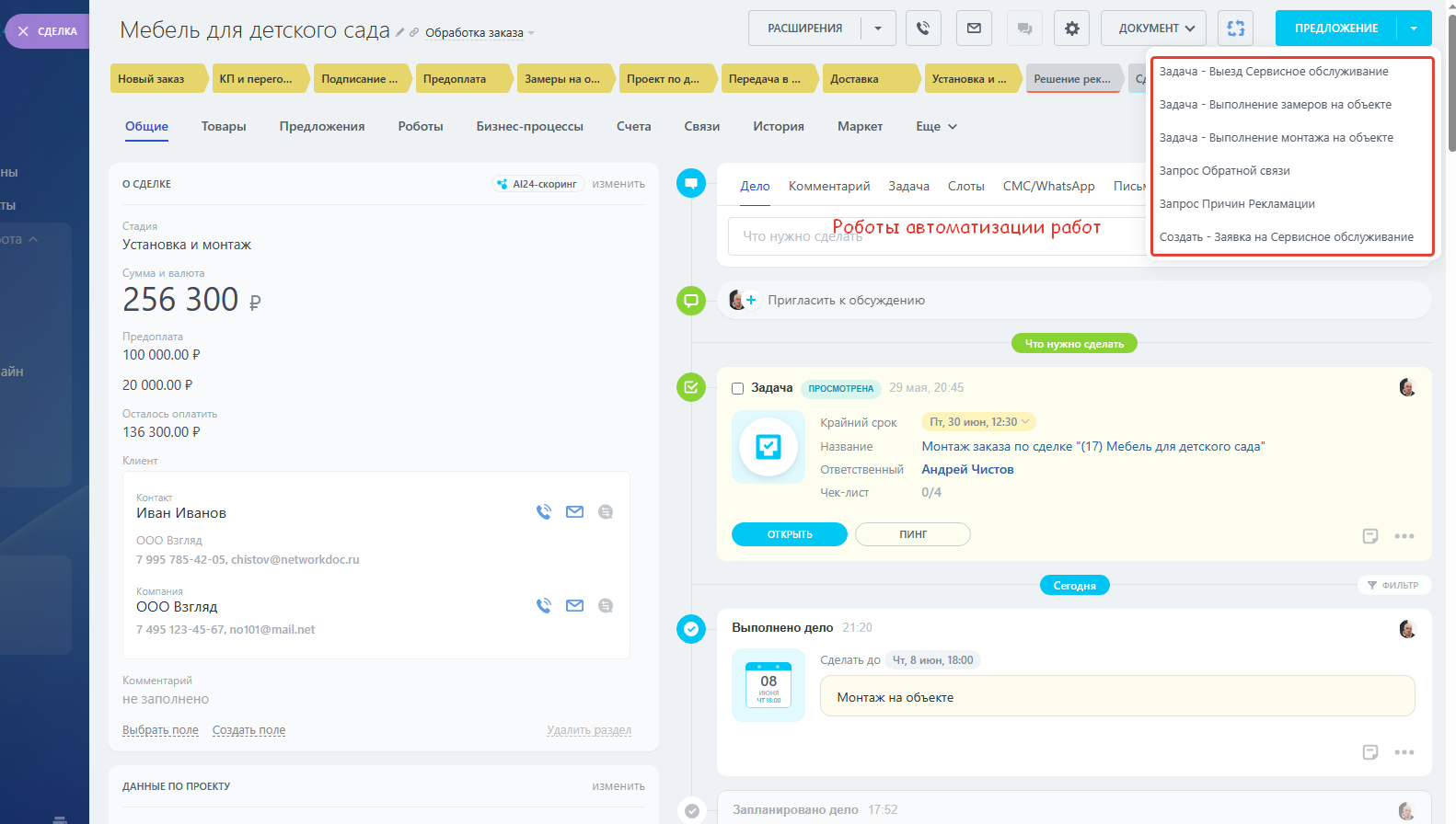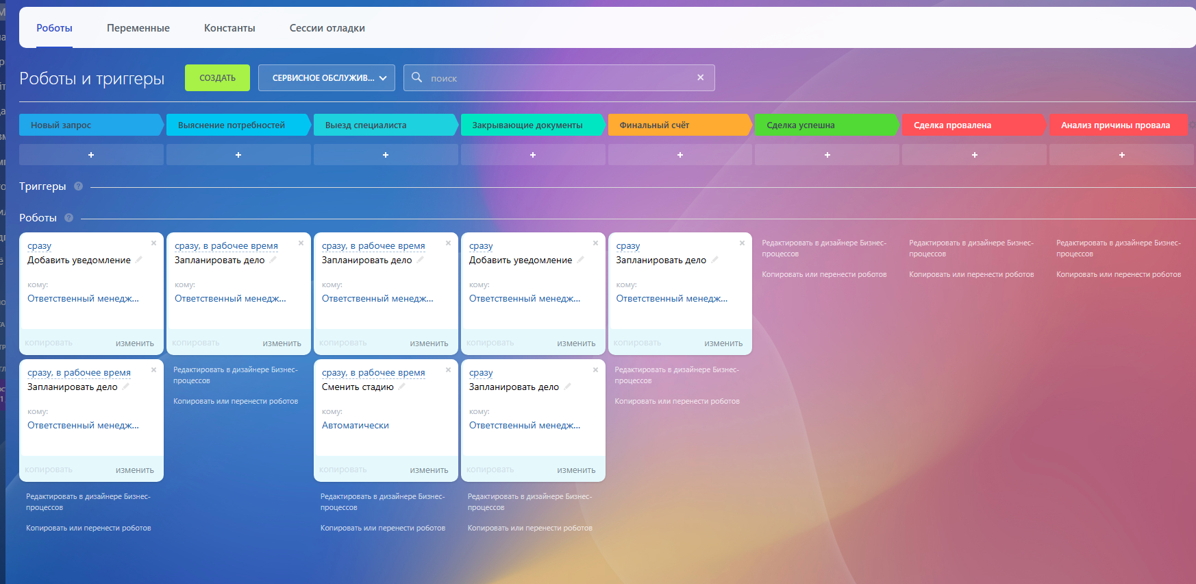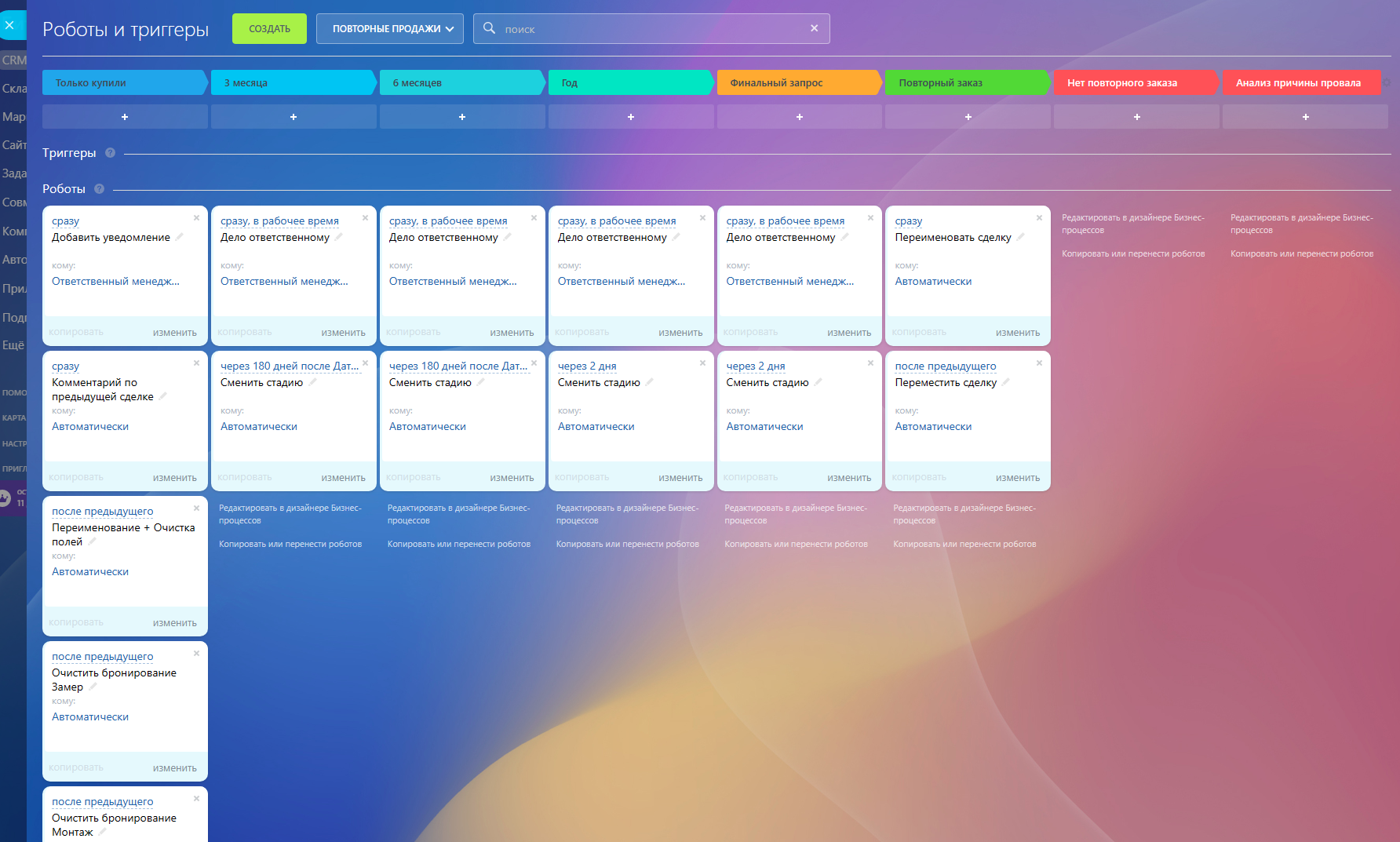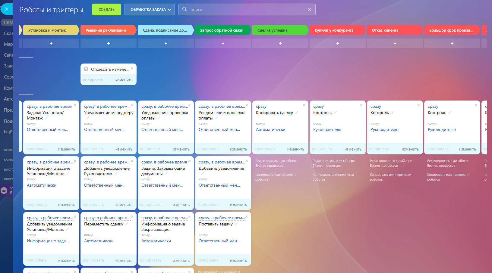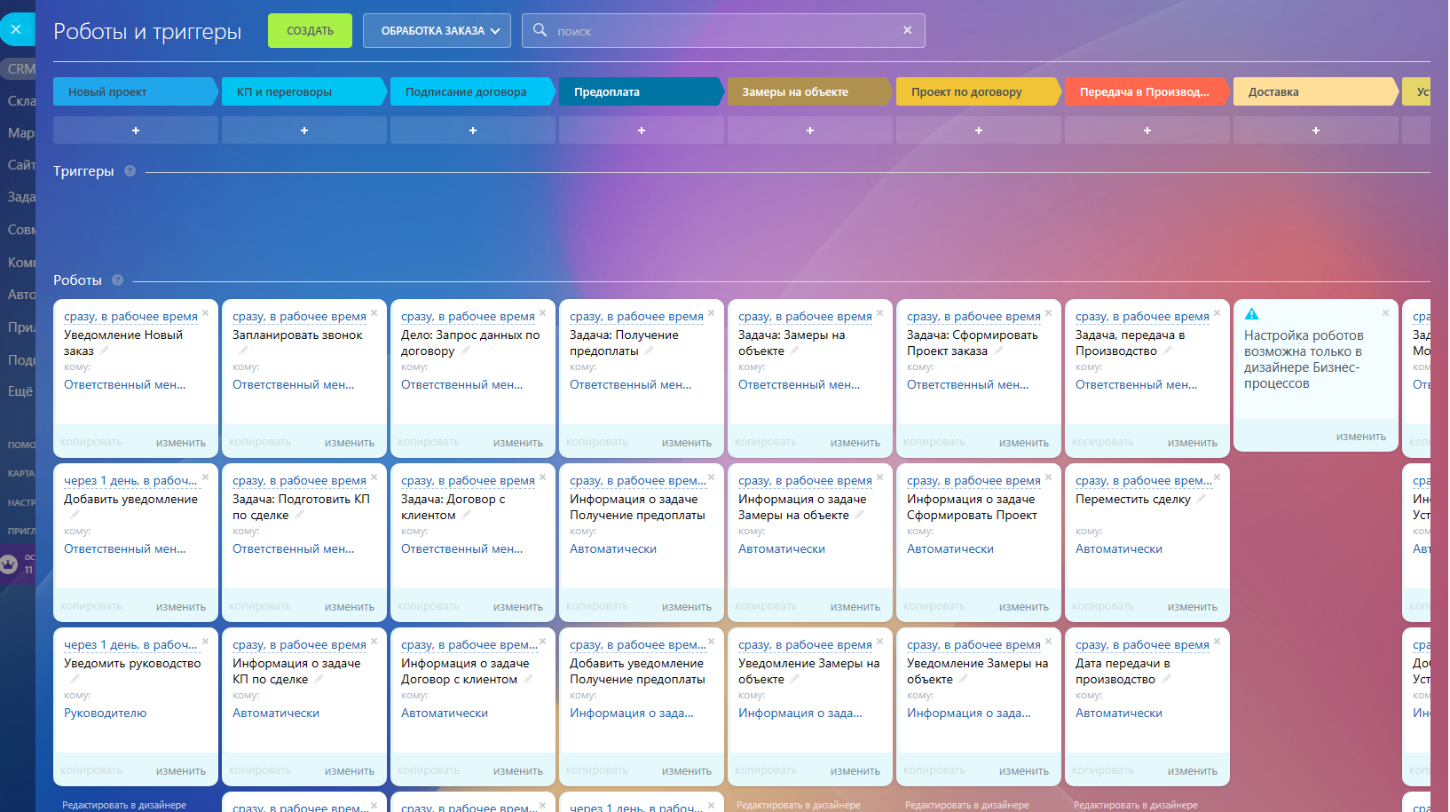 Добавлены специальные роботы для обработки сделки на различных стадиях – уведомления, постановка задач и контроль руководителя, автоматическая отправка оповещений клиенту: e-mail или sms сообщений в случае подключения sms провайдера.