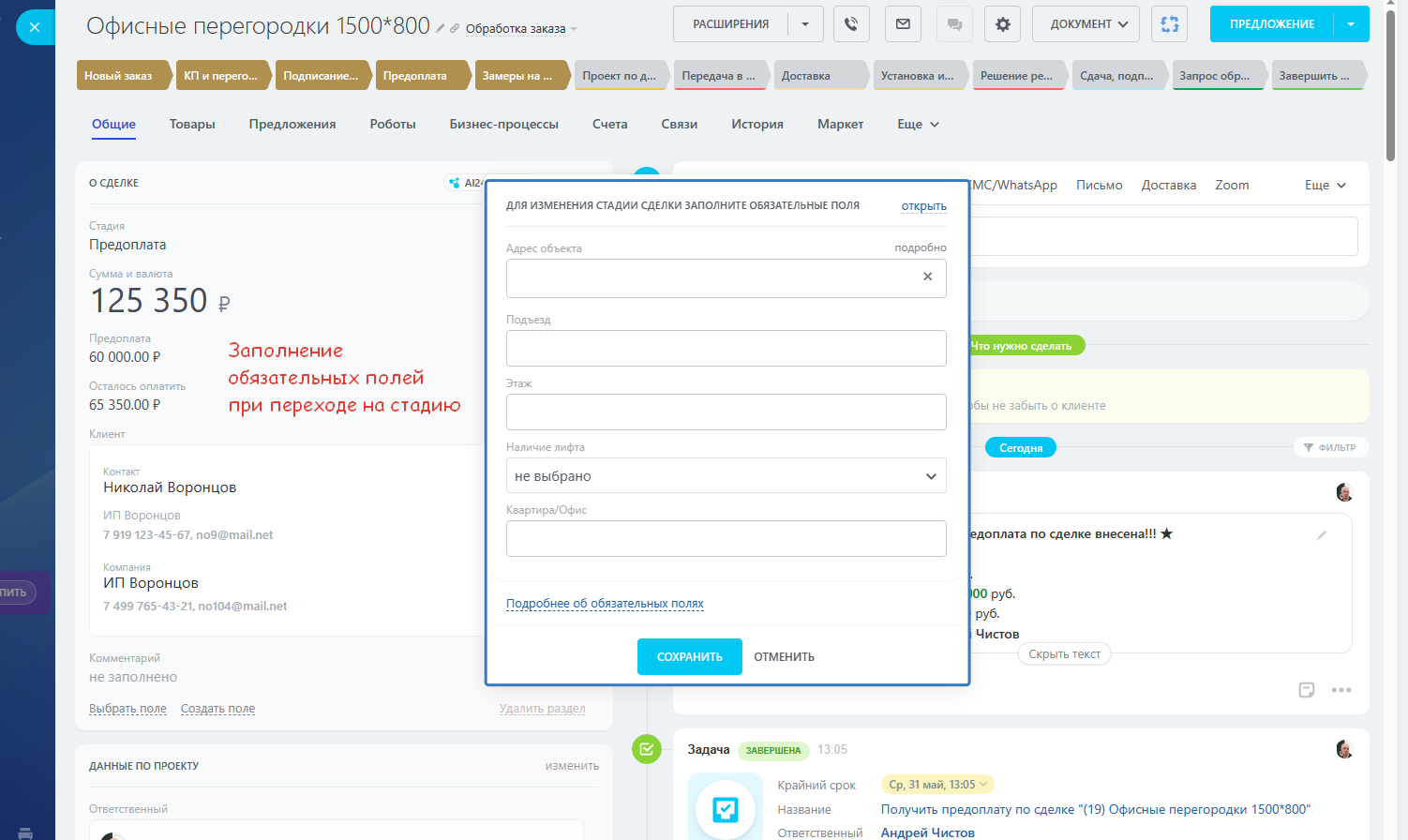 В системе настроена обязательность заполнения полей при переводе сделки на определенную стадию.