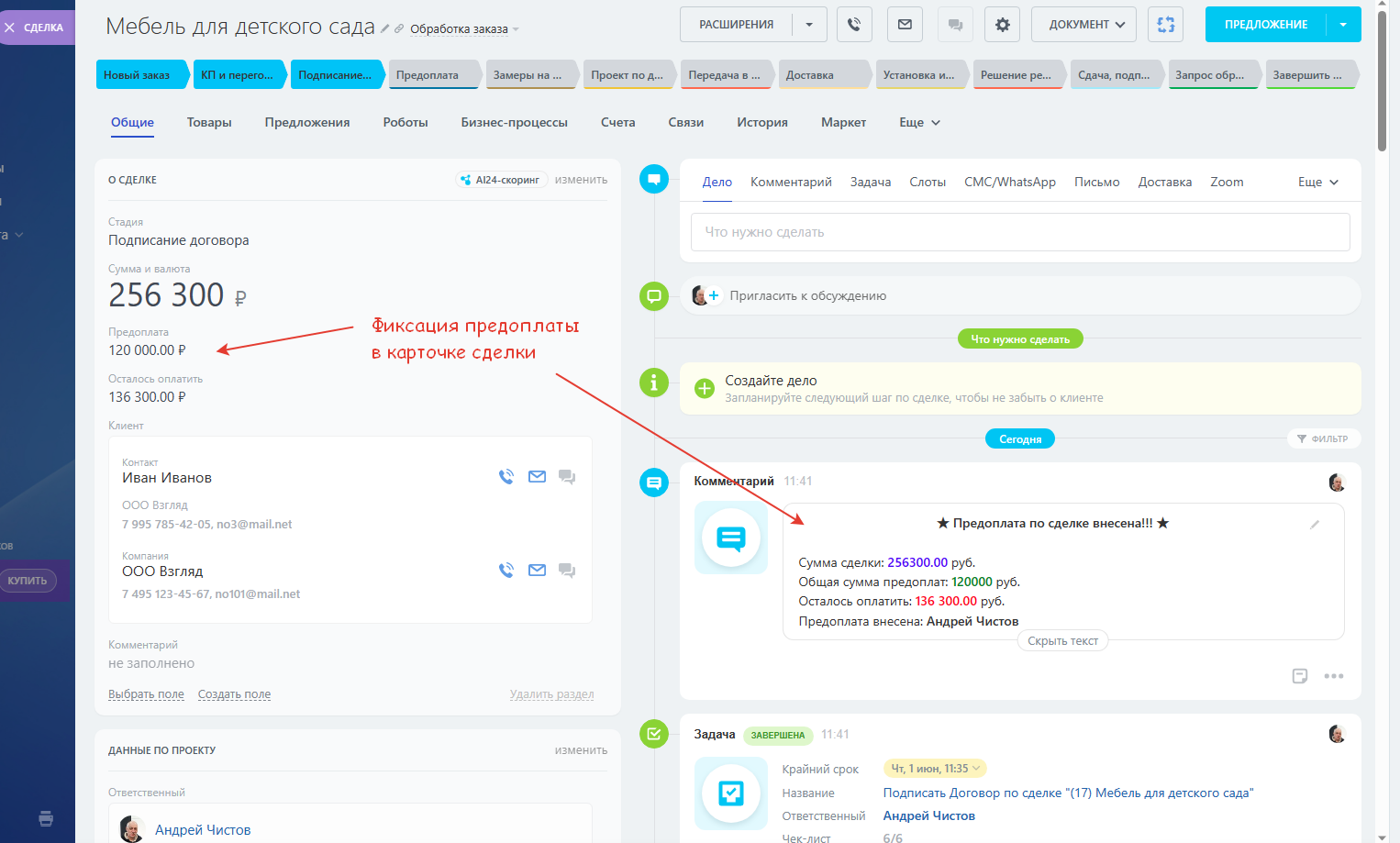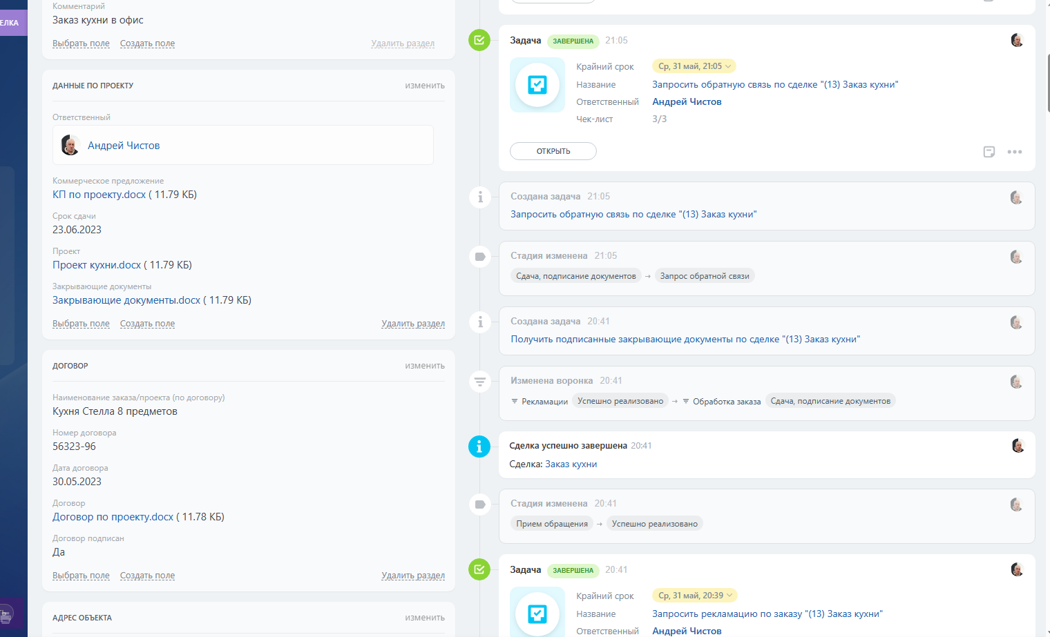 - Использование специализированной карточки сделки позволяет получить всю необходимую информацию о заказе, а обязательные поля в карточке не дадут менеджеру неправильно вести сделку.