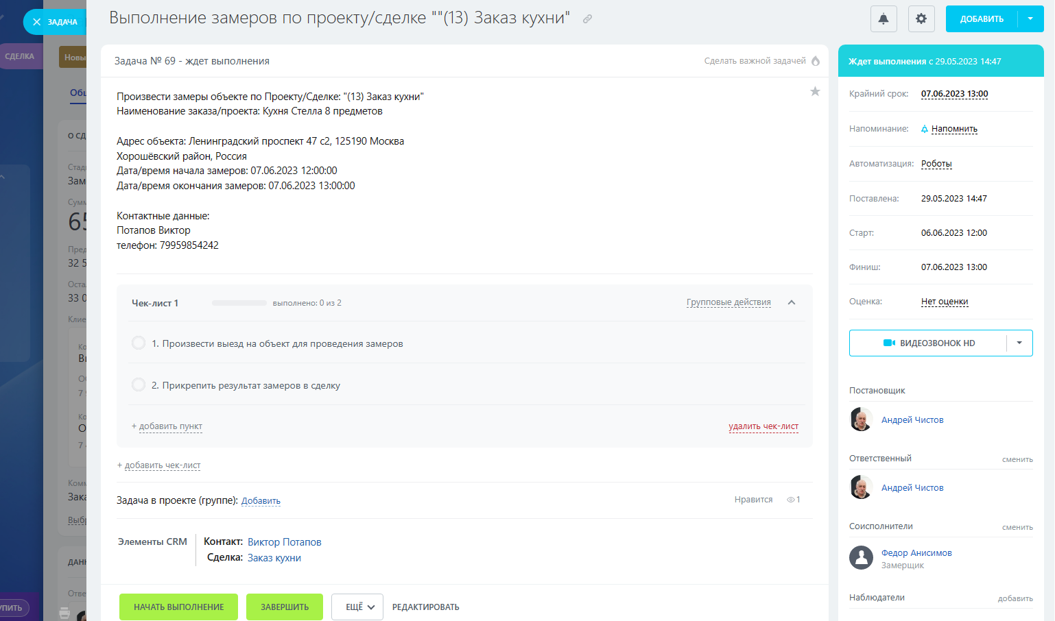 - Дата замеров и ответственный - Выбор сотрудников и дата и время проведения замеров на объекте