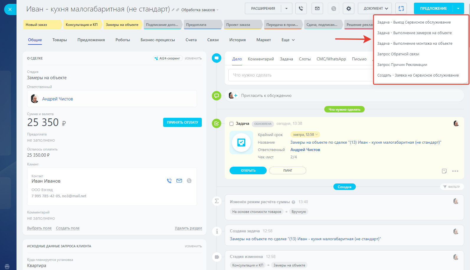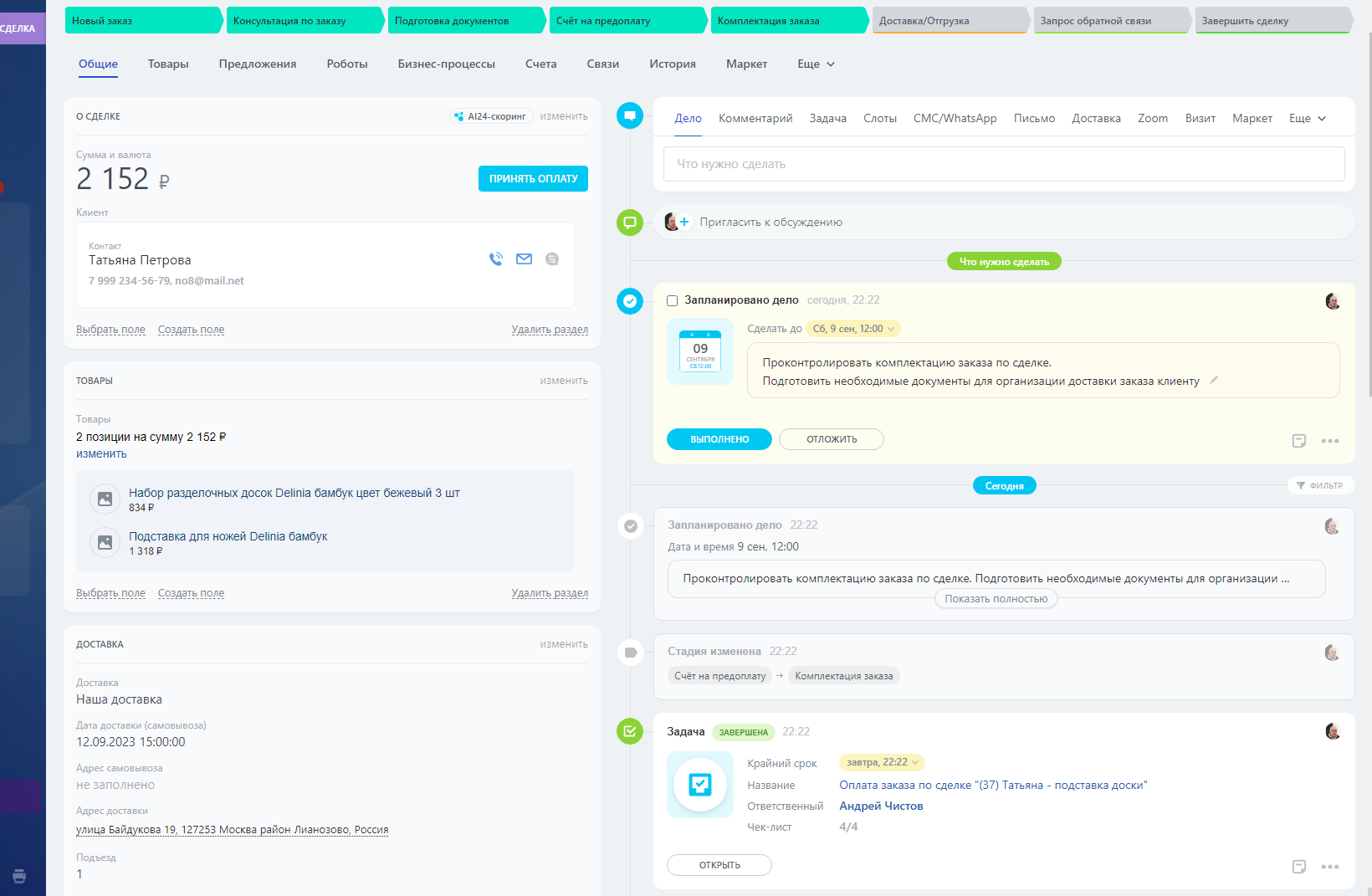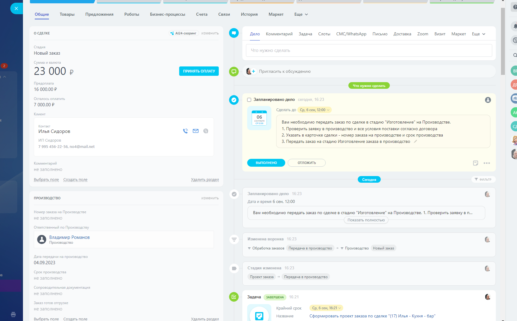 - Использование специализированной карточки сделки позволяет получить всю необходимую информацию о заказе, а обязательные поля в карточке не дадут менеджеру неправильно вести сделку.
