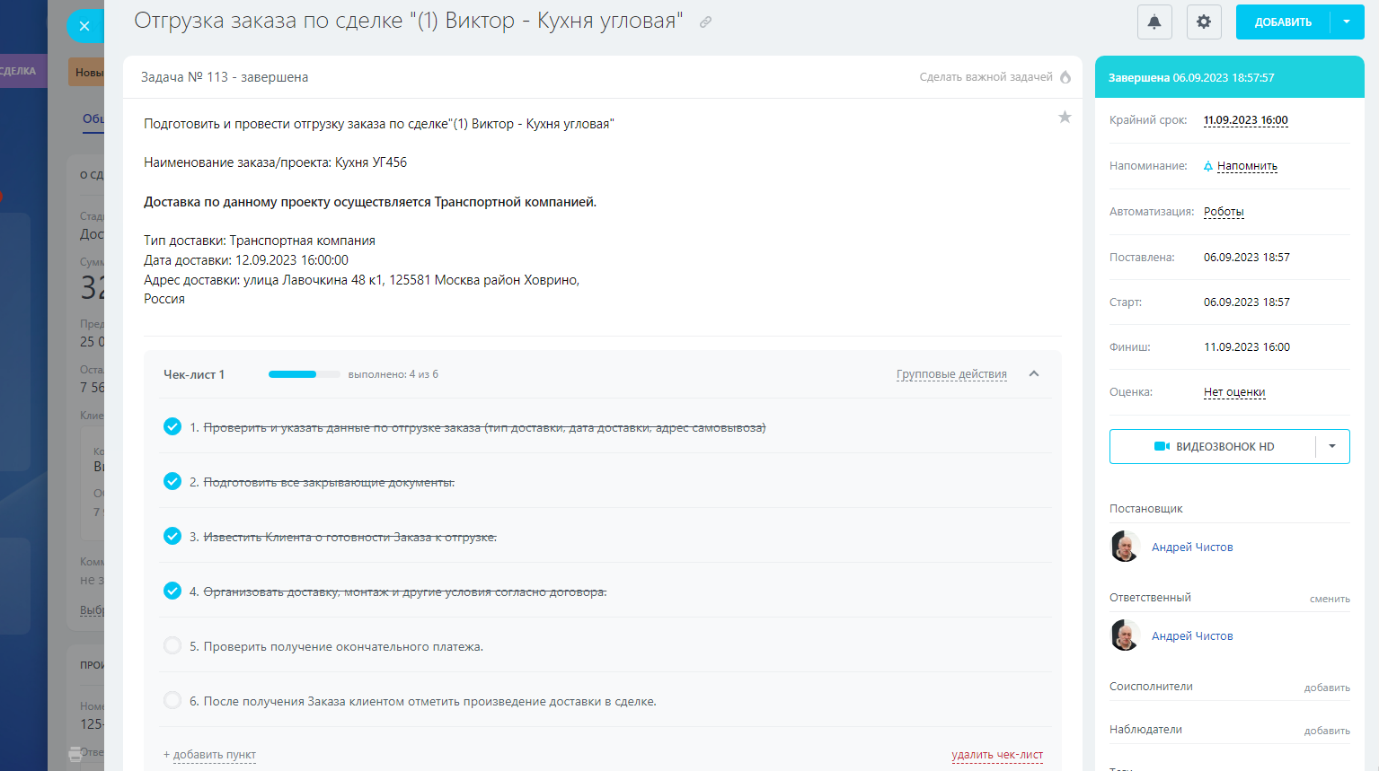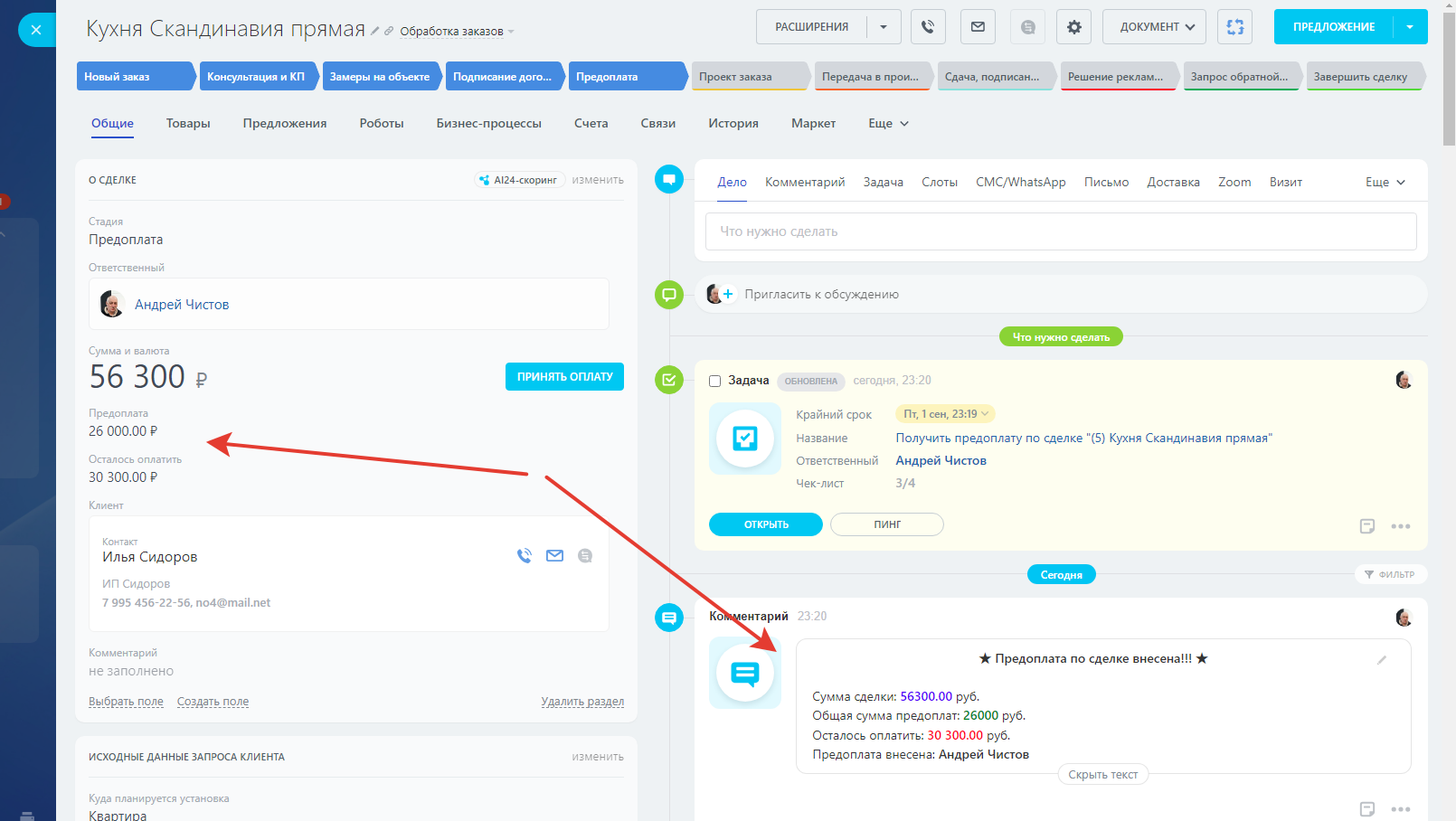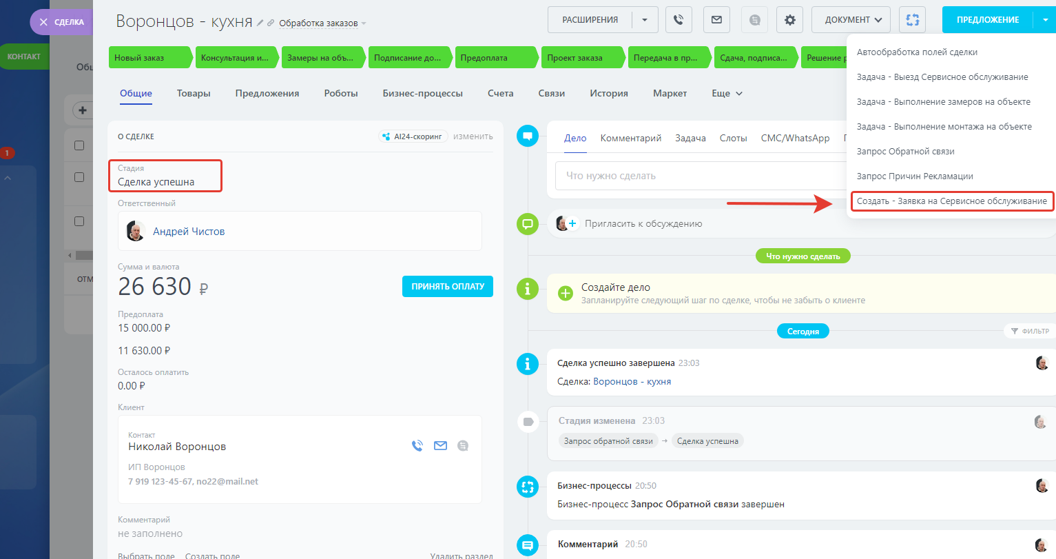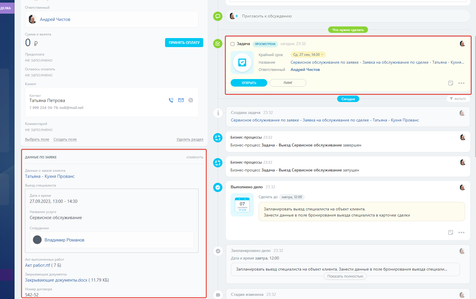 - Использование специализированной карточки сделки позволяет получить всю необходимую информацию о заказе, а обязательные поля в карточке не дадут менеджеру неправильно вести сделку.