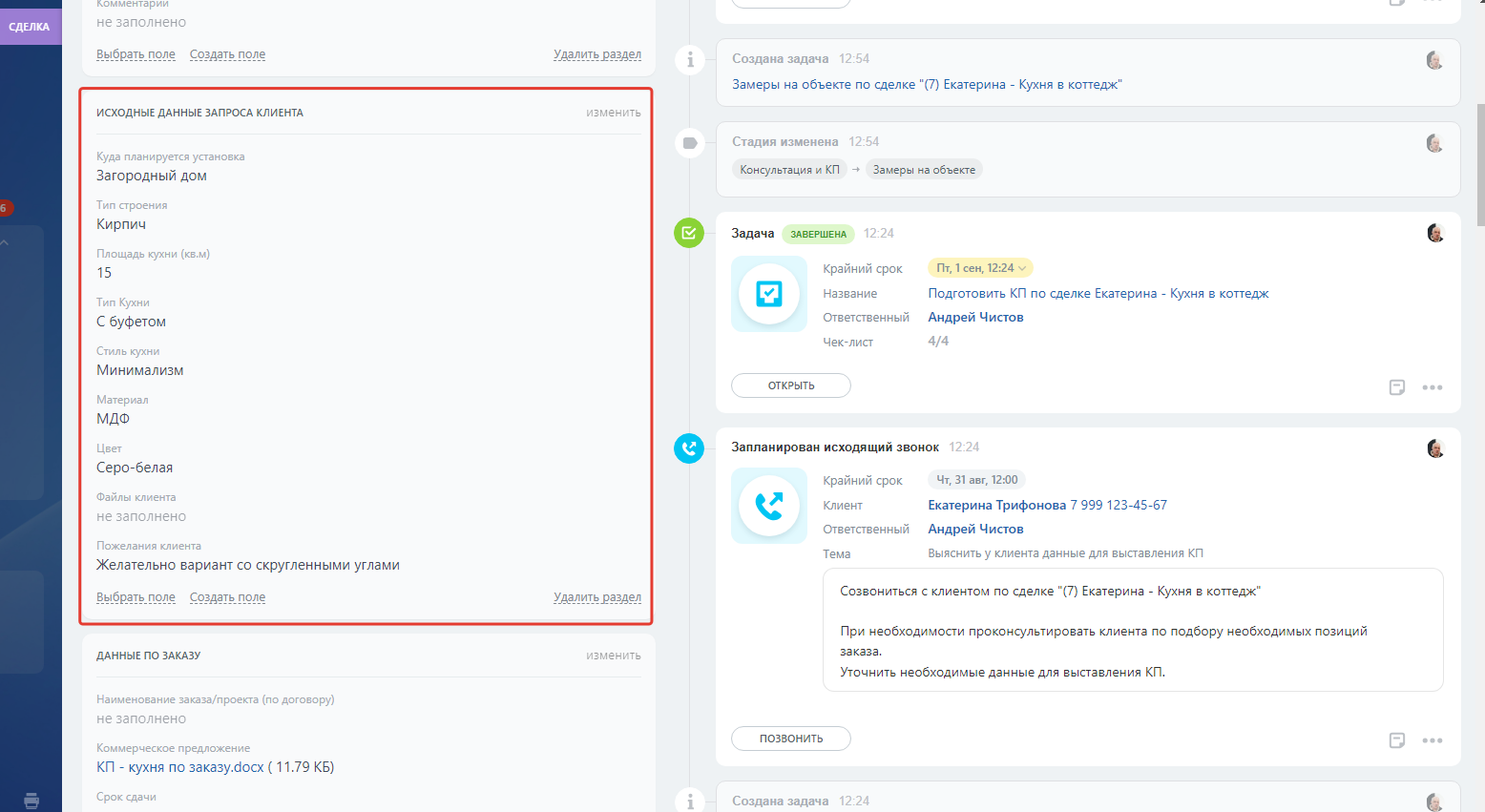 Для удобной работы со сделкой настроены специальные тематические разделы и поля в представлении карточки сделки.