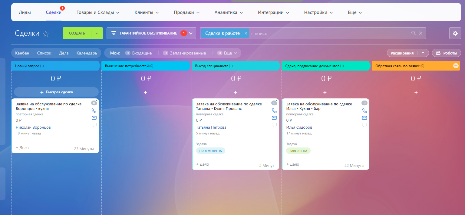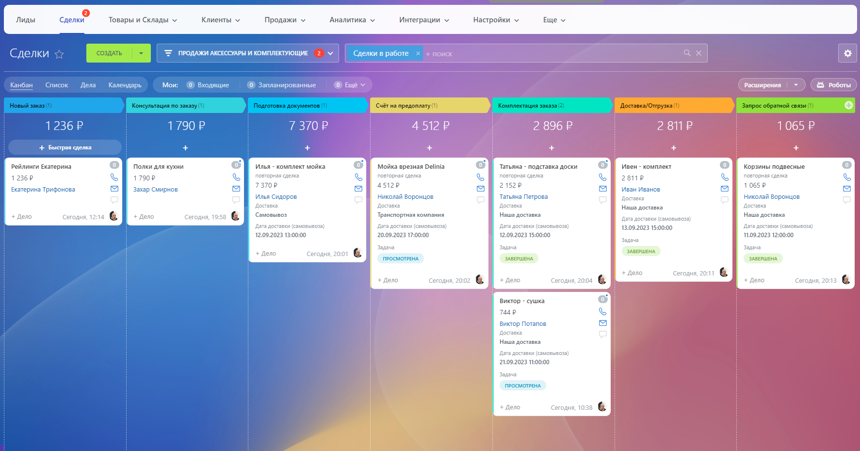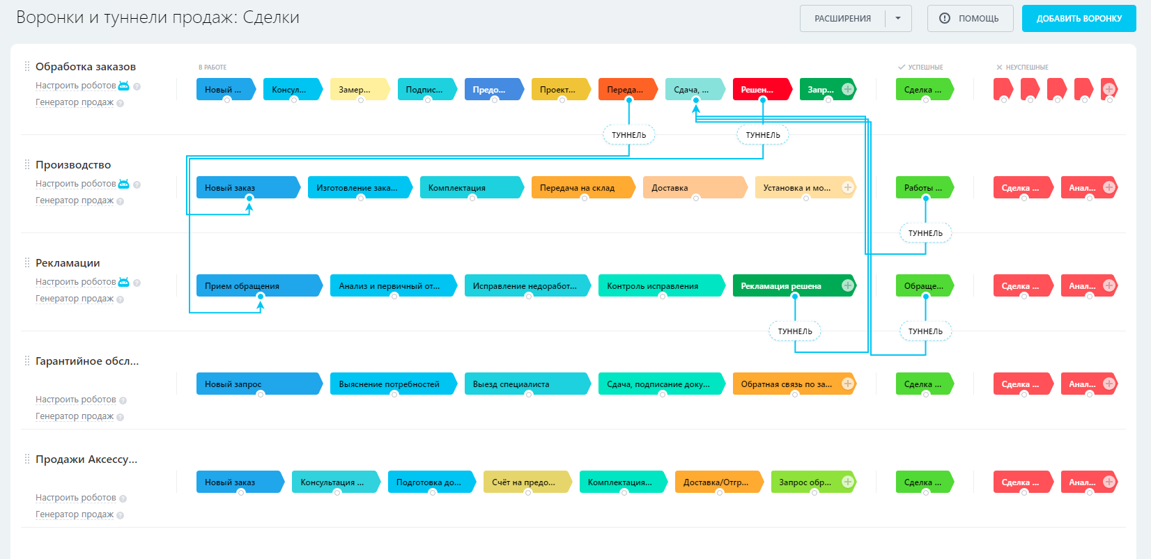 В CRM настроены туннели продаж для автоматического перехода сделок между воронками.