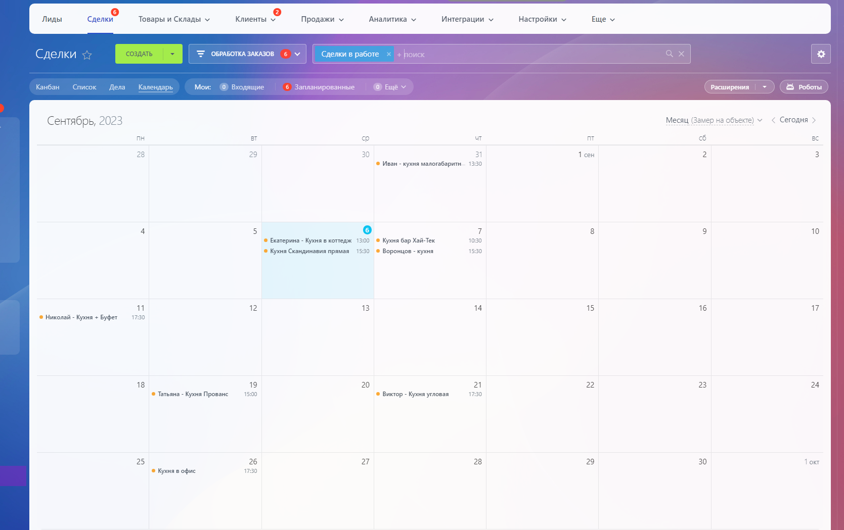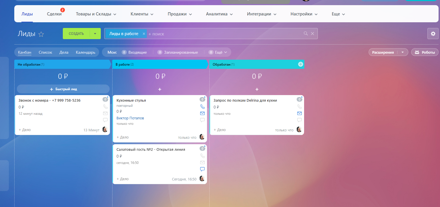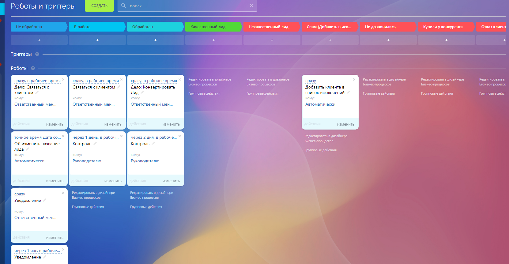 В CRM настроены туннели продаж для автоматического перехода сделок между воронками.