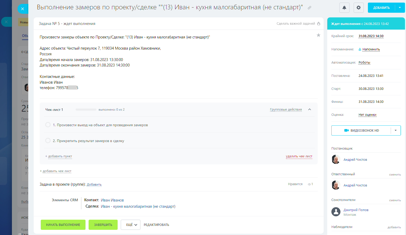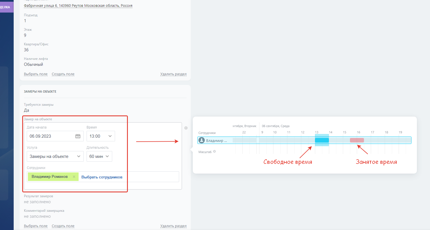 - Дата замеров и ответственный - Выбор сотрудников и дата и время проведения замеров на объекте