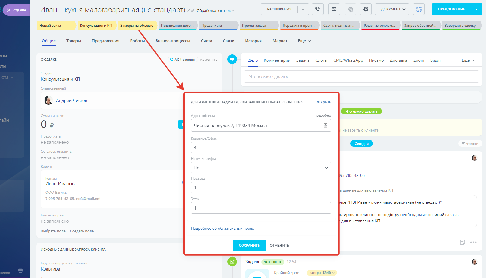 В системе настроена обязательность заполнения полей при переводе сделки на определенную стадию.