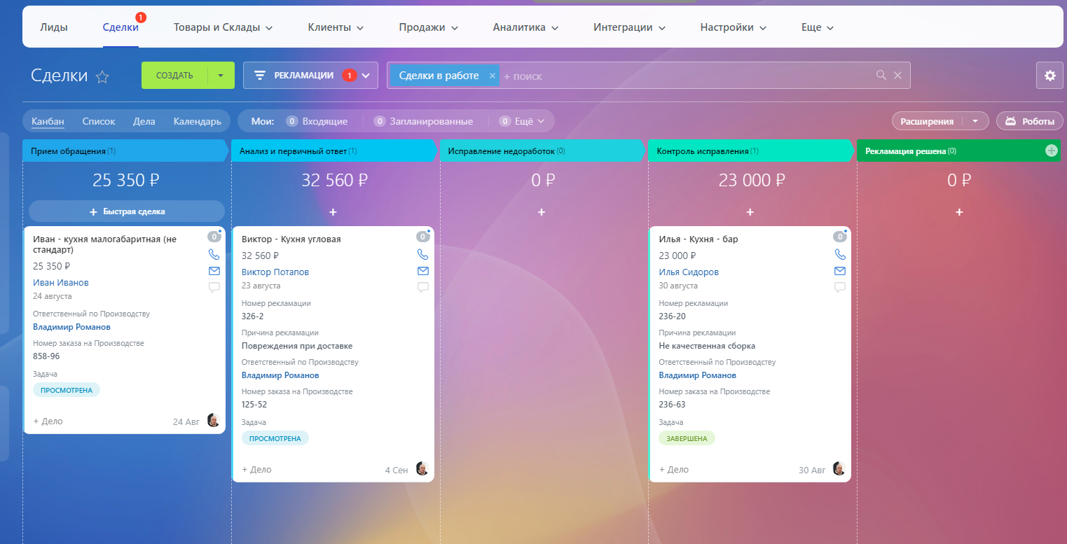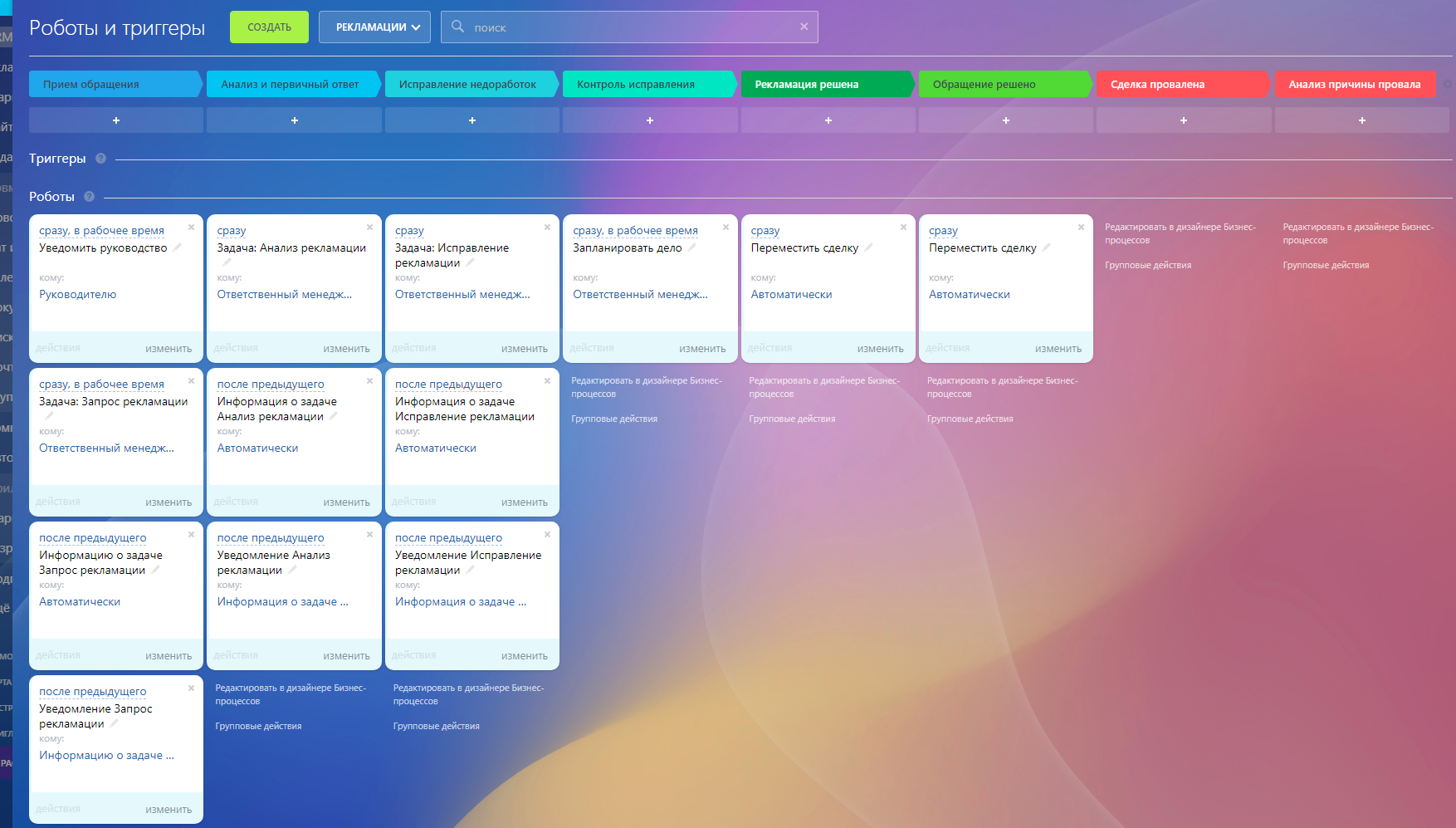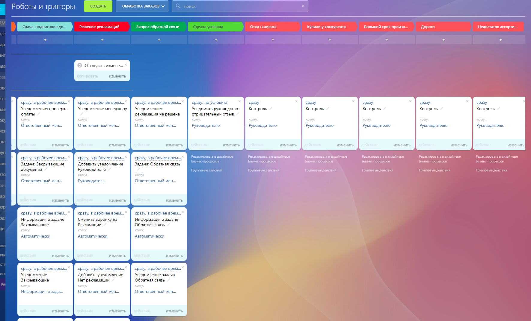 Например: Перенос сделки в Воронки Производство и Рекламации из воронки Обработка заказа