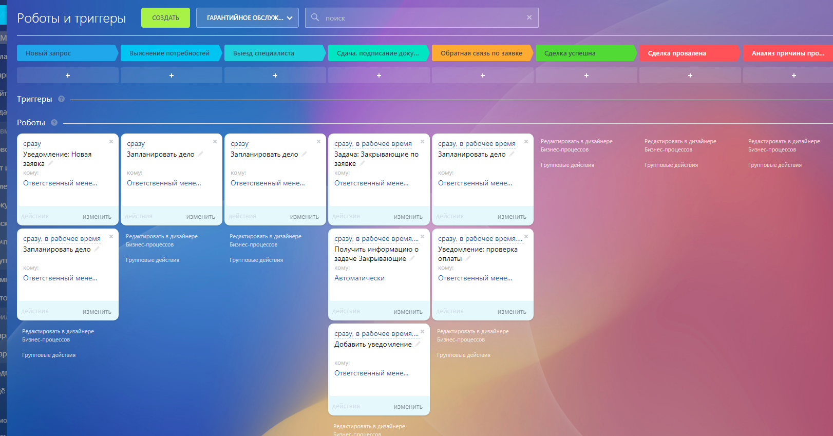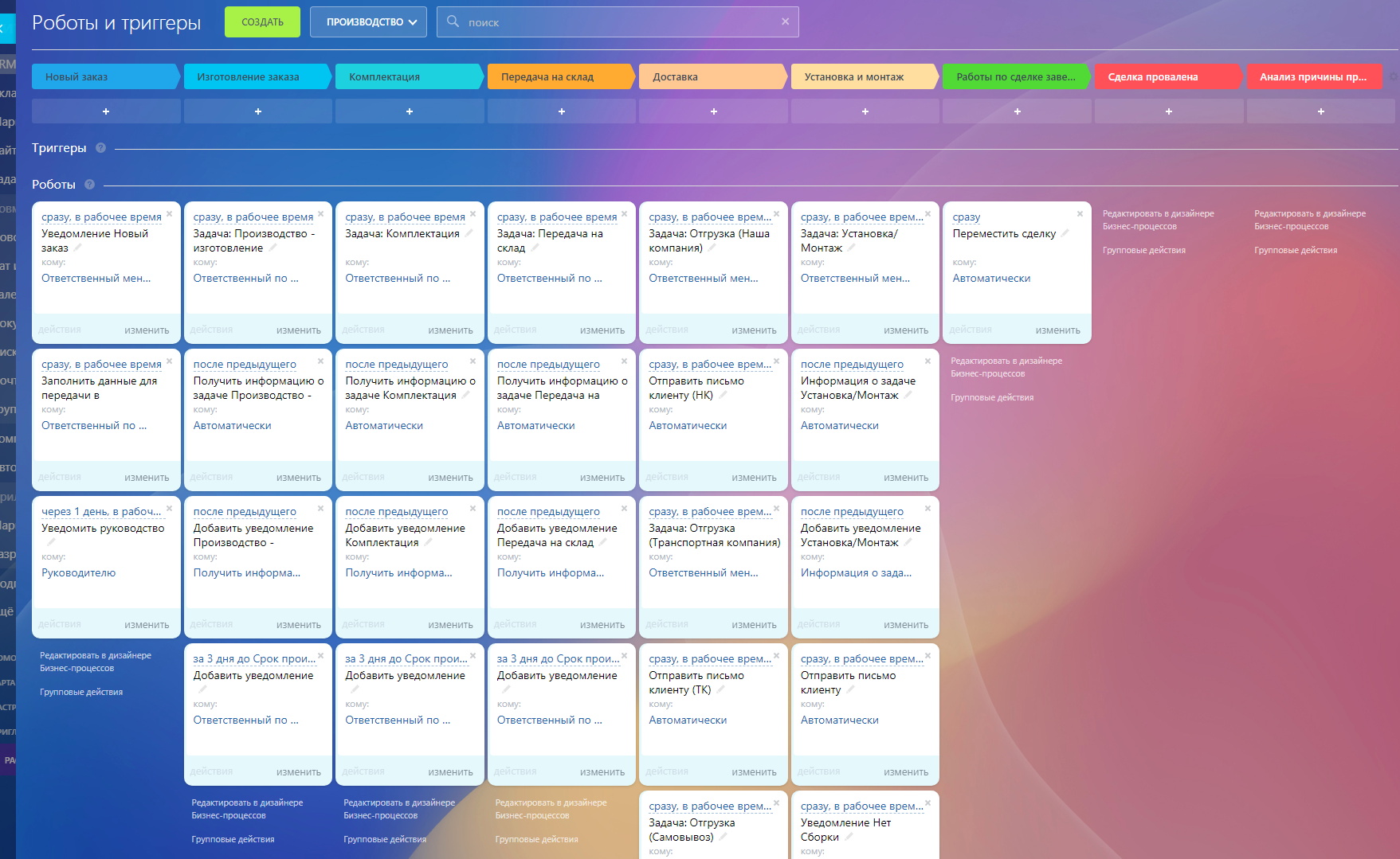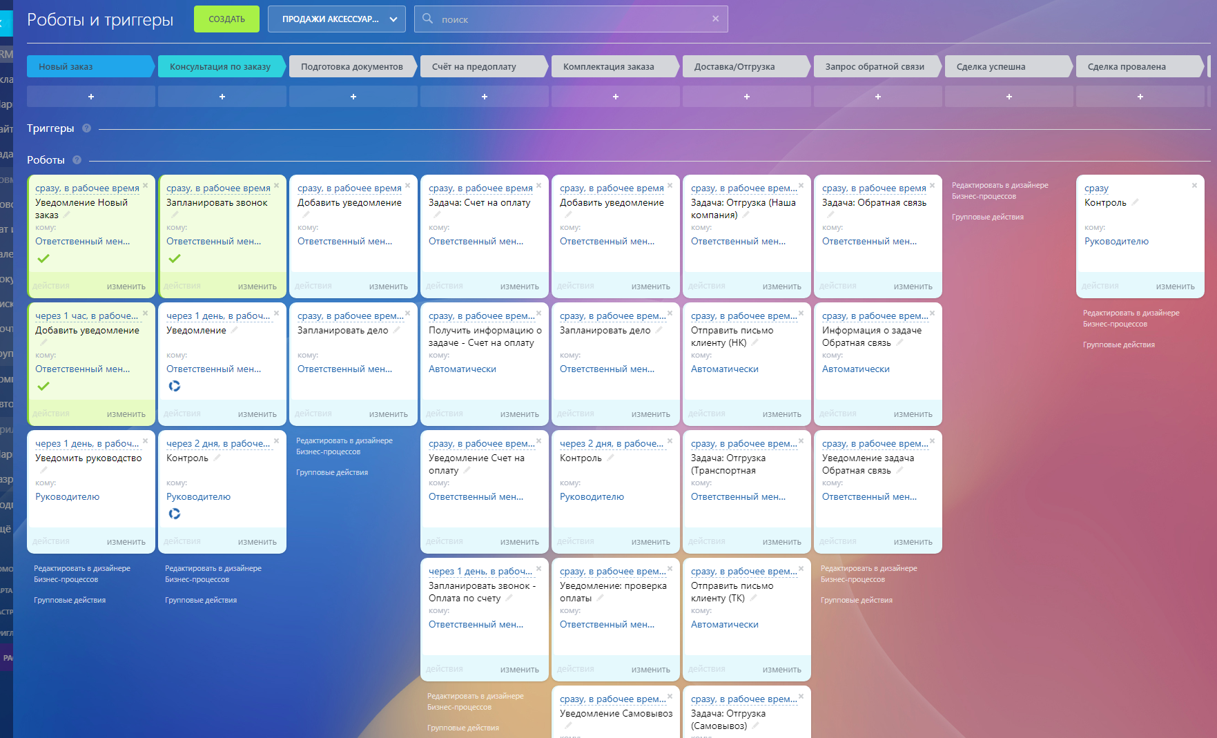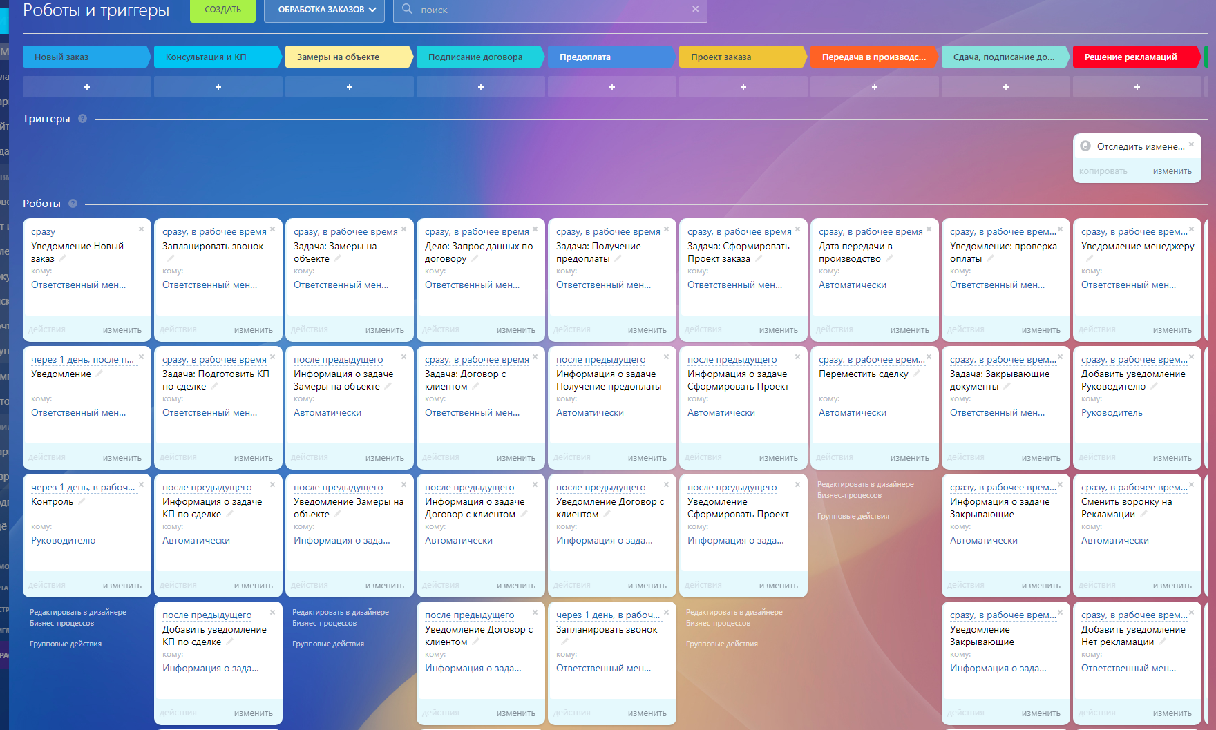 Добавлены специальные роботы для обработки сделки на различных стадиях – уведомления, постановка задач и контроль руководителя, автоматическая отправка оповещений клиенту: e-mail или sms сообщений в случае подключения sms провайдера.