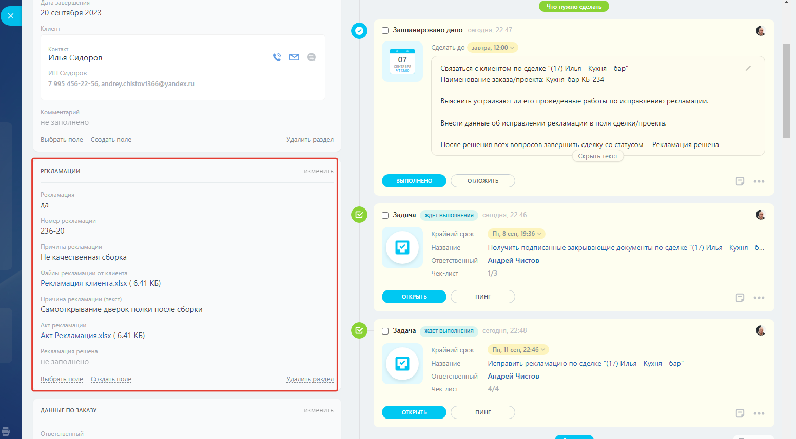- В случае получения рекламации по заказу CRM позволяет своевременно зафиксировать и решить возникшие проблемы, а также проконтролировать весь процесс решения рекламации по заказу