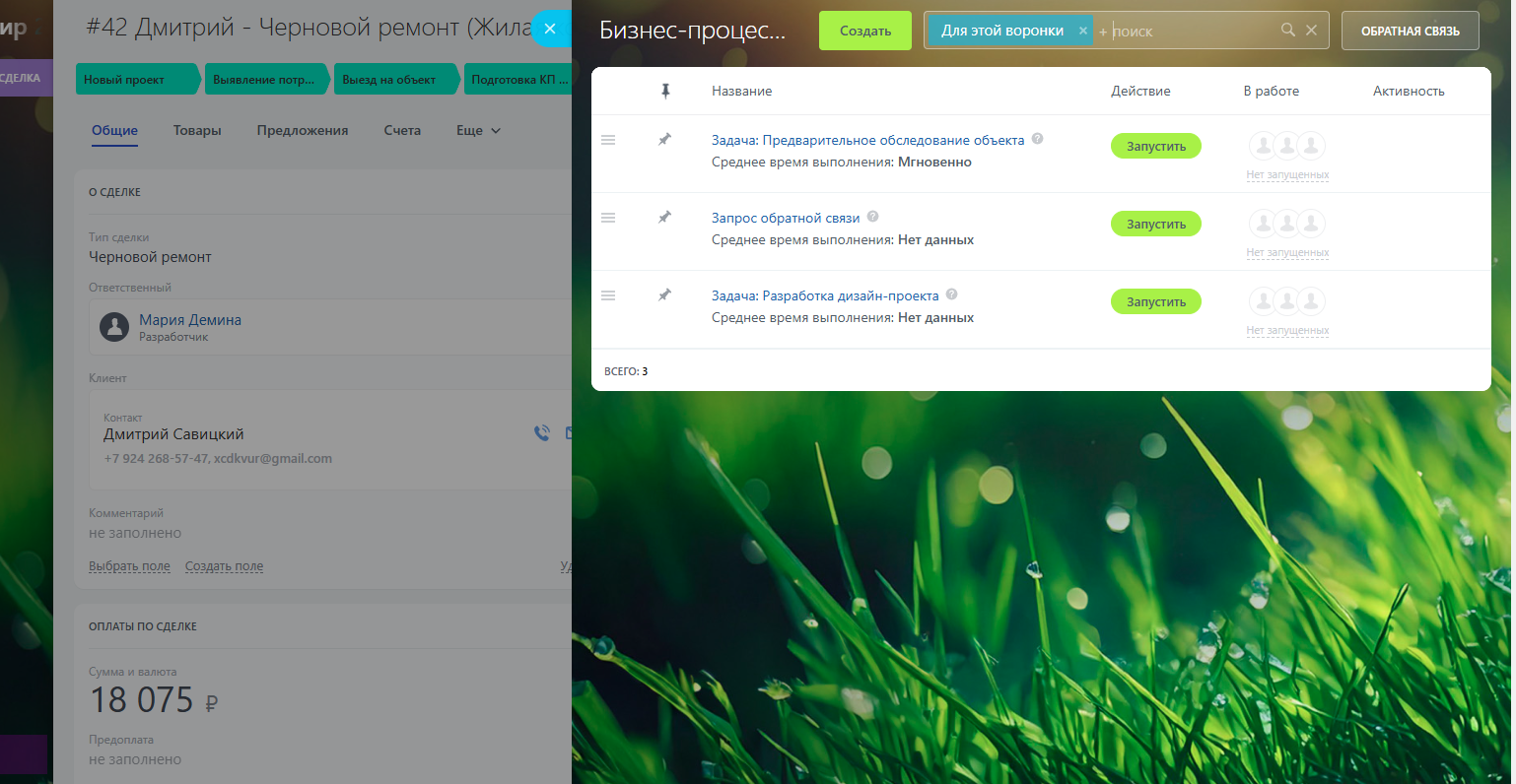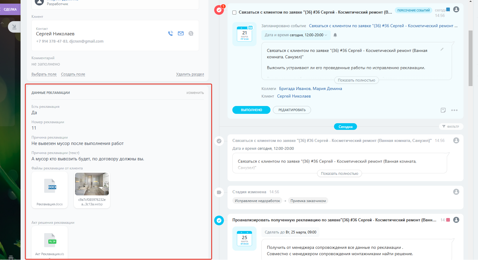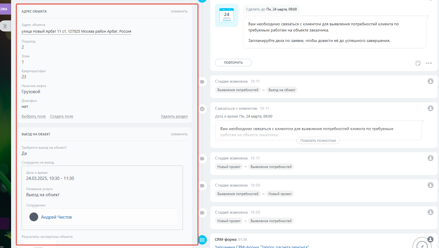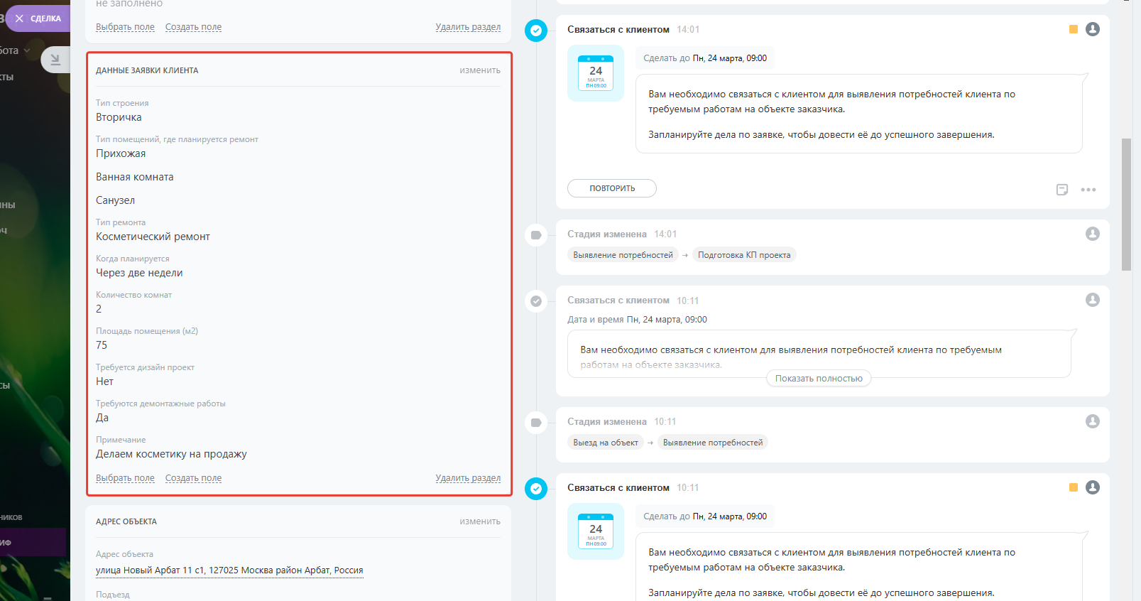 В карточке сделки на ремонт созданы наборы пользовательских полей для заведения исходных данных от клиента и по обработке заявки сотрудником компании: