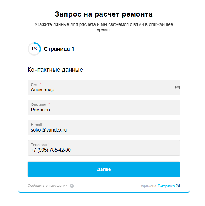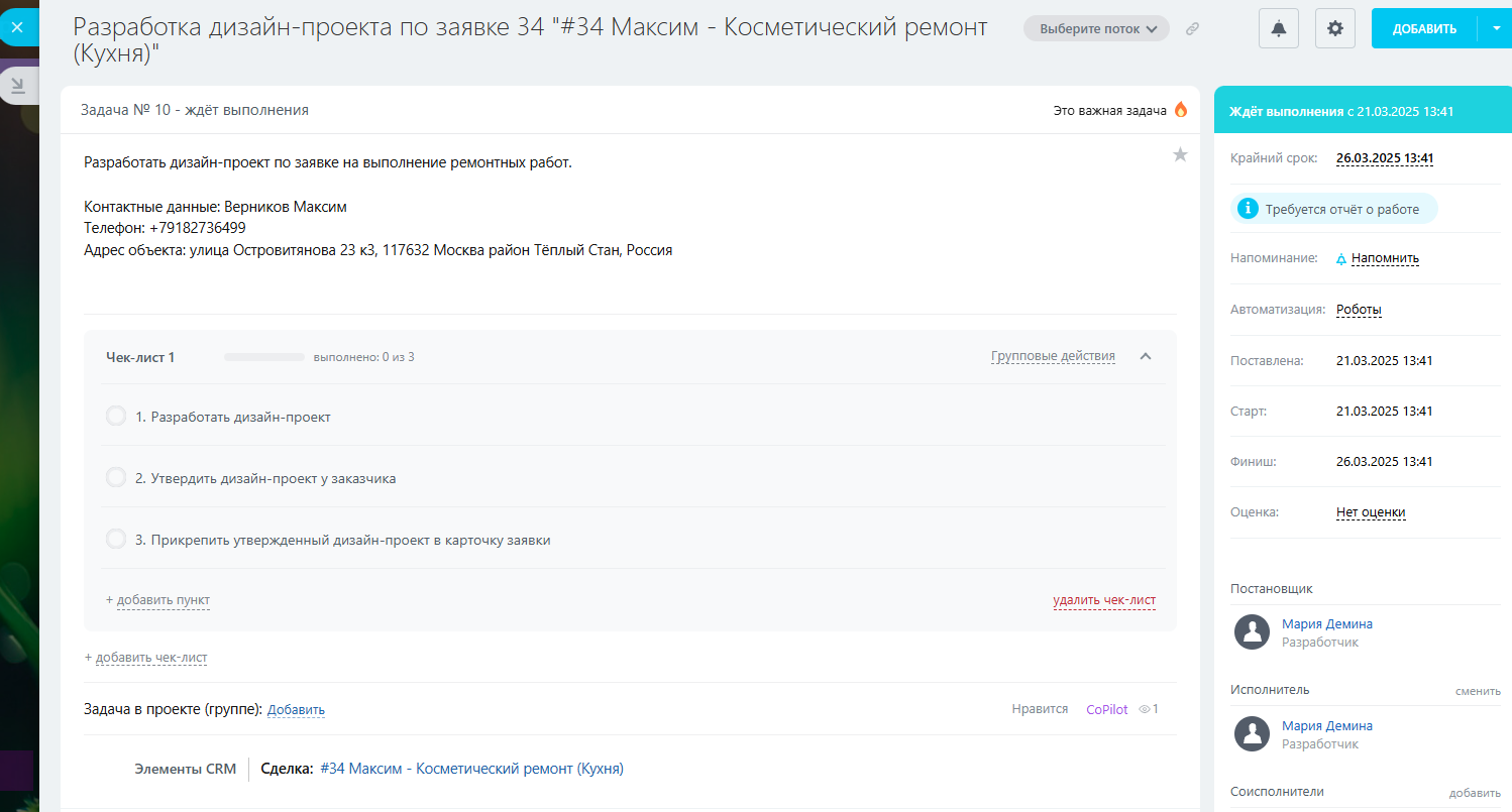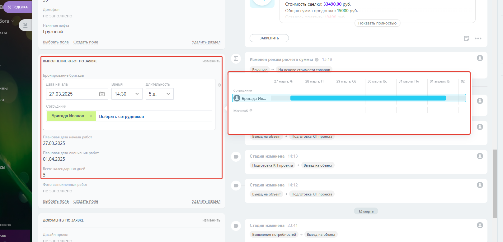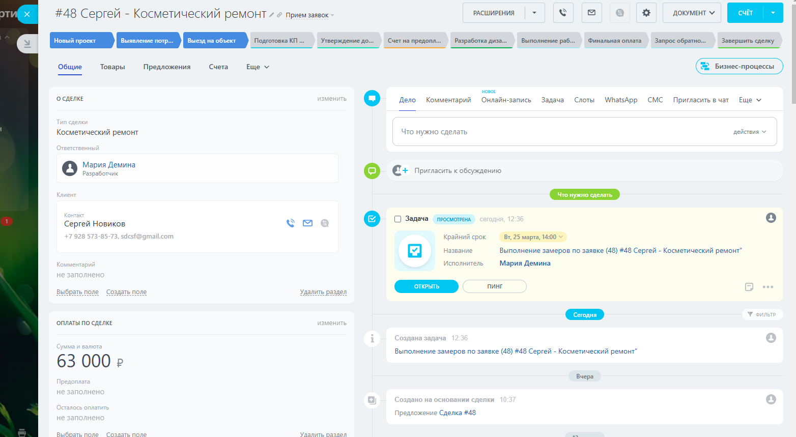 В карточке сделки на ремонт созданы наборы пользовательских полей для заведения исходных данных от клиента и по обработке заявки сотрудником компании: