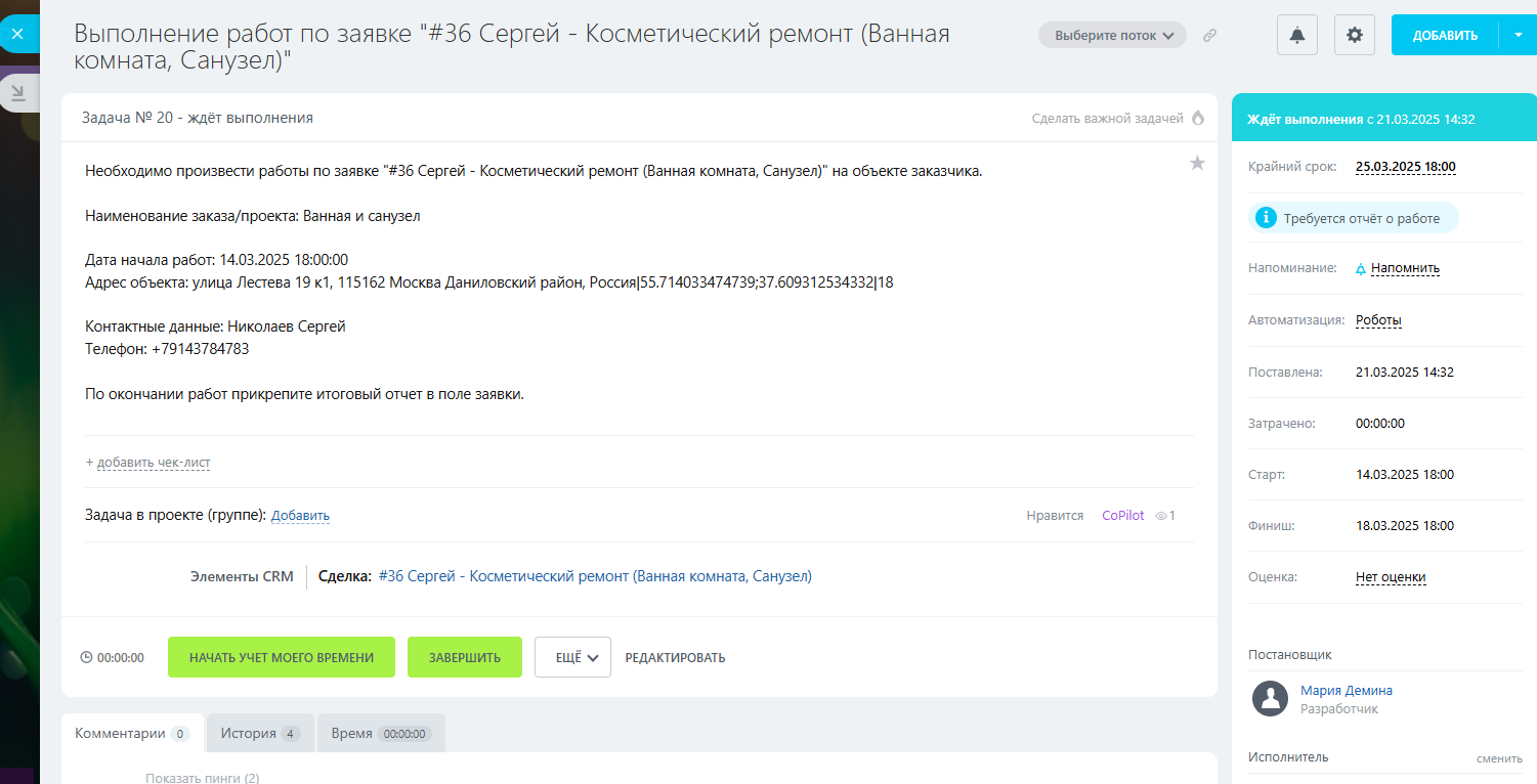 Интеграция нашего отраслевого решения с Битрикс24 делает управление ремонтными проектами еще более удобным и практичным. Это позволяет компаниям сосредоточиться на качестве выполнения работ, минимизируя временные затраты на организационные процессы.