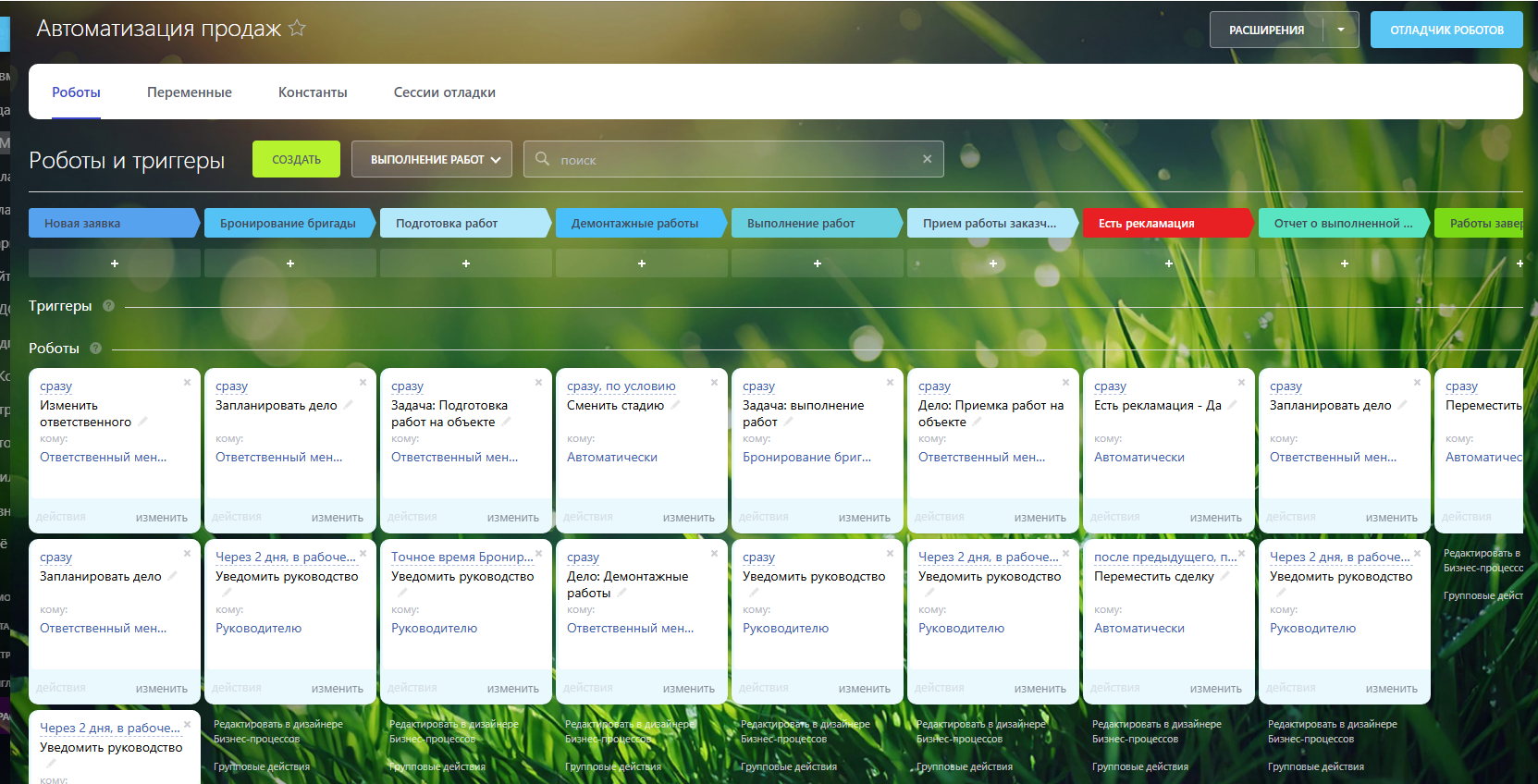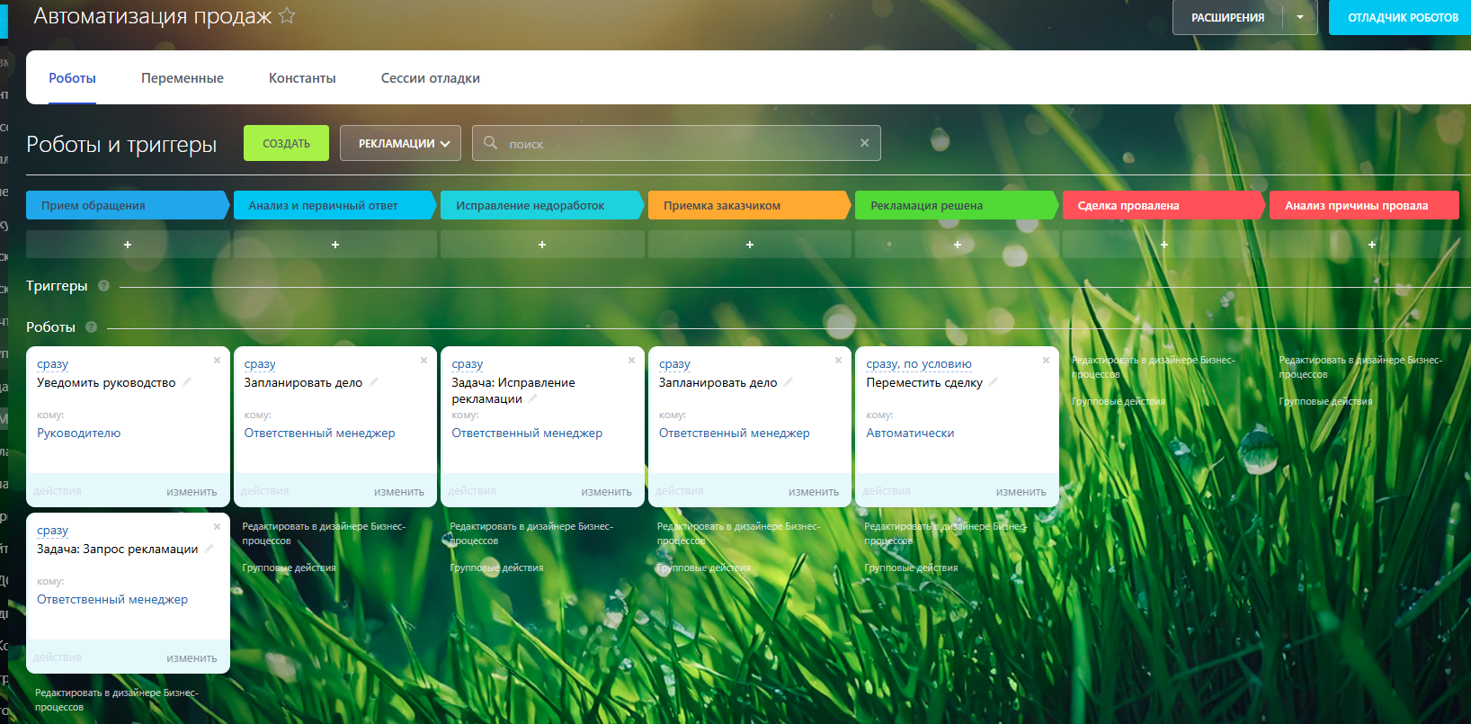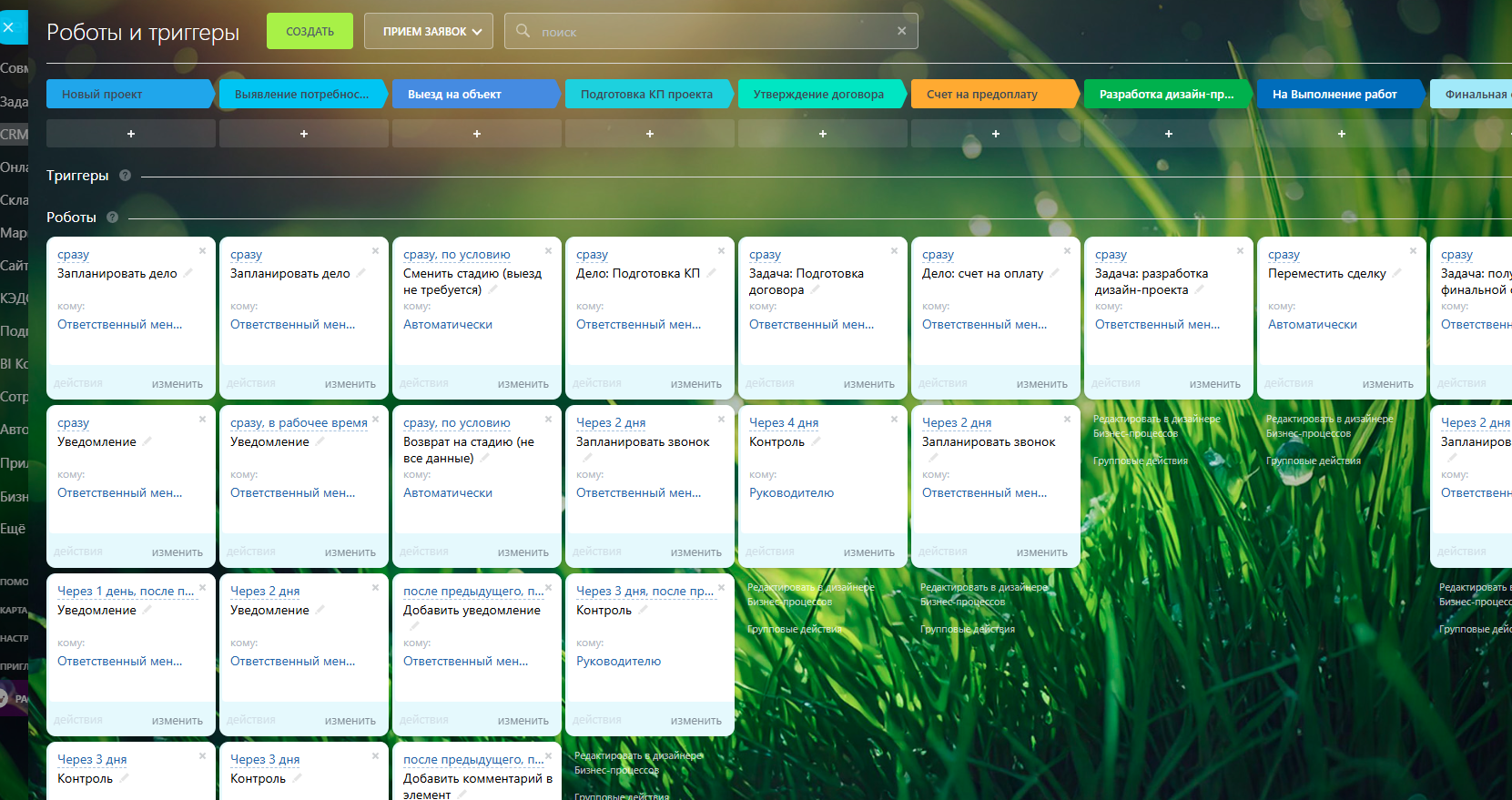 Добавлены роботы для обработки сделок на стадиях – уведомления, постановка задач и контроль руководителя, автоматическая отправка оповещений клиенту в виде e-mail или sms сообщений в случае подключения sms провайдера.