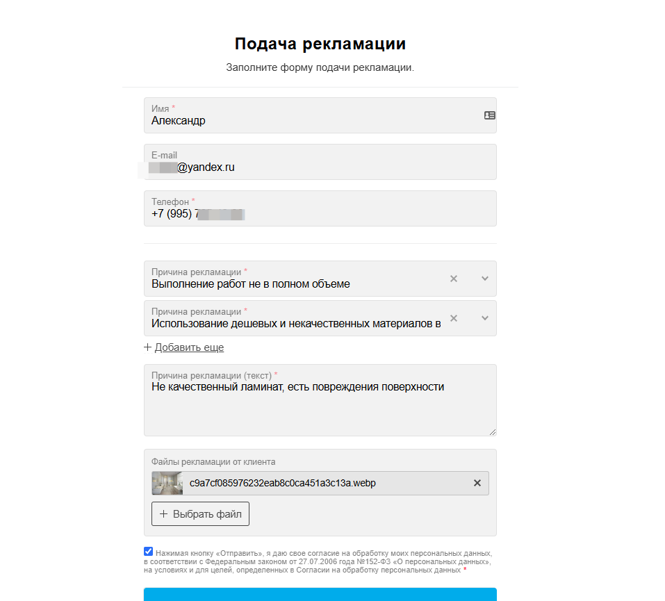 Есть рекламация, Номер рекламации, Причина рекламации, Причина рекламации (текст), Файлы рекламации от клиента, Акт решения рекламации, Рекламация решена.
