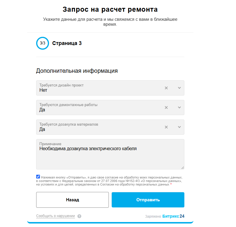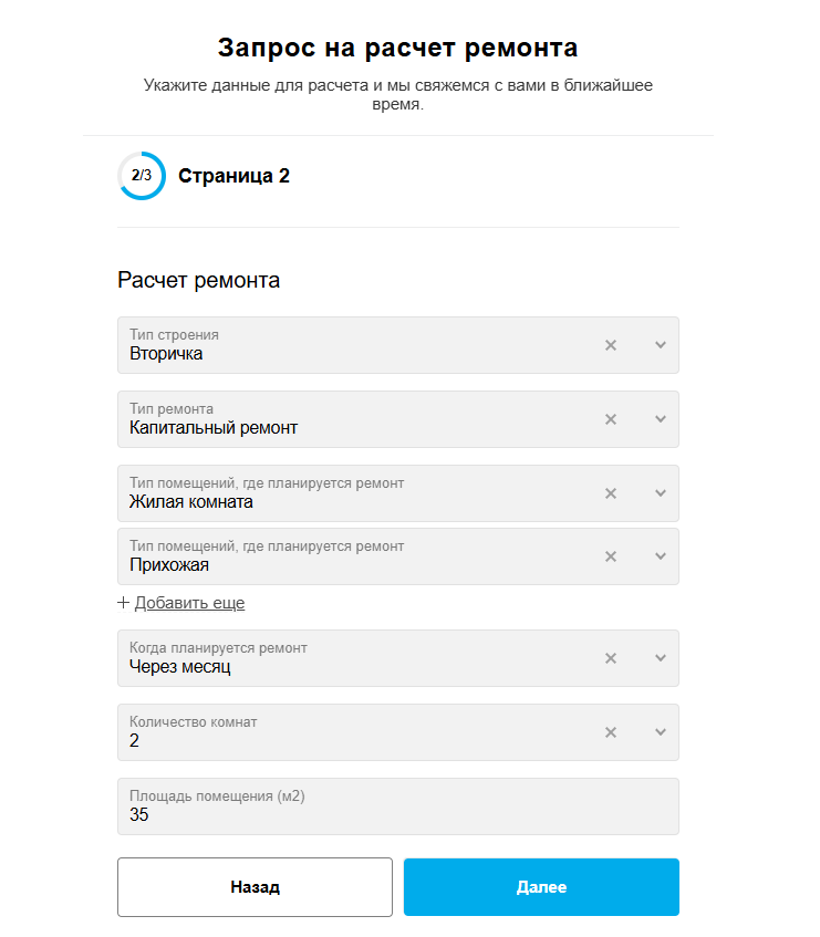 Адрес объекта, Тип строения, Тип ремонта, Количество комнат, Тип помещений, где планируется ремонт, Требуется дизайн проект, Площадь помещения (м2), Когда планируется, Требуется дозакупка материалов, Требуются демонтажные работы, Подъезд, Этаж, Квартира/офис, Домофон, Наличие лифта, Примечание.