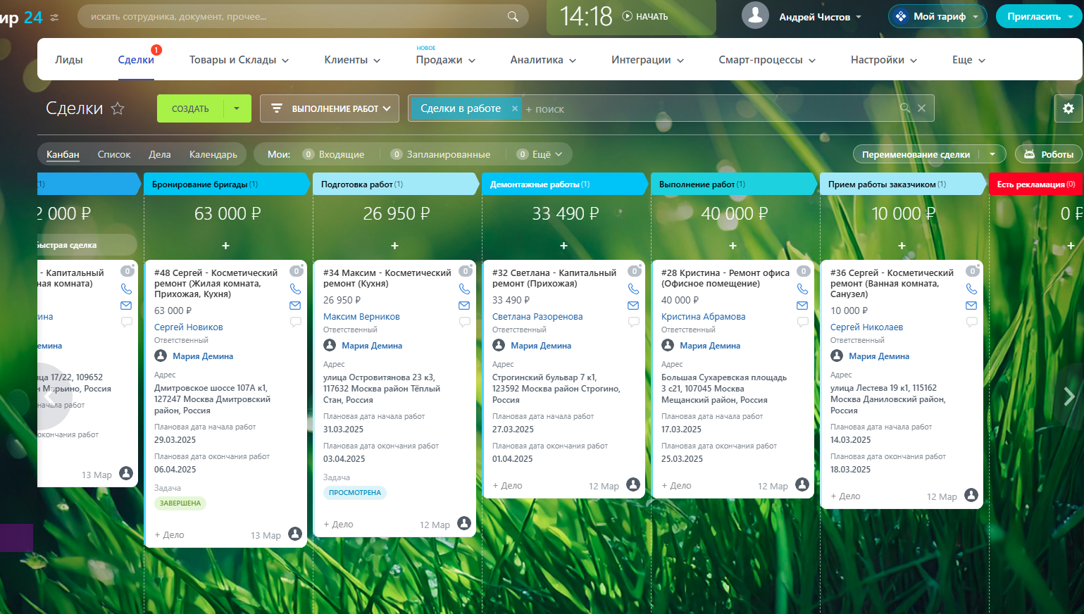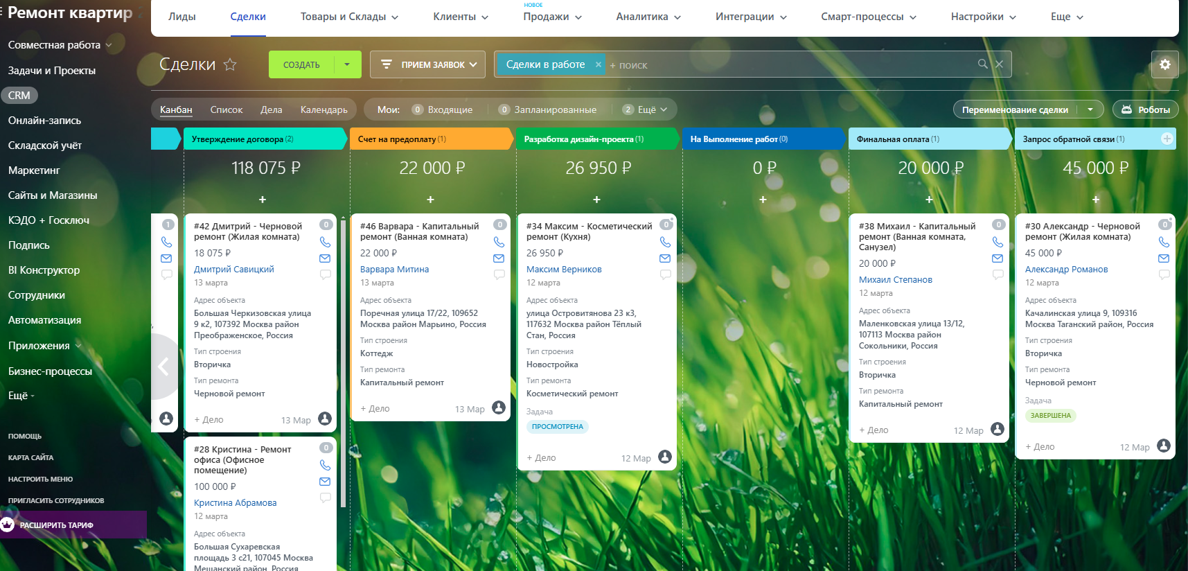Наше специализированное CRM-решение разработано для компаний, занимающихся ремонтом квартир, домов, офисов и коттеджей. Оно помогает эффективно организовать процесс обработки заявок на ремонтные работы и контролировать их выполнение.