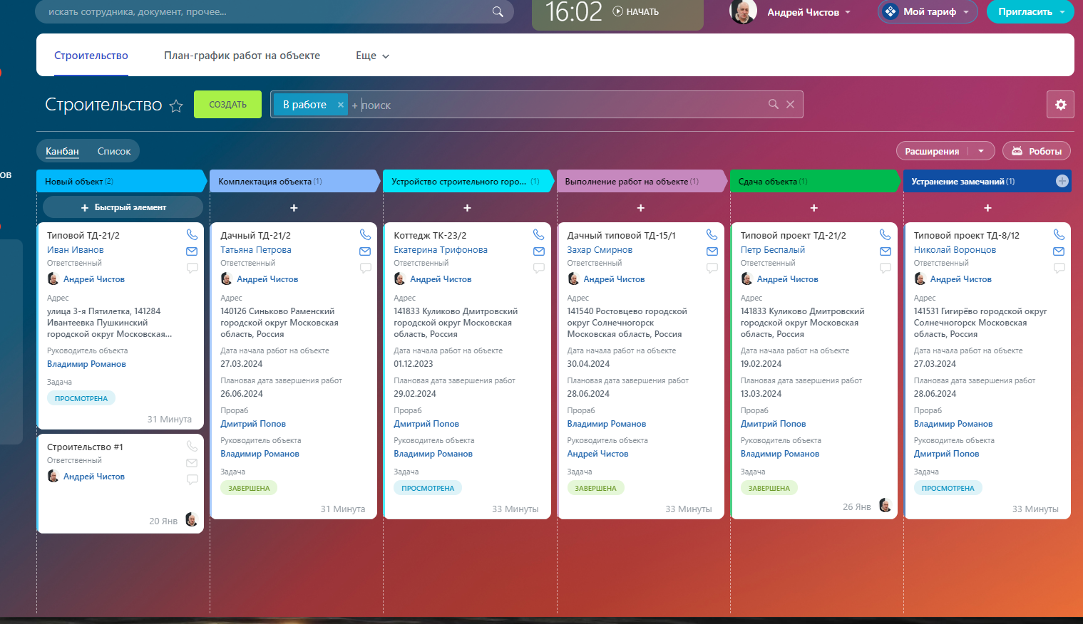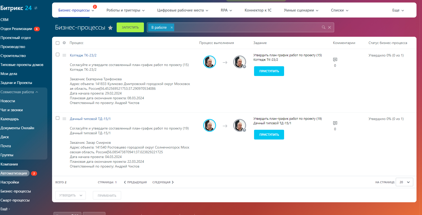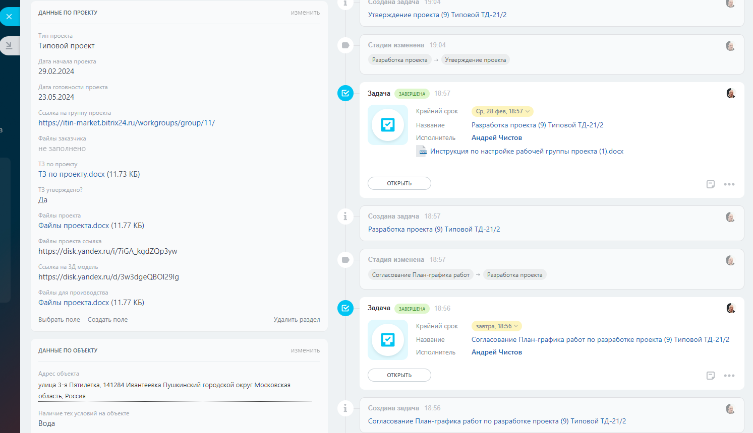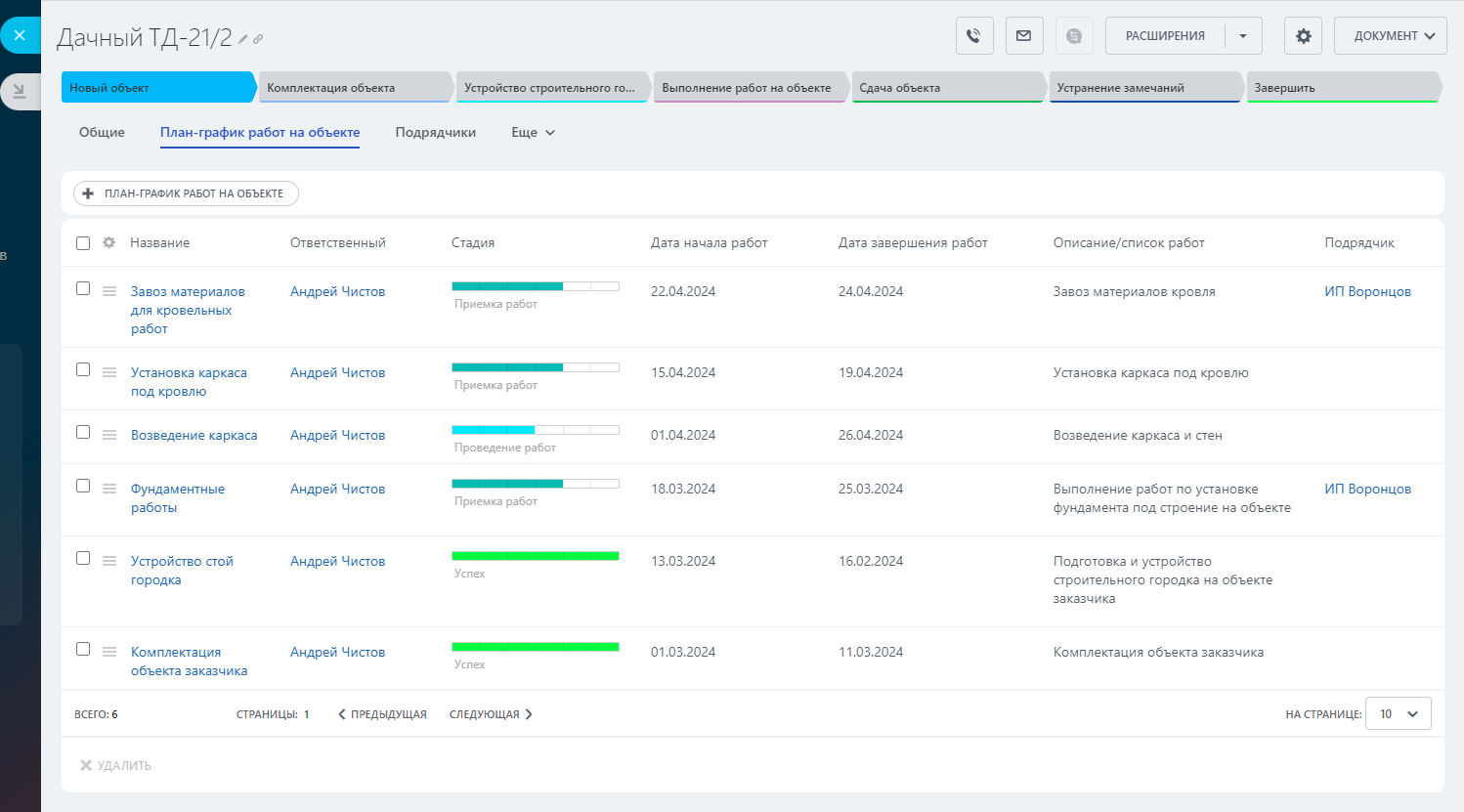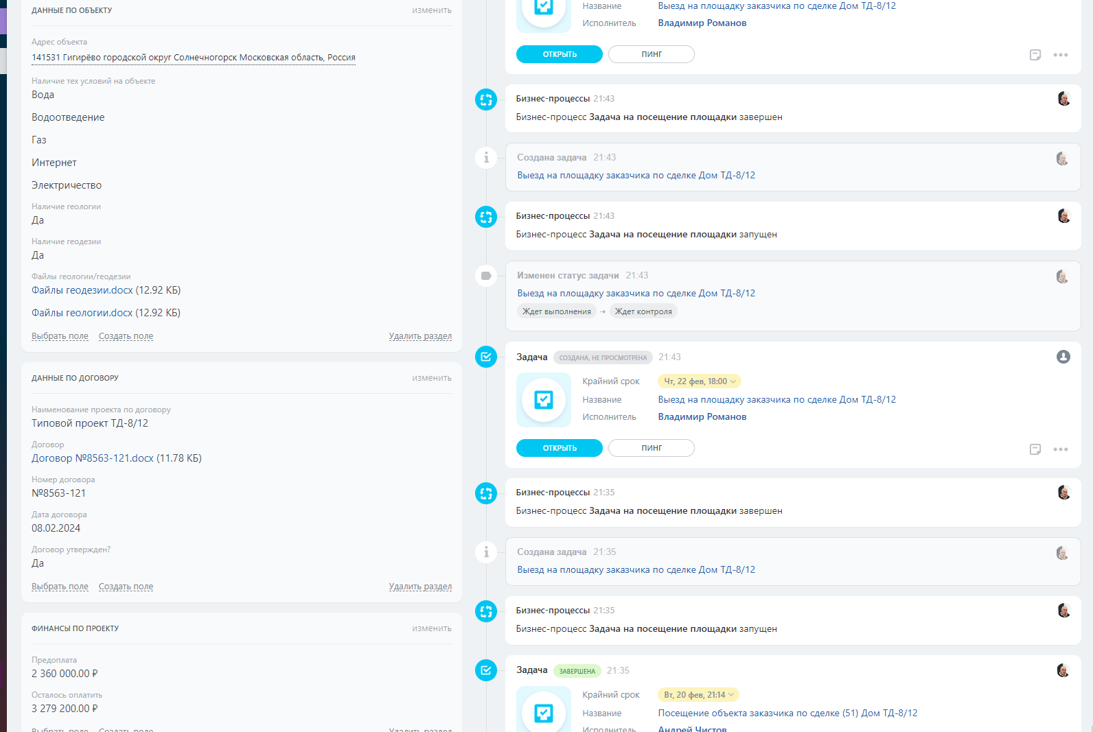 Для выполнения и мониторинга работ по объекту созданы специальные стадии обработки карточки объекта при перемещении на которые происходит автоматическая постановка задач и уведомлений ответственным за выполнение работ на объекте и ведущему менеджеру по проекту заказчика.