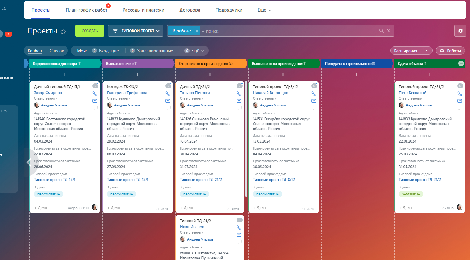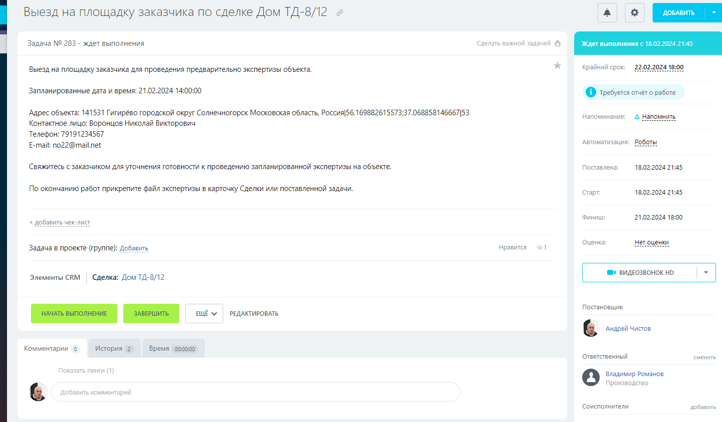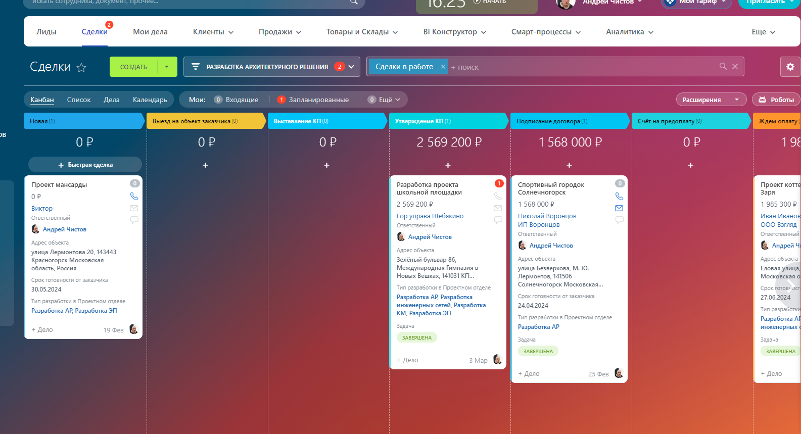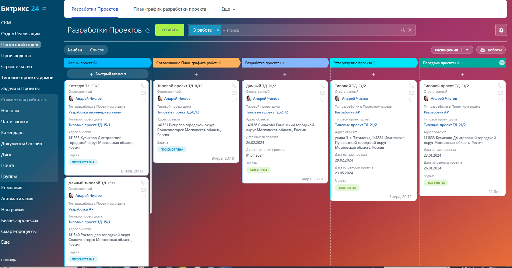 Для выполнения и мониторинга работ по объекту созданы специальные стадии обработки карточки объекта при перемещении на которые происходит автоматическая постановка задач и уведомлений ответственным за выполнение работ на объекте и ведущему менеджеру по проекту заказчика.
