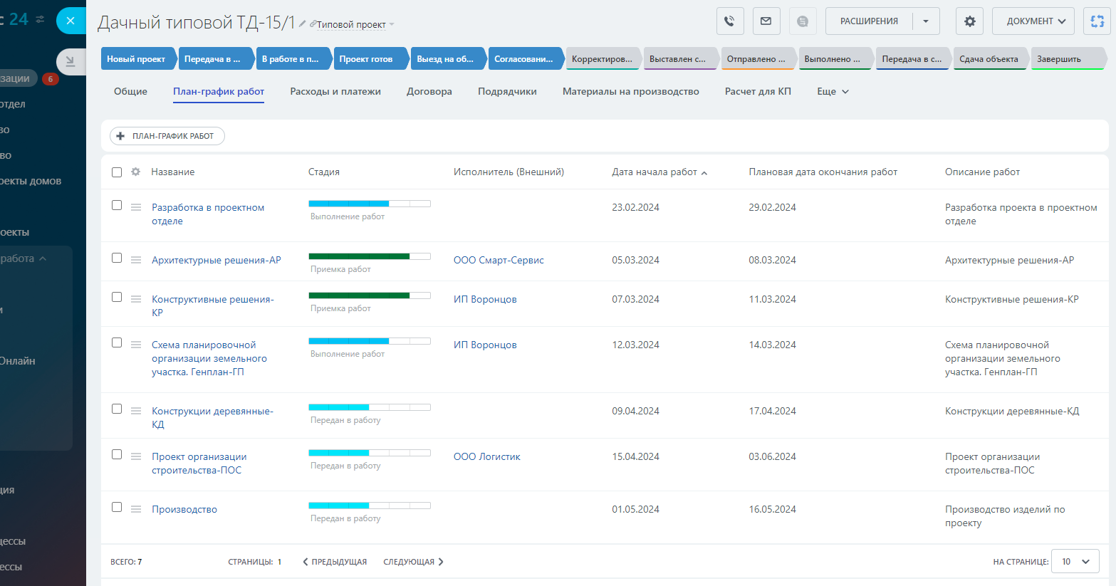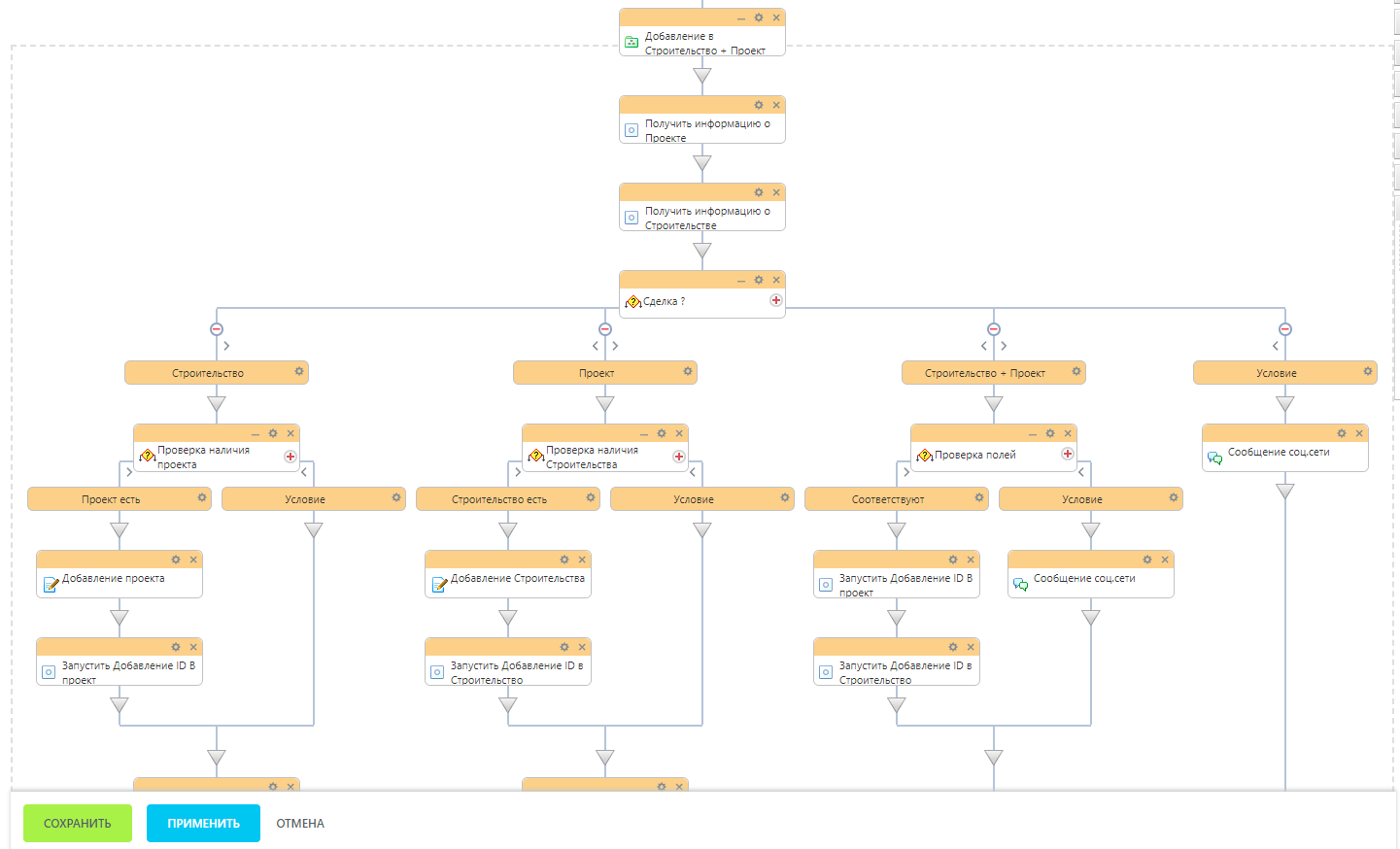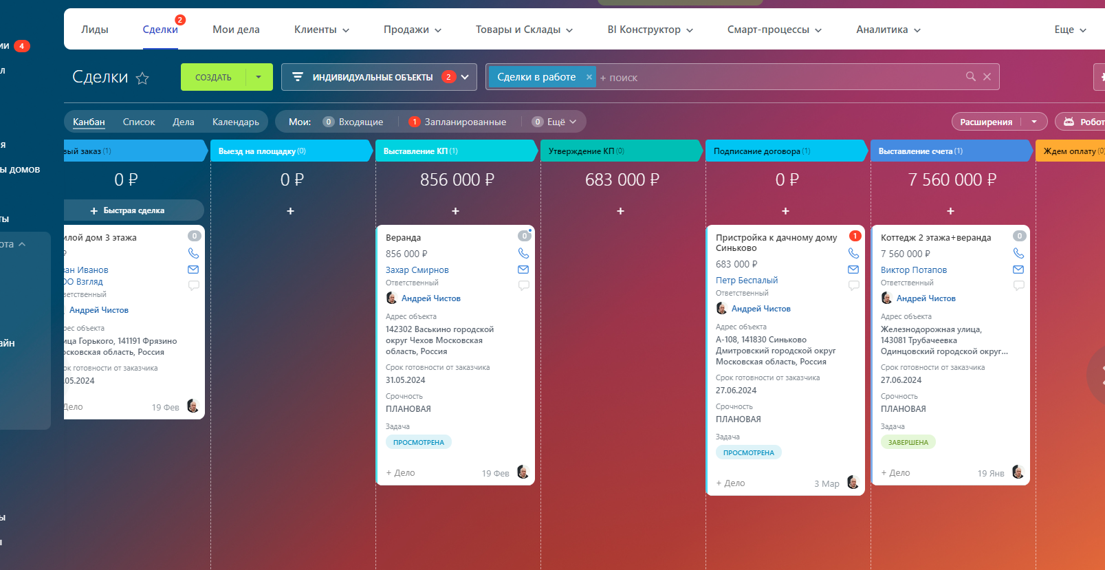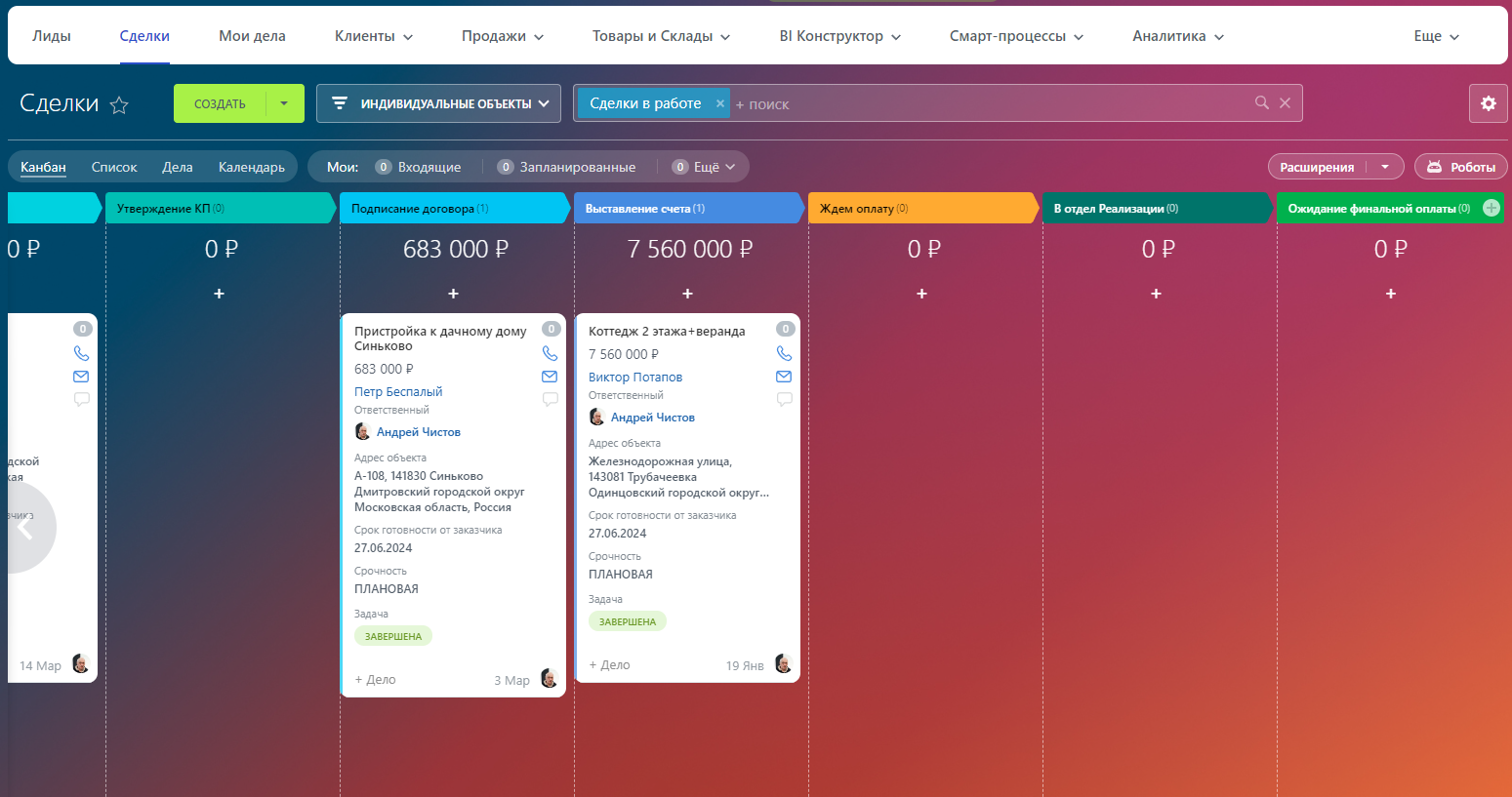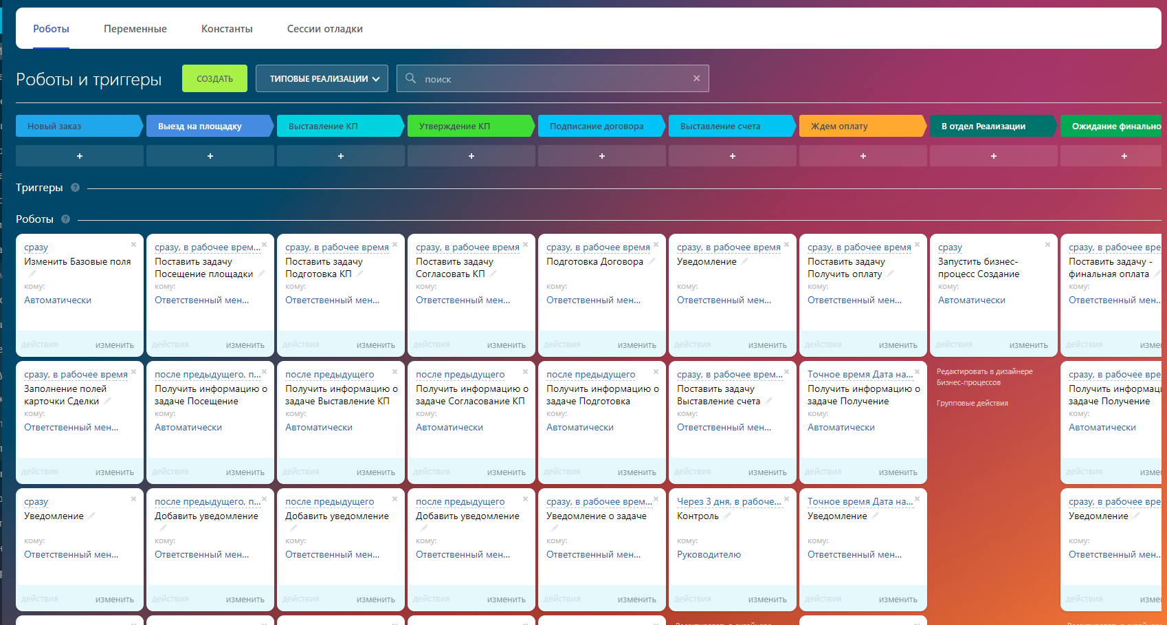 Для выполнения и мониторинга работ по объекту созданы специальные стадии обработки карточки объекта при перемещении на которые происходит автоматическая постановка задач и уведомлений ответственным за выполнение работ на объекте и ведущему менеджеру по проекту заказчика.