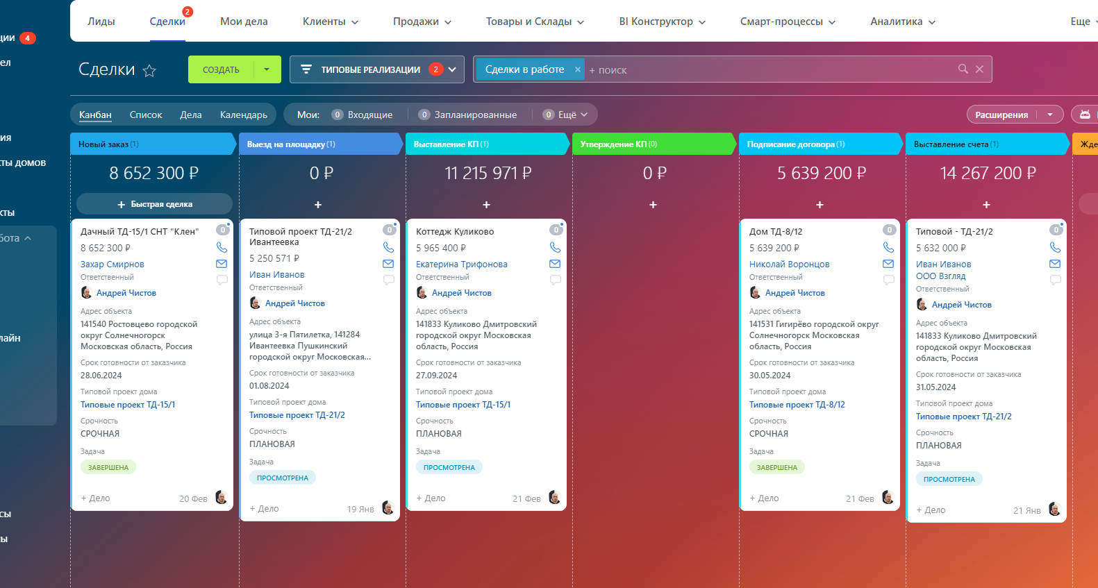Для каждого из направлений продаж компании разработана своя карточка сделки с необходимыми для обработки заказа специализированными полями. Предусмотрена обязательность заполнения ключевых полей сделки при переходе на стадии обработки.