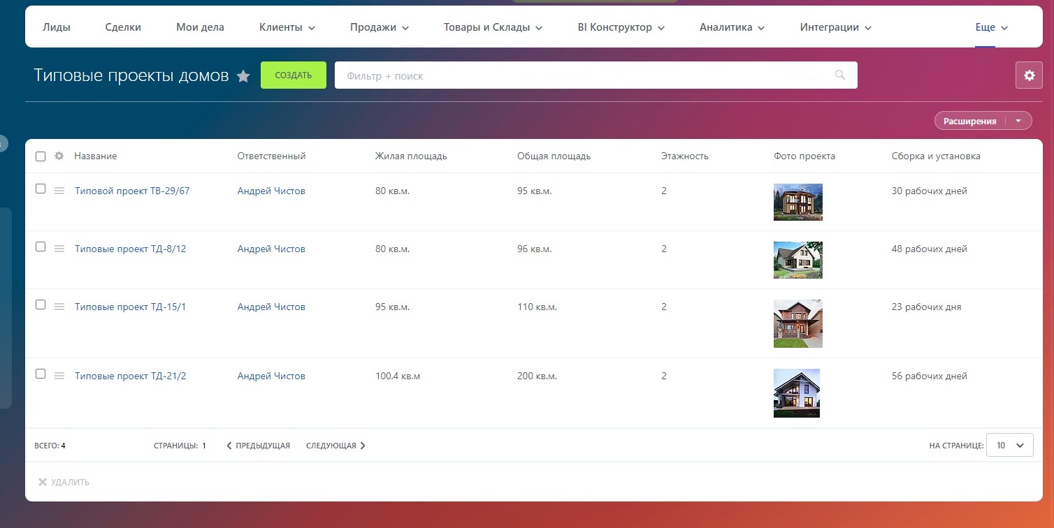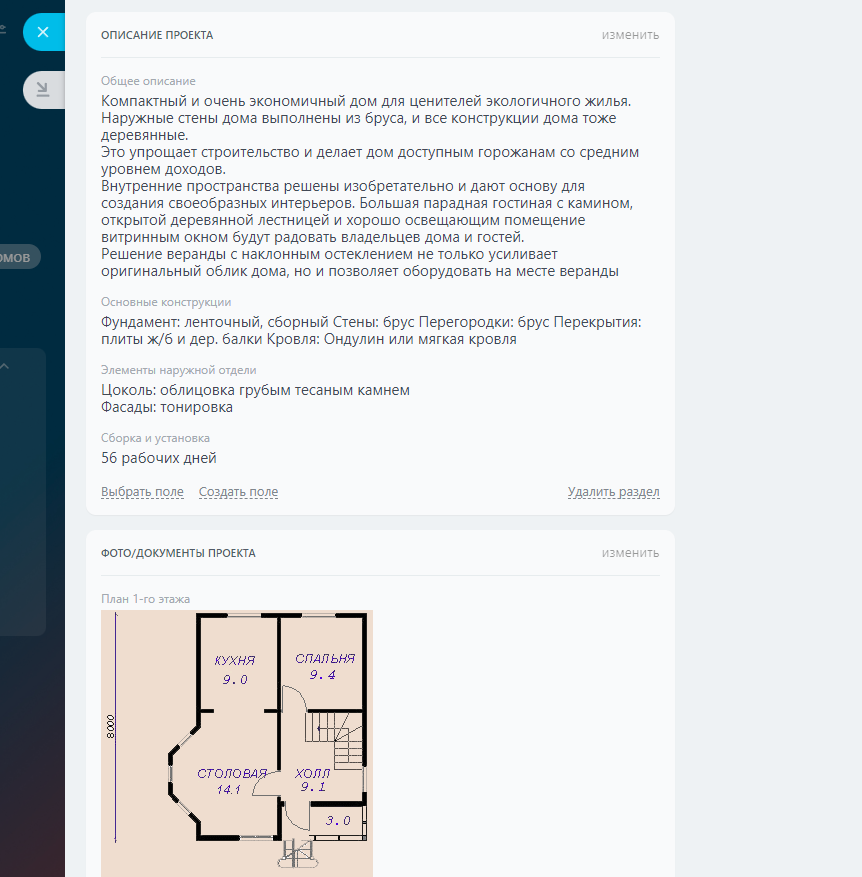 Представляет из себя реестр типовых проектов домов с указанием всех технических характеристик проектов описаний и фотографий выбора типового варианта решения в сделке и возможности отправки данных по выбранному решению заказчику.