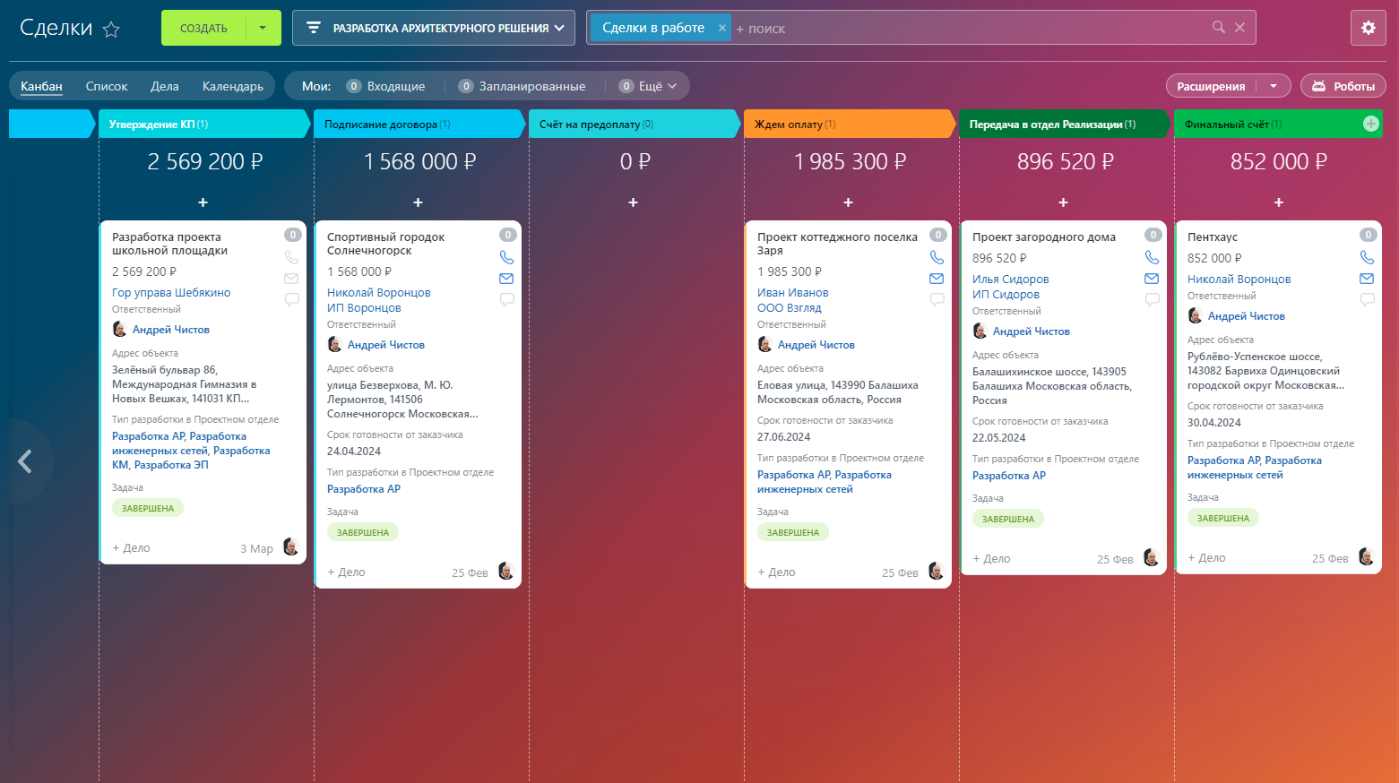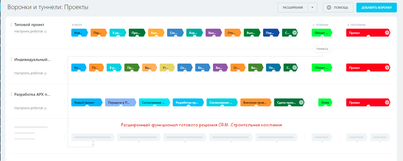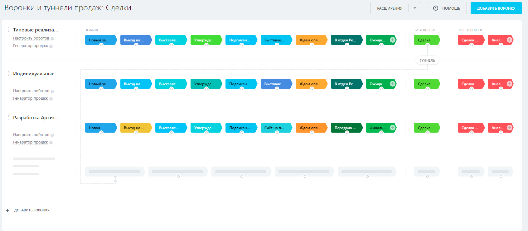 Индивидуальные объекты – обработка поступившего запроса на продажу индивидуального проекта, разработка КП по проекту, заключение договора на разработку и реализацию проекта, получение полной или частичной оплаты работ. Перевод проекта в воронку реализации проекта. Финальной стадией направления является получение полной оплаты разработки и работ по проекту и при необходимости получение обратной связи по работам.