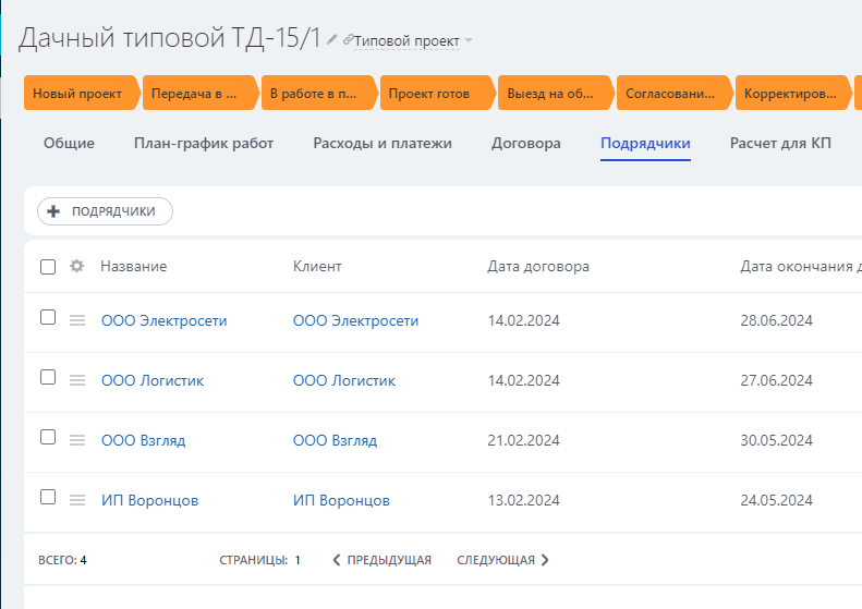 Для обеспечения дополнительного функционала в карточке проекта предусмотрены так же следующие возможности: ведение реестра договоров по проекту и ведение реестра внешних подрядчиков для выполнения договорных работ по проекту или на объекте заказчика.
