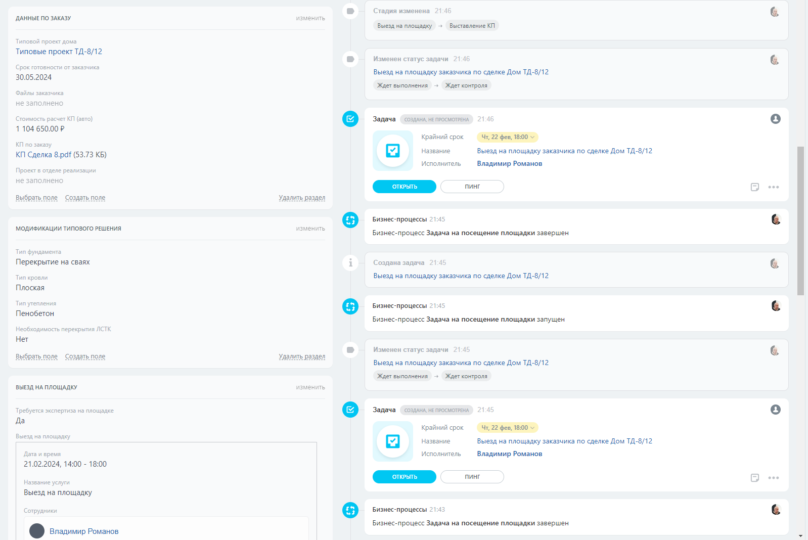 Для работы с карточкой заказа, кроме базовый полей, созданы специальные пользовательский поля для заполнения данных по объекту и характеристикам заказа клиента такие как: Наименование проекта по договору, Наличие геодезии, Наличие геологии, Наличие тех условий на объекте, Необходимость перекрытия ЛСТК, Тип кровли, Тип строения, Тип утепления, Тип фундамента, Типовой проект дома, Толщина стен, Файлы геологии/геодезии, Этажность, Контактное лицо со стороны заказчика, КП по заказу, Требуется экспертиза на площадке и т.д.