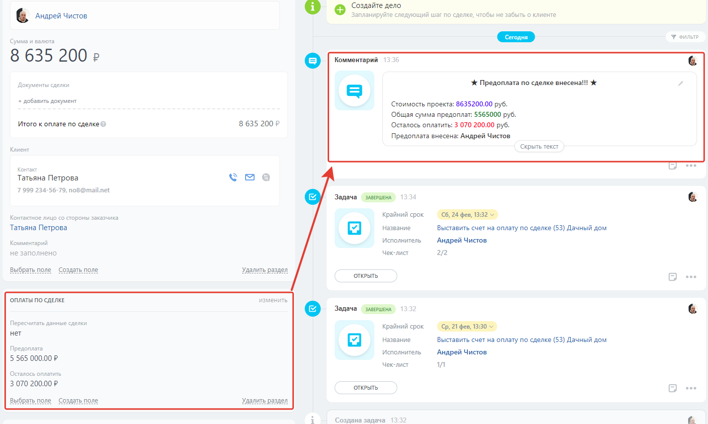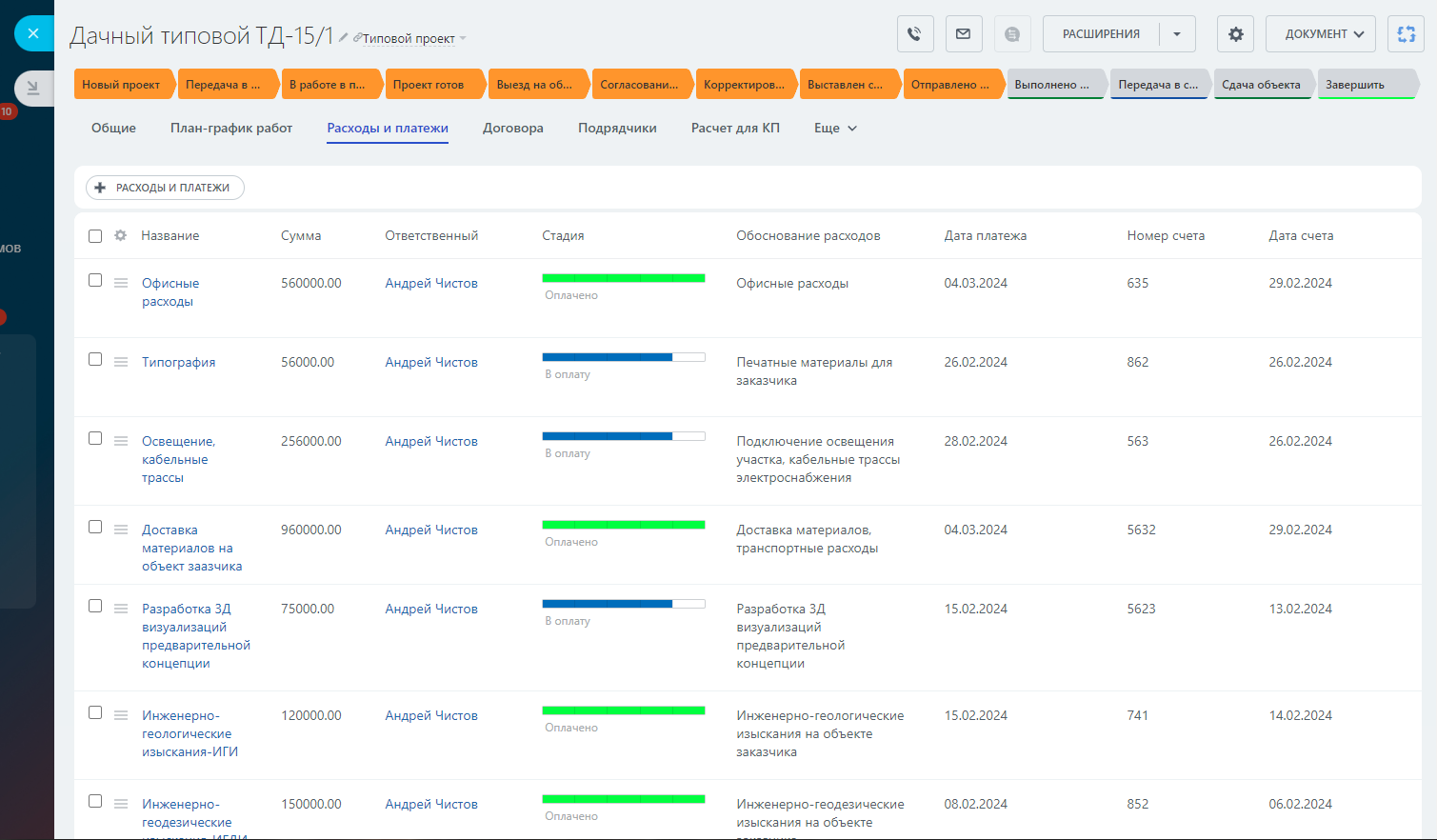 - Фиксировать и вести расходы по проектам непосредственно в карточке проекта