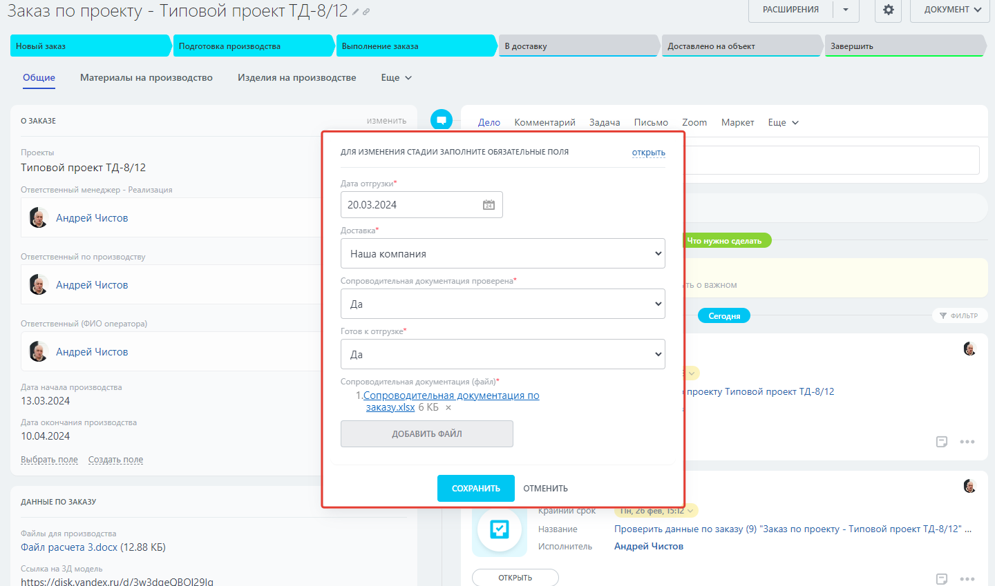 После окончания производства заказа и перехода его на стадию доставки исходная карточка проекта в отделе реализации автоматически перемещается на стадию Выполнено на производстве с уведомлением ответственного менеджера по данному проекту.
