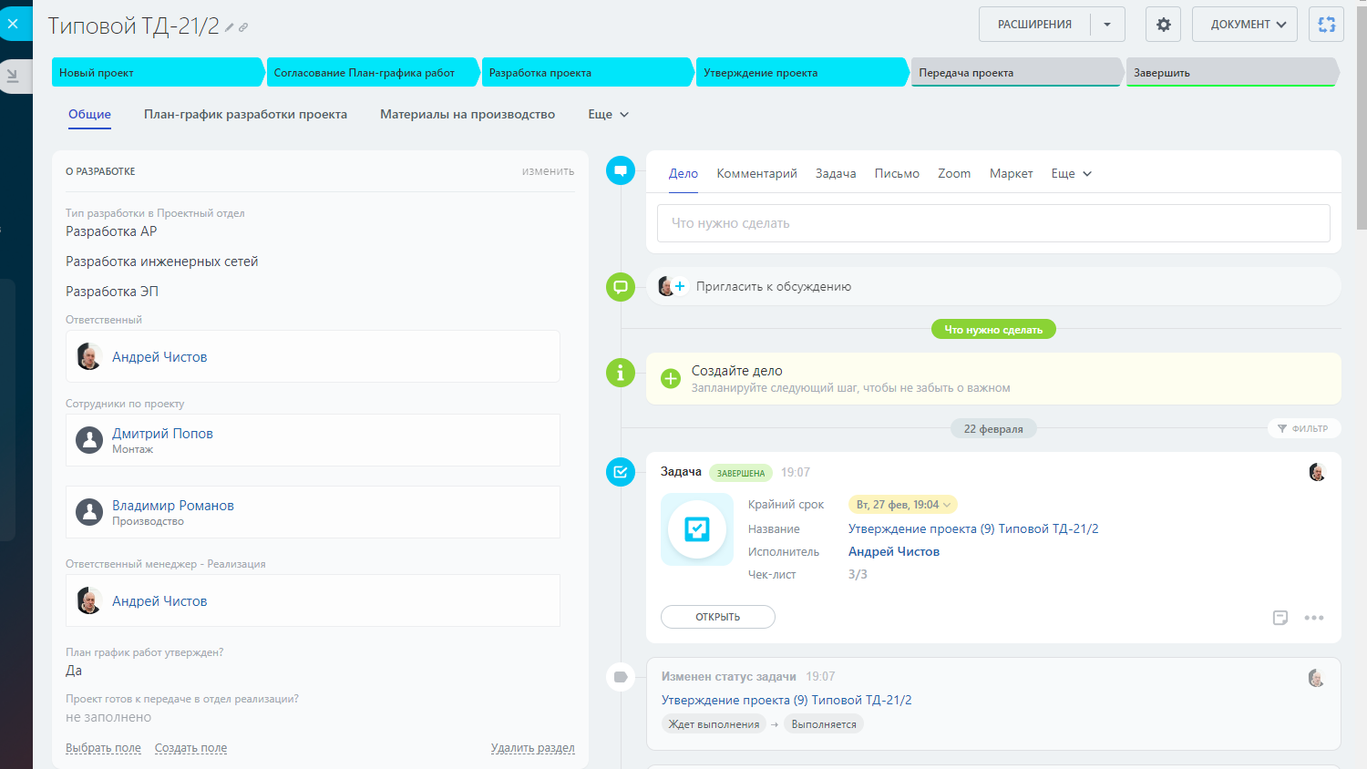 По завершению разработки в Проектном отделе исходная карточка проекта автоматически перемещается на стадию «Проект готов» и данные разработки передаются в карточку проекта с уведомлением ответственного по проекту об окончании разработки.