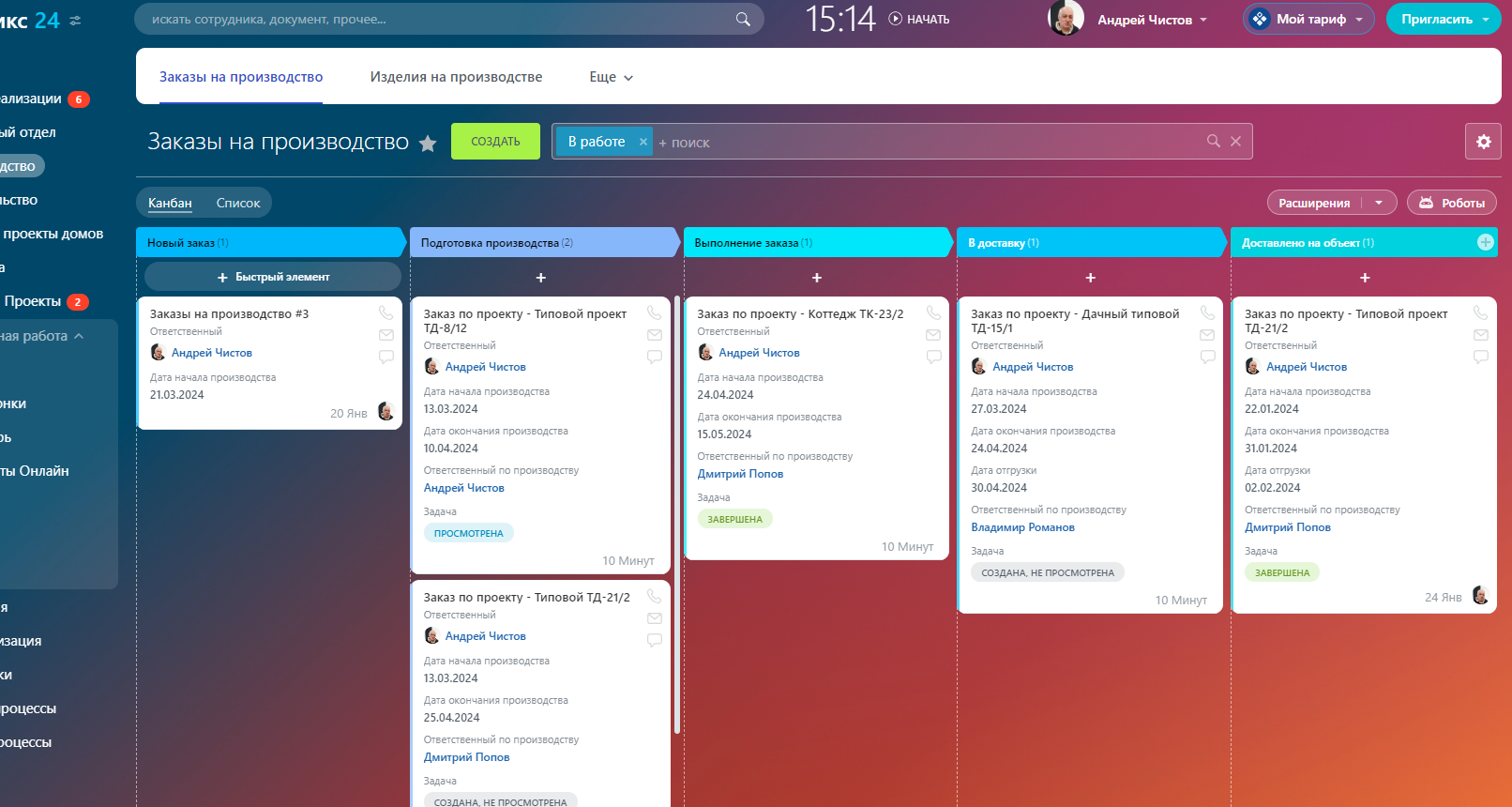 Заказ на производство создается автоматически при перемещении проекта в отделе реализации на стадию Передано в производство.