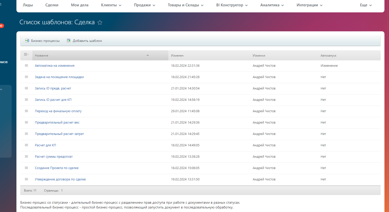 В CRM настроен ряд дополнительных смарт-процессов, обеспечивающих дополнительный функционал системы и не задействованных напрямую в автоматизированных рабочих местах.