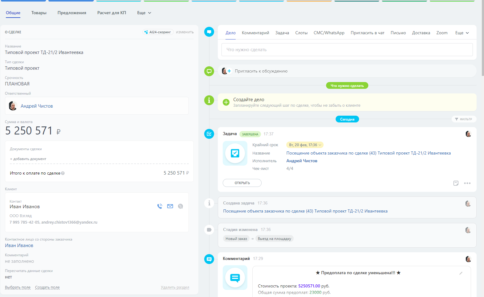 В связи со спецификой текущего отраслевого решения предусмотрено подключение в карточку сделки отдельного функционала по расчету коммерческого предложения по проекту заказчика. При переводе сделки в отдел реализации (создание проекта в отделе реализации) данные расчета КП автоматически прикрепляются к созданному проекту (Доступно только начиная с тарифа Профессиональный).