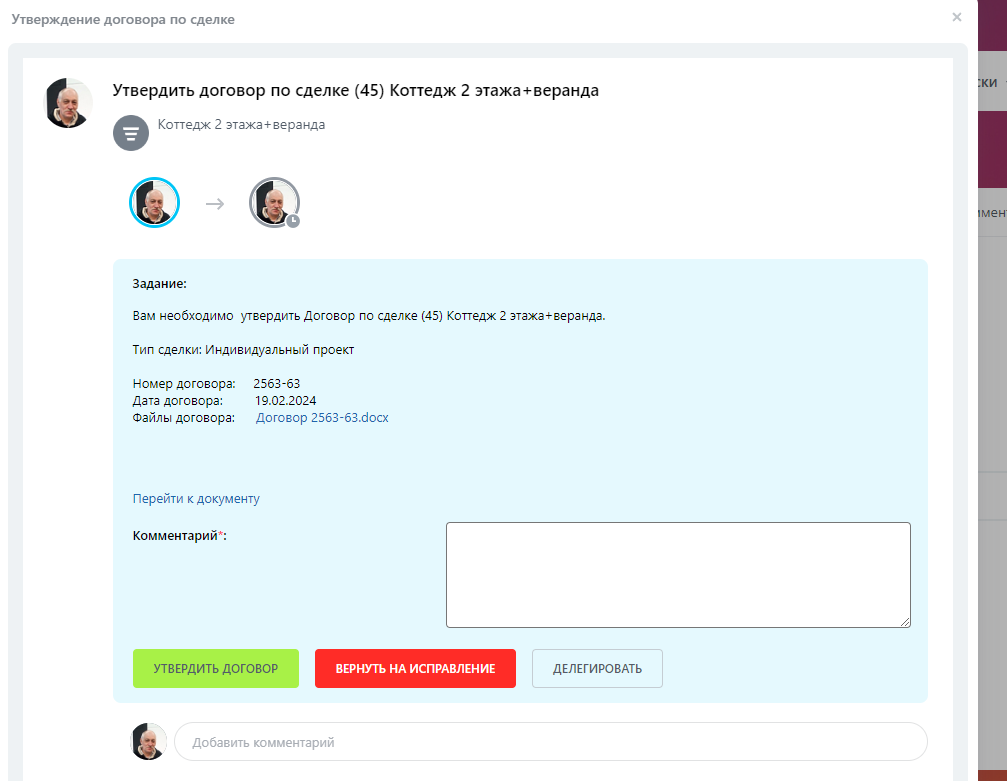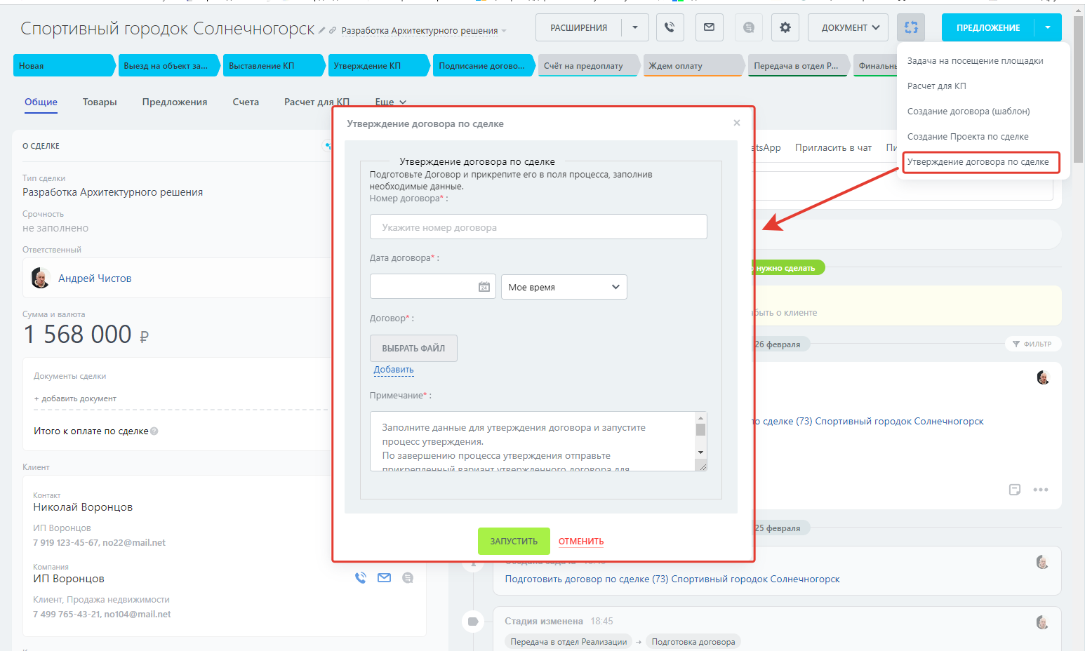 Для утверждения необходимых документов по сделкам (договора, коммерческие предложения) разработаны бизнес-процессы утверждения с возможностью запуска их на соответствующих стадиях обработки сделки (Доступно только начиная с тарифа Профессиональный).