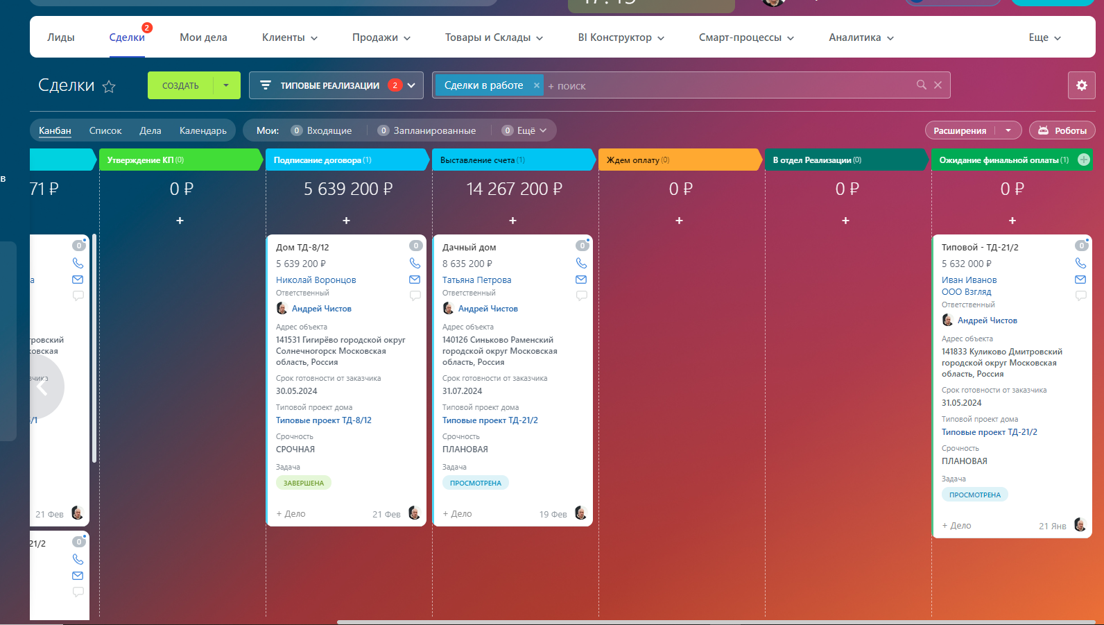 Типовые реализации – обработка поступившего запроса на продажу типового проекта, разработка КП по проекту, заключение договора на разработку и реализацию проекта, получение полной или частичной оплаты работ. Перевод проекта в воронку реализации проекта. Финальной стадией направления является получение полной оплаты разработки и работ по проекту и при необходимости получение обратной связи по работам.