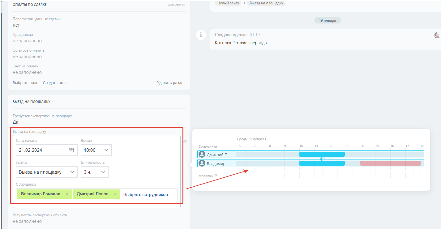 При перемещении карточки проекта на стадию «Передача в строительство» автоматически создается объект строительства по проекту заказчика с постановкой задачи о назначении ответственных (руководитель объекта, прораб и т. д.) за выполнение работ на объекте заказчика.