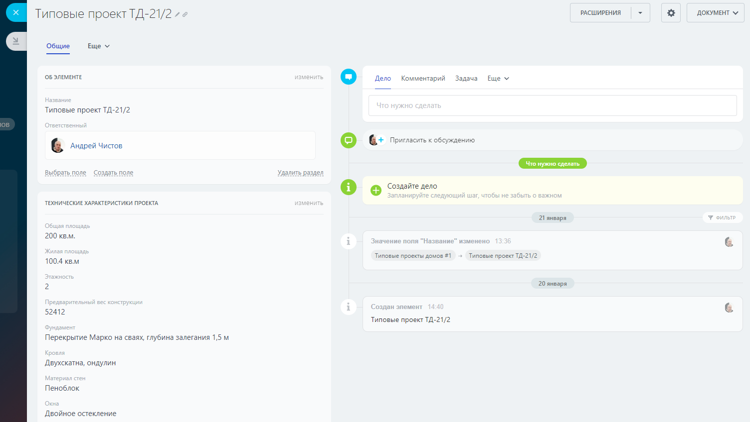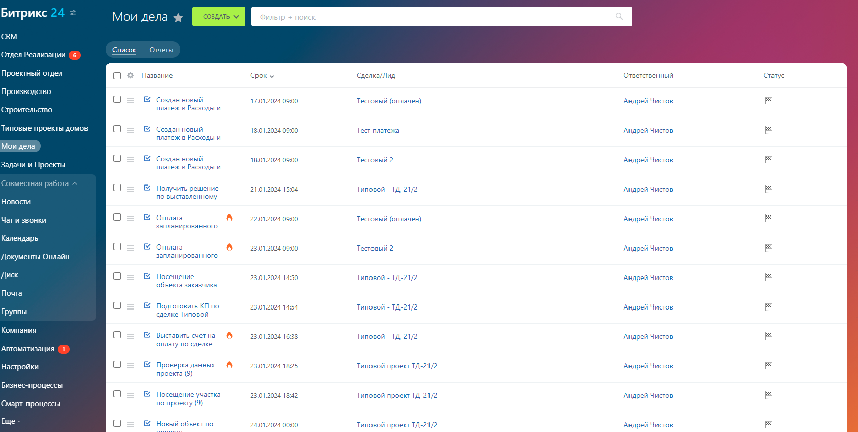 Предназначено для ведения контроля реализации проекта по сделке. При переходе сделки в стадию «Передачи в отдел Реализации» в соответствующем направлении обработки создается карточка проекта с автоматическим получением необходимых данных из сделки.
