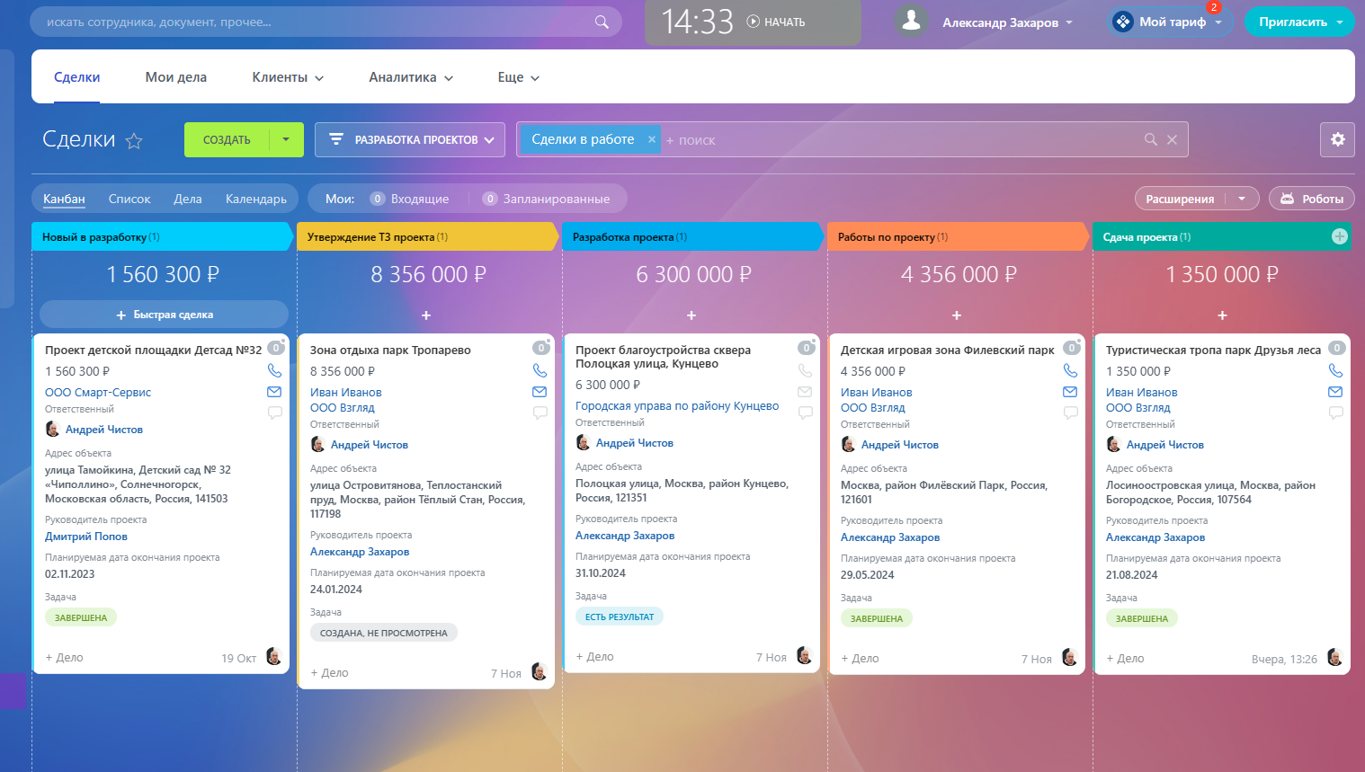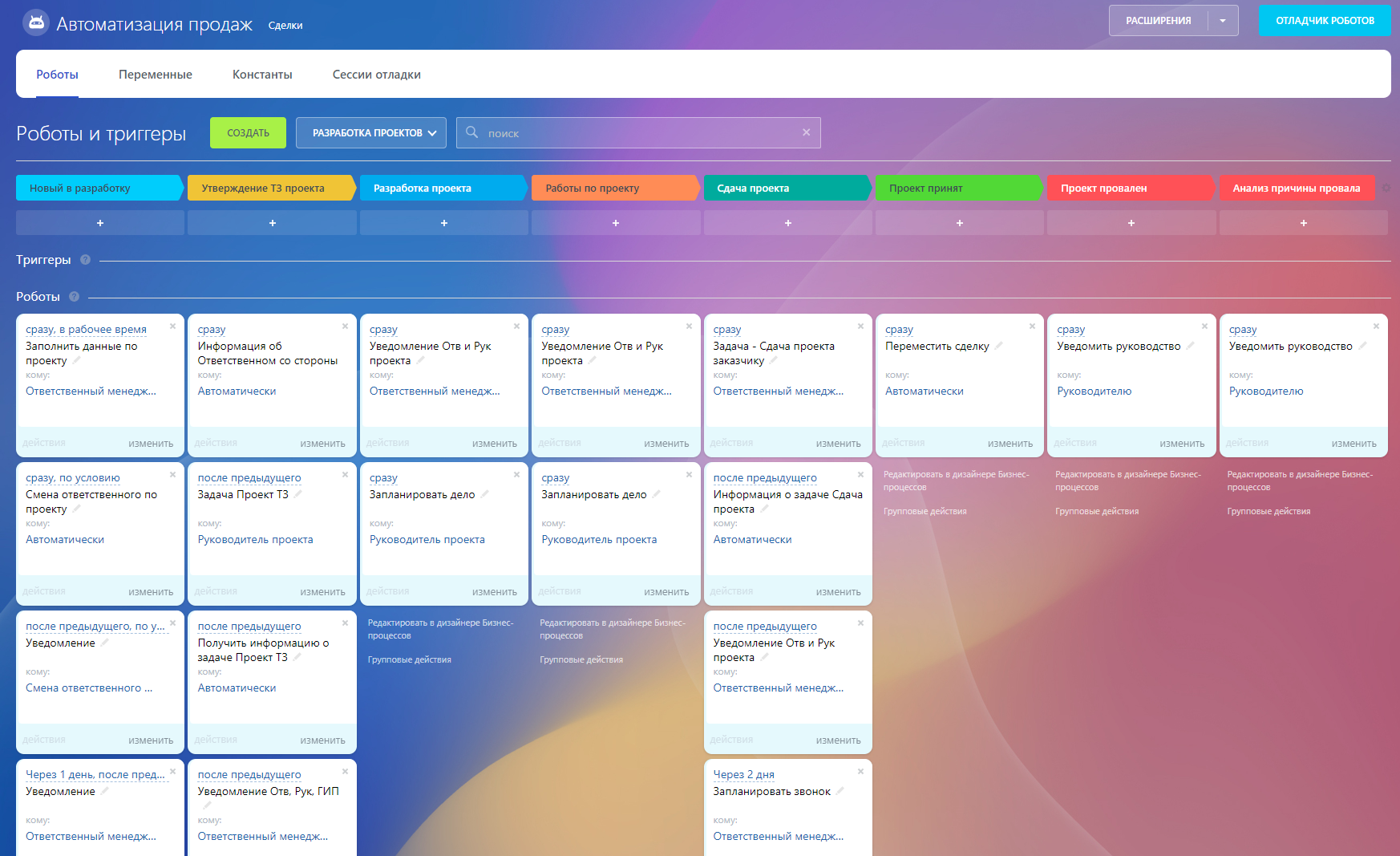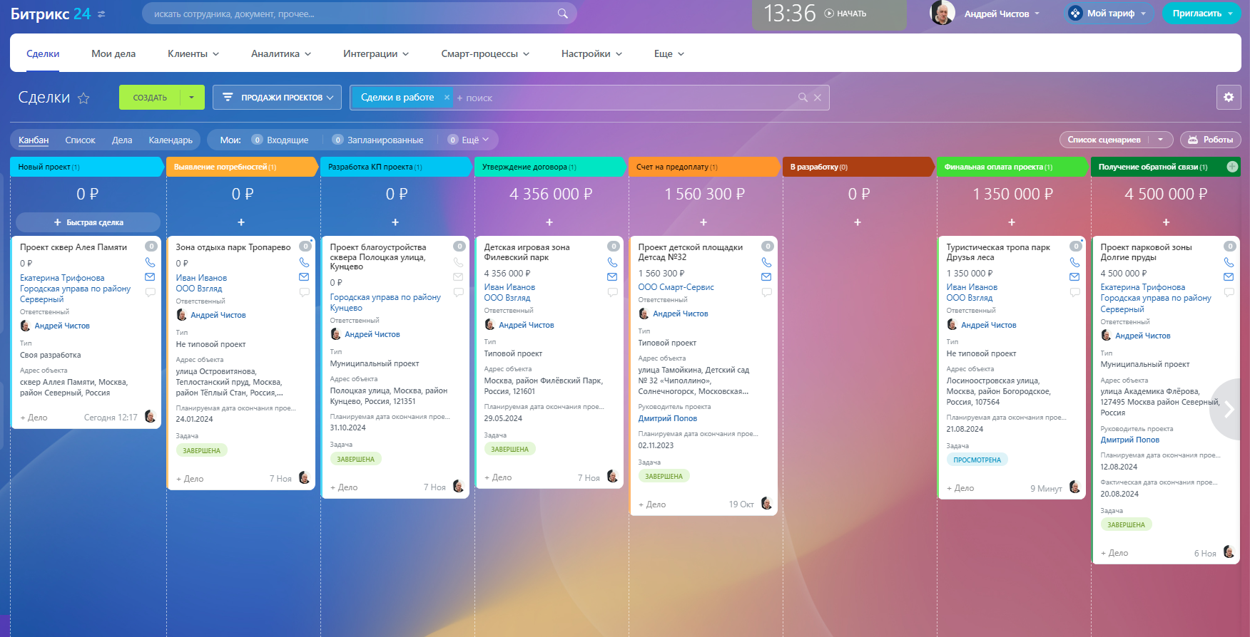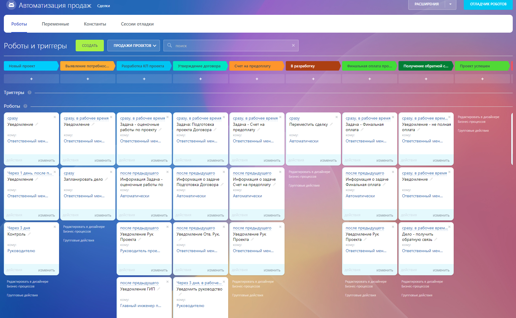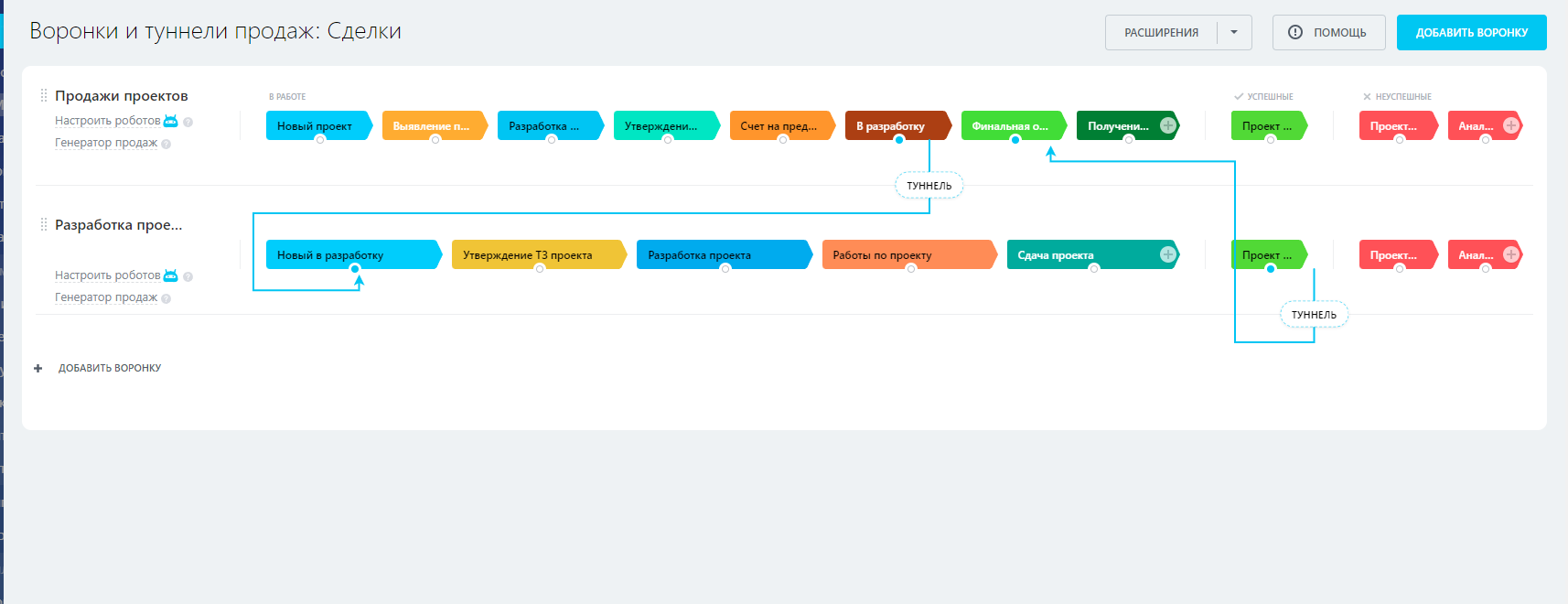 В CRM настроены туннели продаж для автоматического перехода проектов/сделок между воронками.