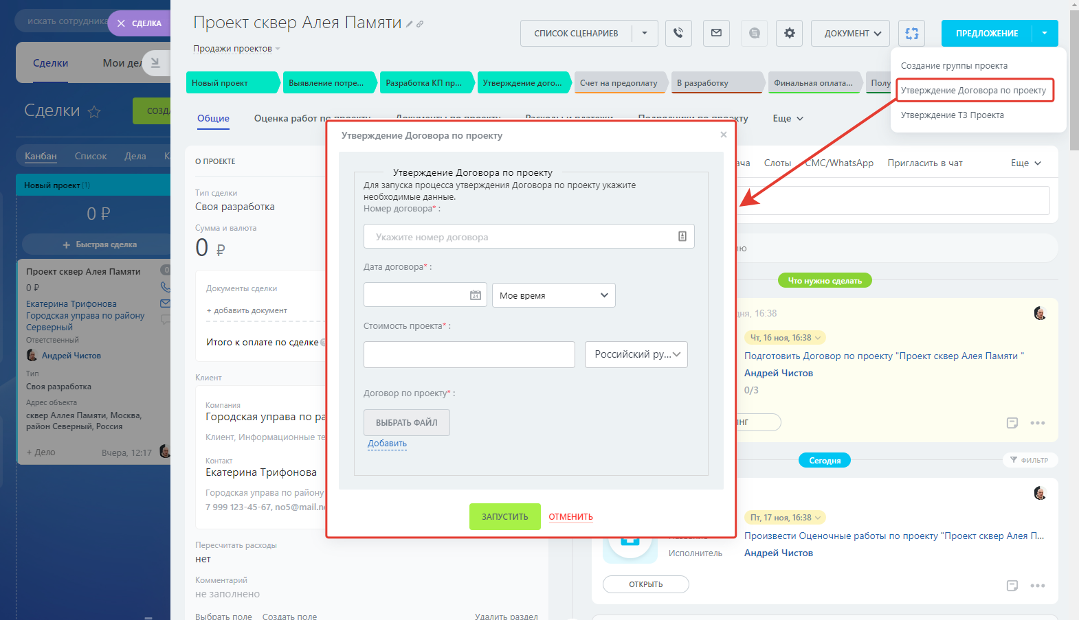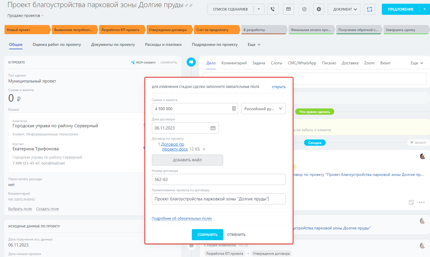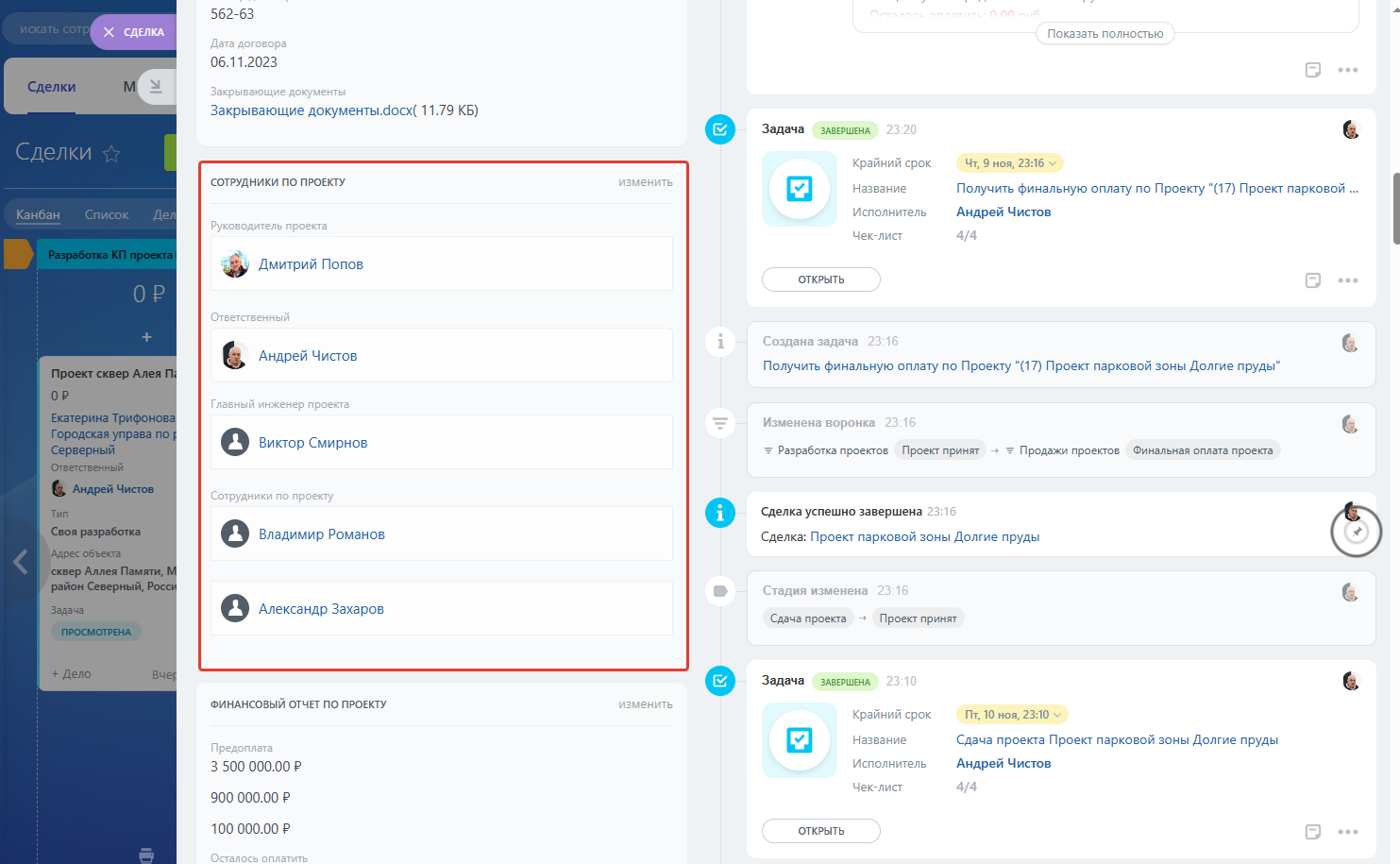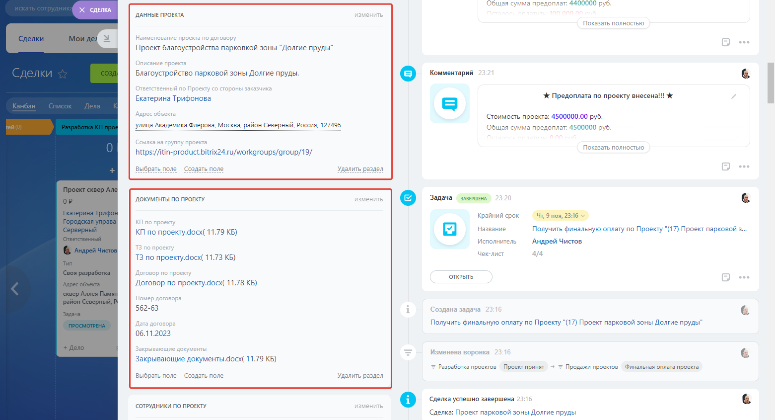 Для работы с проектами предусмотрены следующие пользовательские поля и разделы в карточке проекта/сделки: