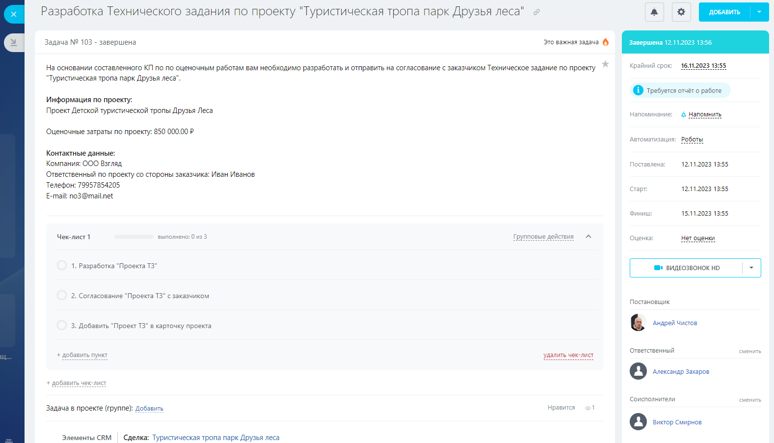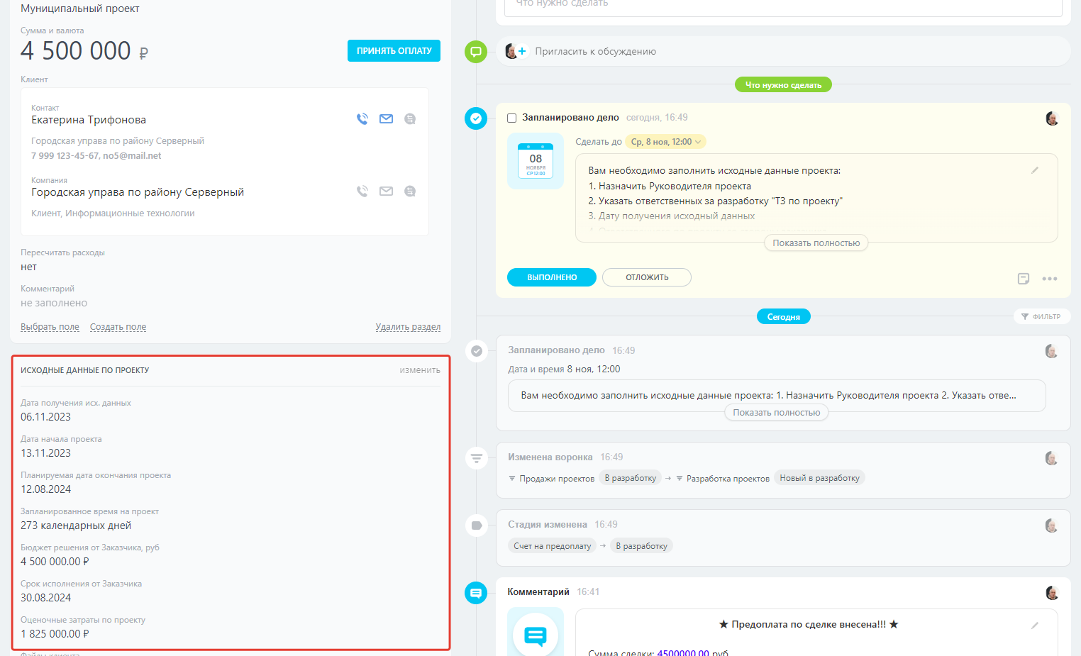 - Клиент – Контакт или компания, заказчик разработки проекта