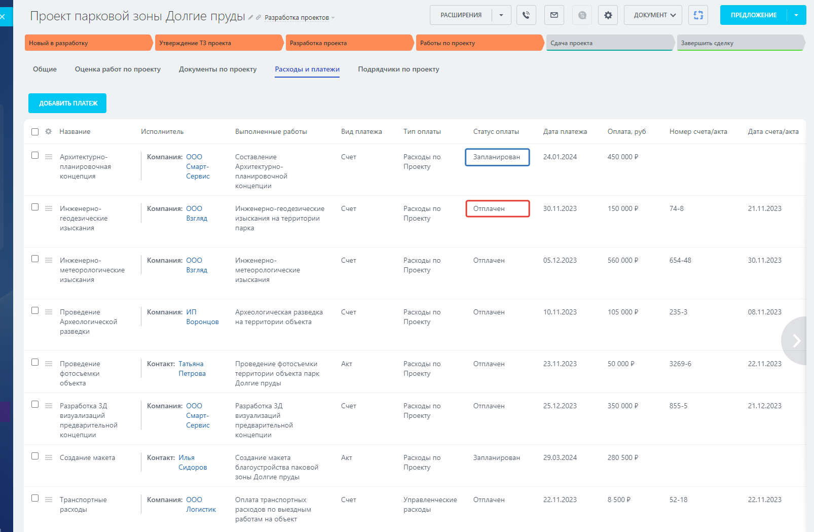 - Расходы и платежи – Список расходов и платежей по проекту. Проведенные и запланированные платежи по расходам на проект.